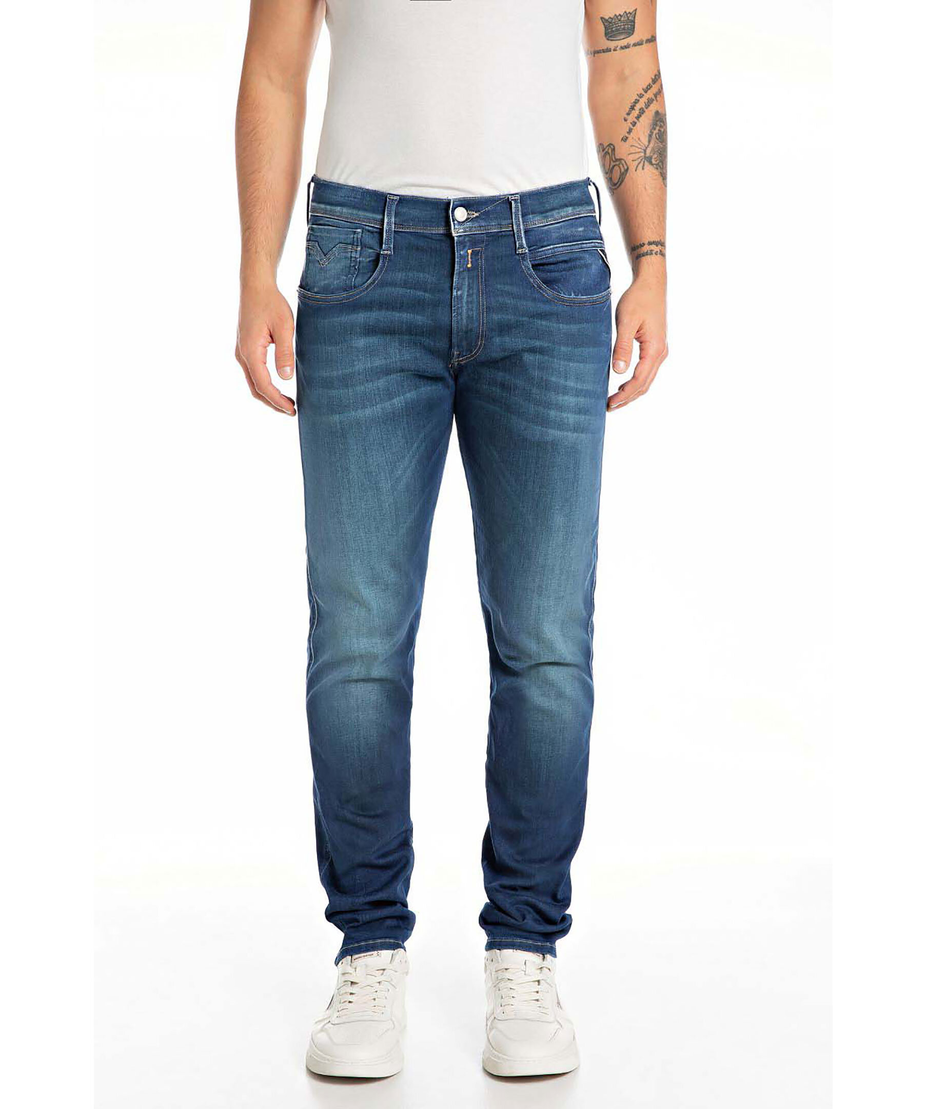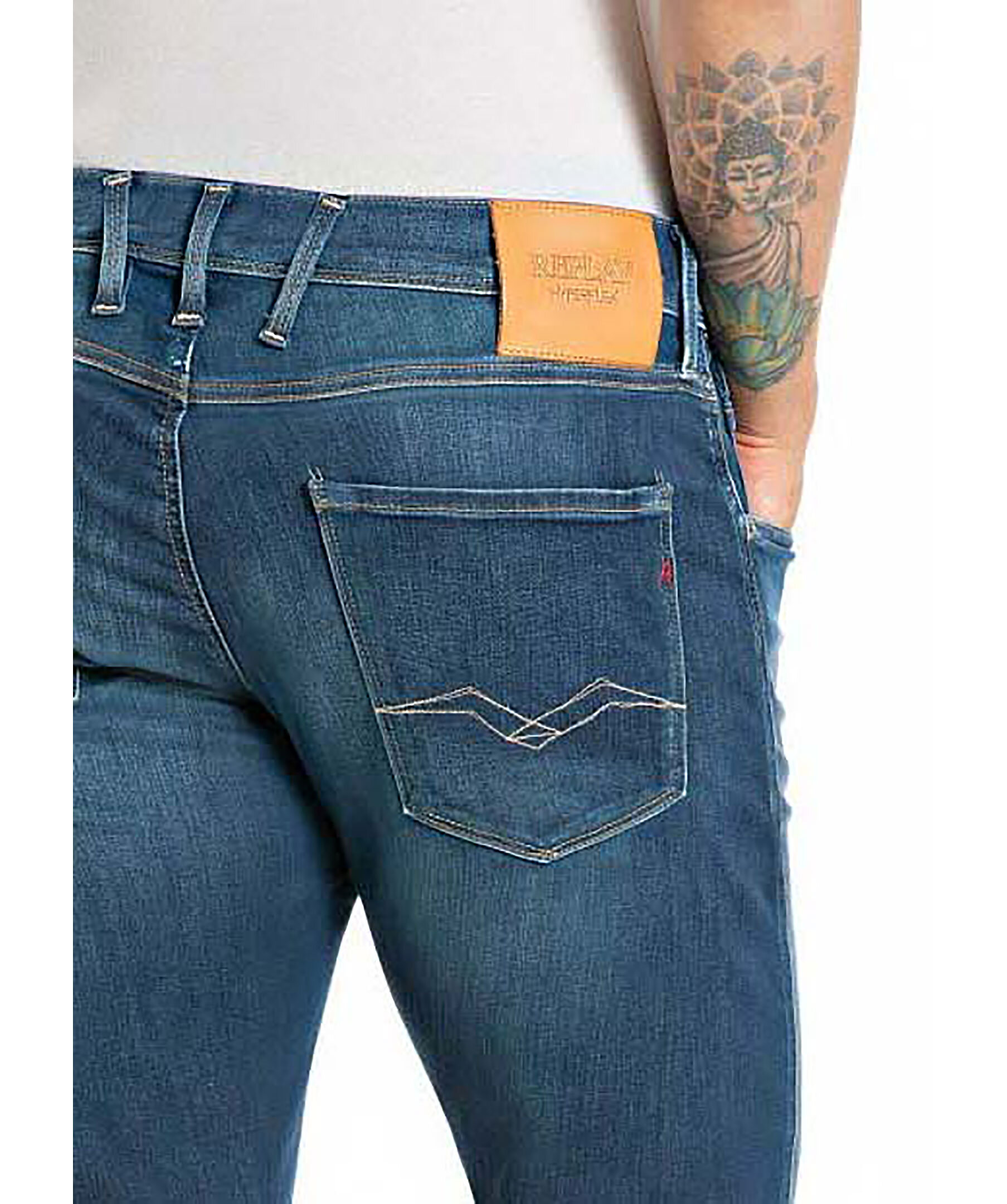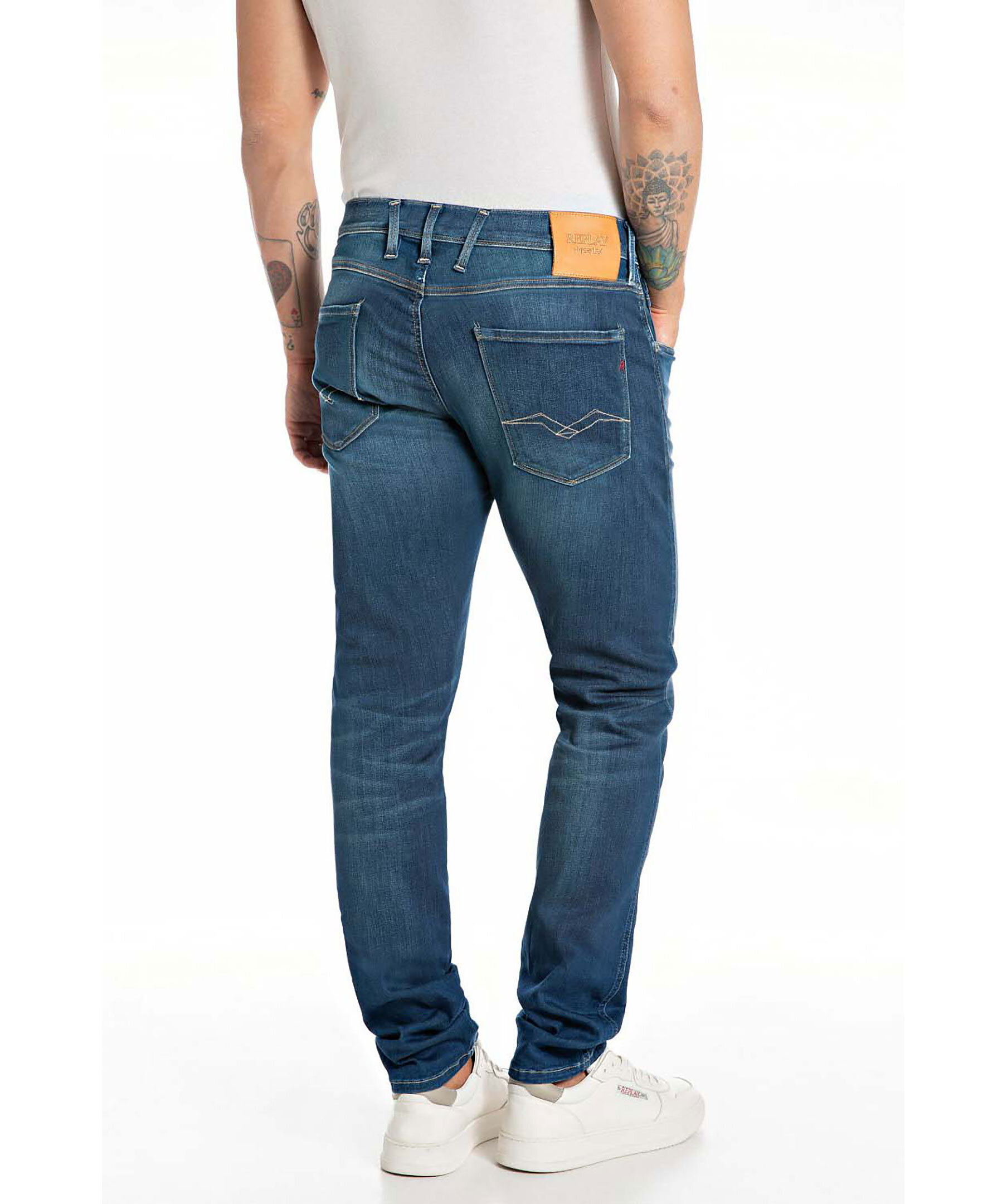 Blåa jeans från Replay. Jeansen har en normalhög midja med bälteshällor, fem fickor, triangelformad REPLAY-etikett på vänster ficka, mynt ficka och bakfickor med ikoniska replay-sömmar. Läder etikett på linningen samt litet rött broderat R på höger bakficka. Tillverkad i en bomullsblandning.