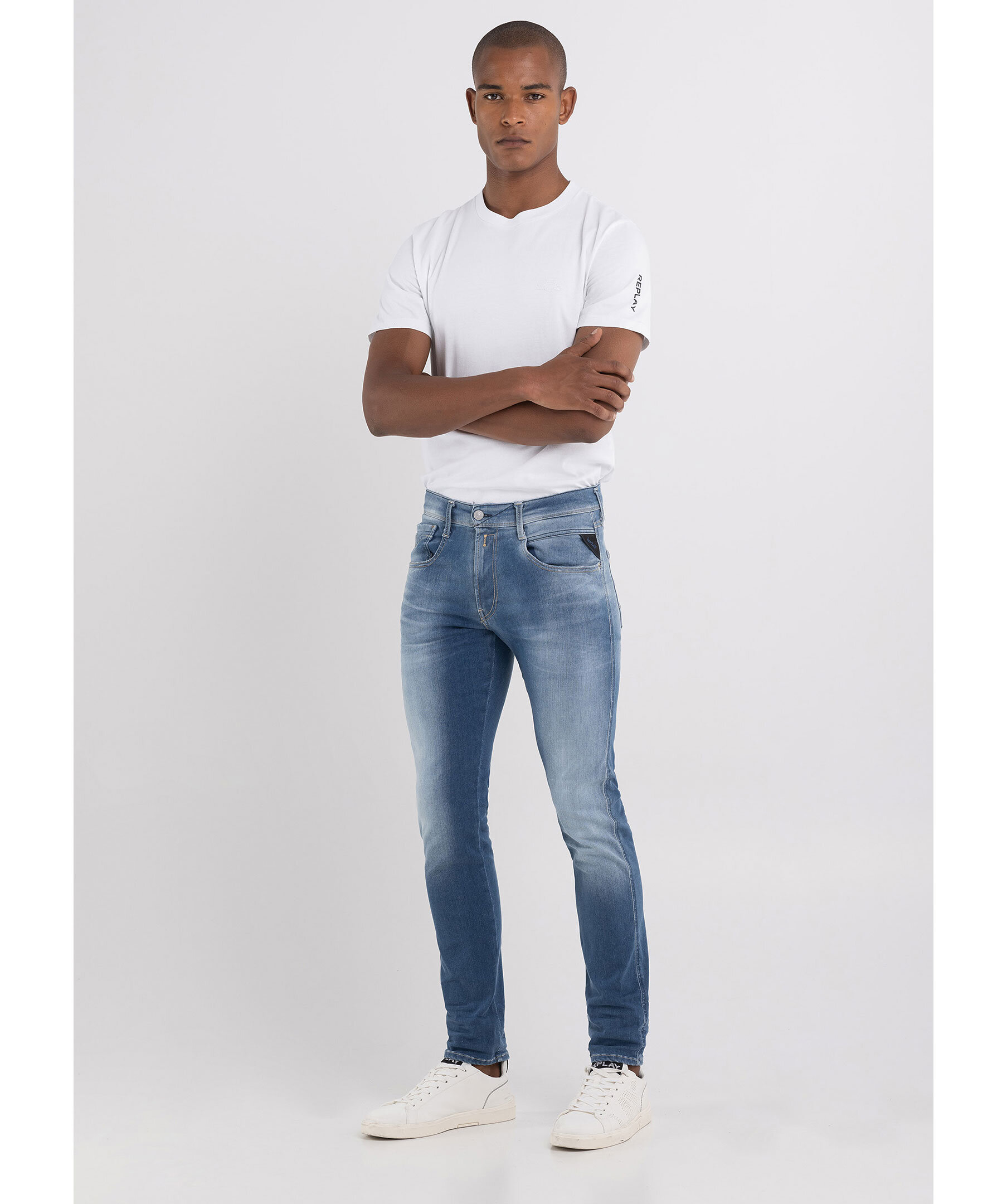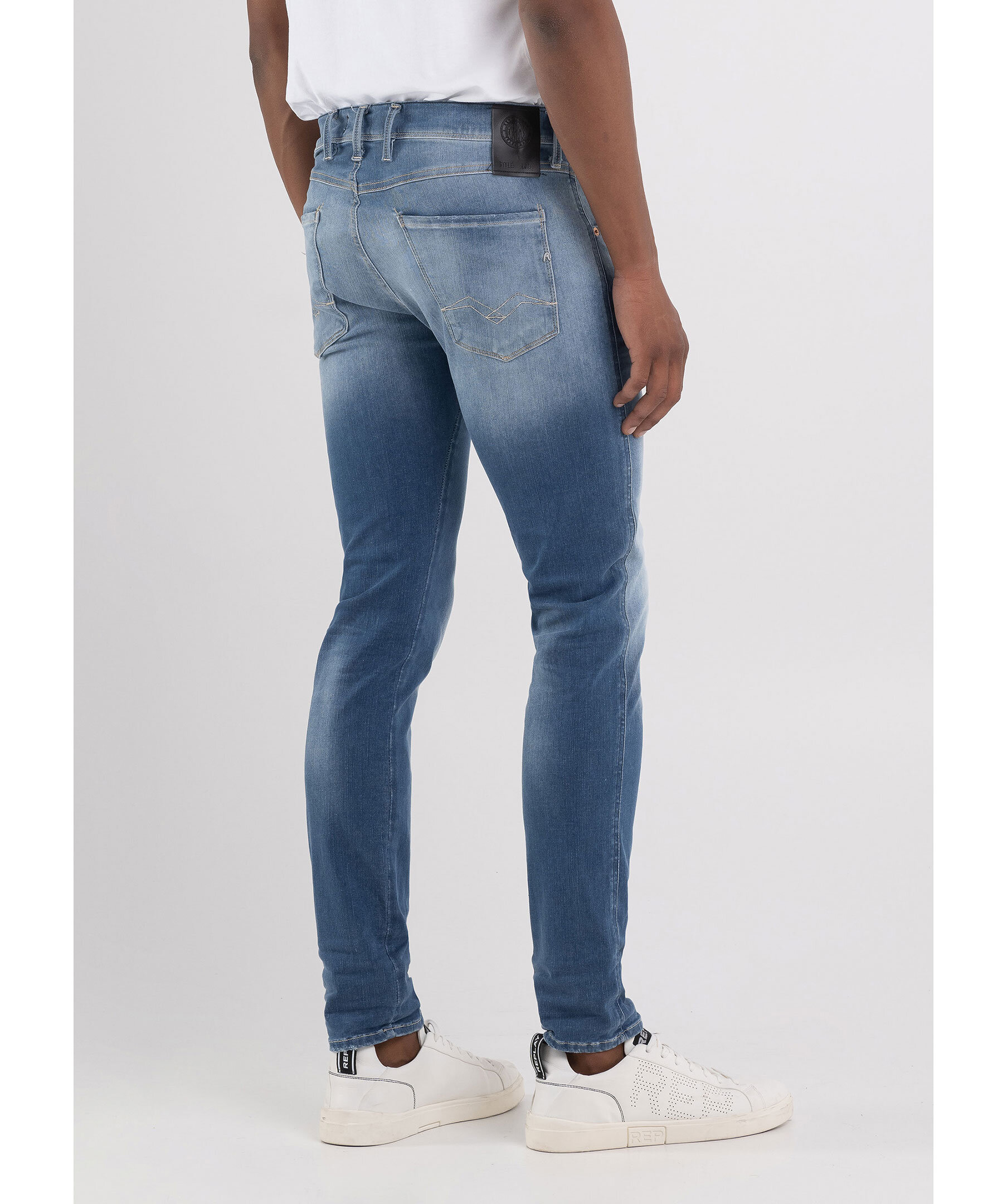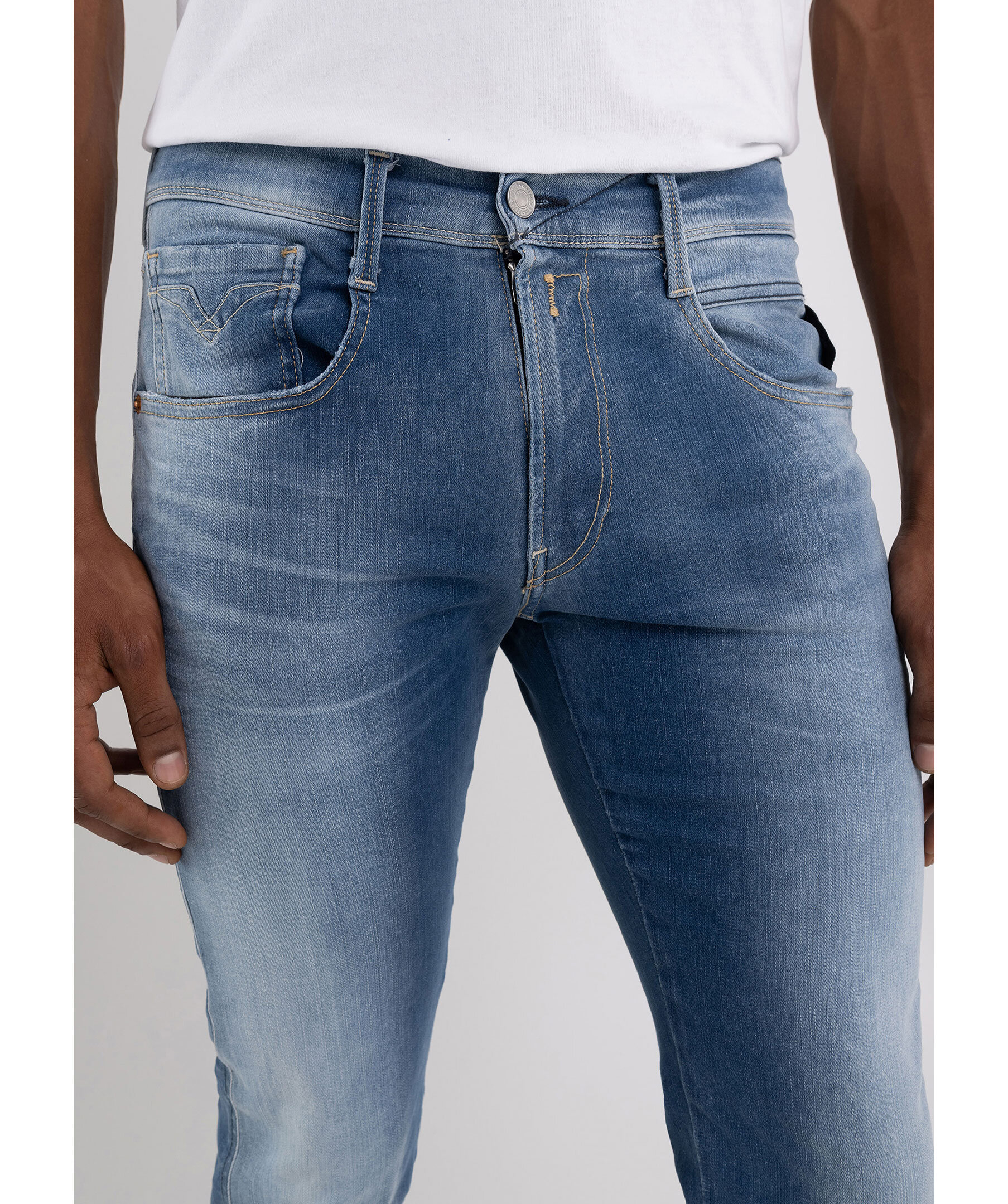 Ljusblåa jeans från Replay. Byxorna har en vanlig midja, fem fickor, triangelformad REPLAY-etikett på vänster ficka, mynt ficka och bakfickor med ikoniska replay-sömmar. R-formad metallbricka på höger bakficka, dragkedja och knappgylf samt hällor för bälte i midjan. Tillverkade i en stretchig bomull- och polyesterblandning.