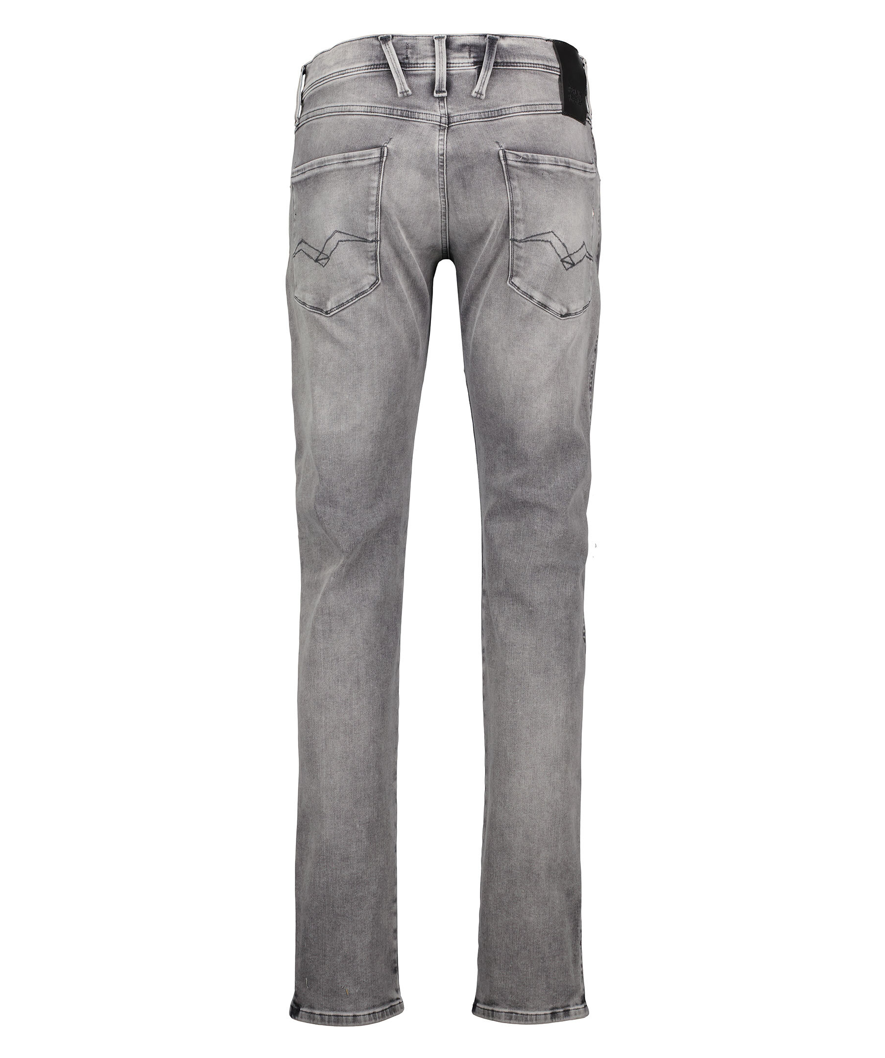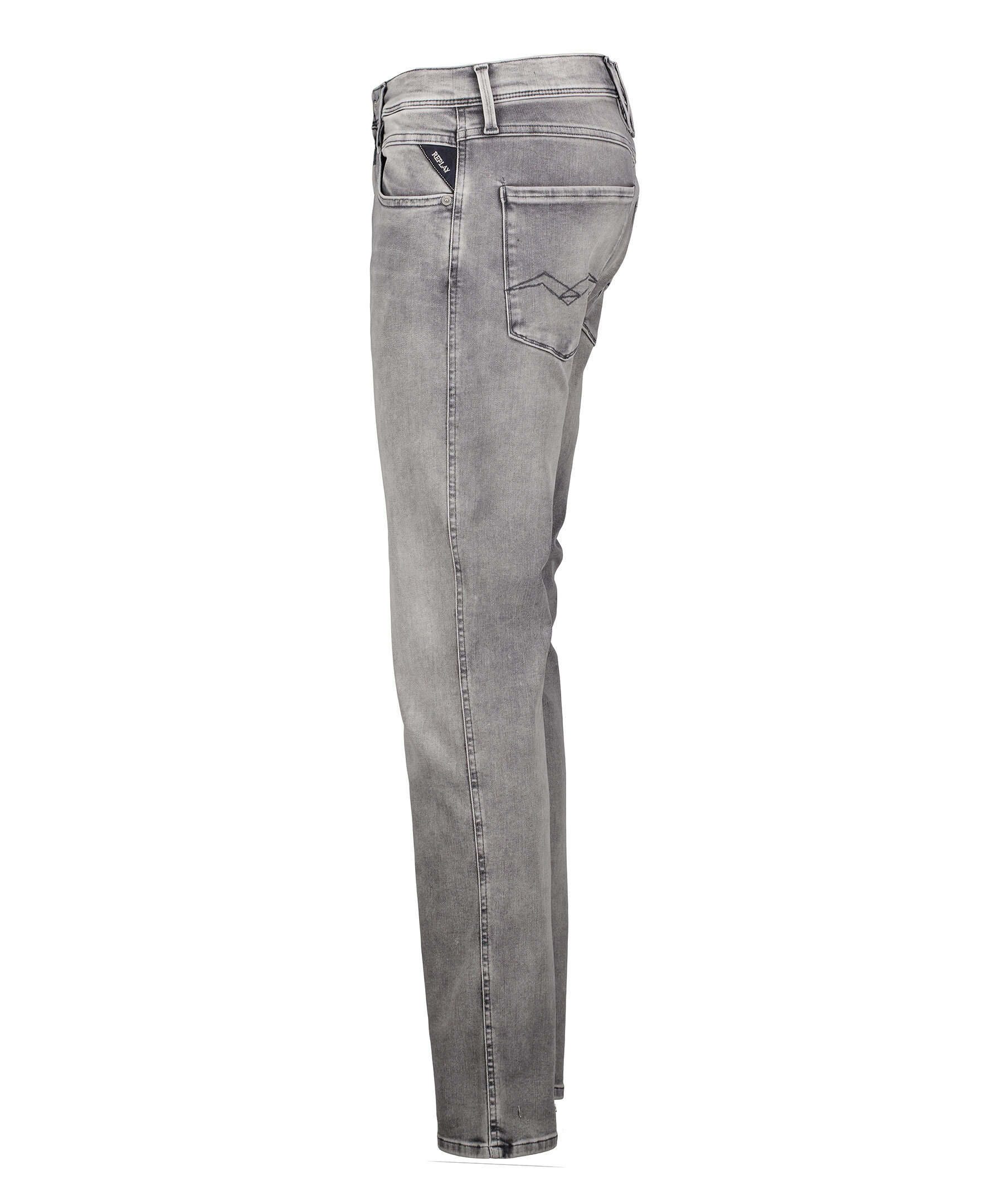 Gråa jeans från Replay. Byxorna har en vanlig midja, fem fickor, triangelformad REPLAY-etikett på vänster ficka, mynt ficka och bakfickor med ikoniska replay-sömmar. R-formad metallbricka på höger bakficka, gylf med dragkedja och knapp som är roterbar samt hällor för bälte i midjan. Tillverkade i en stretchig bomull- och polyesterblandning.