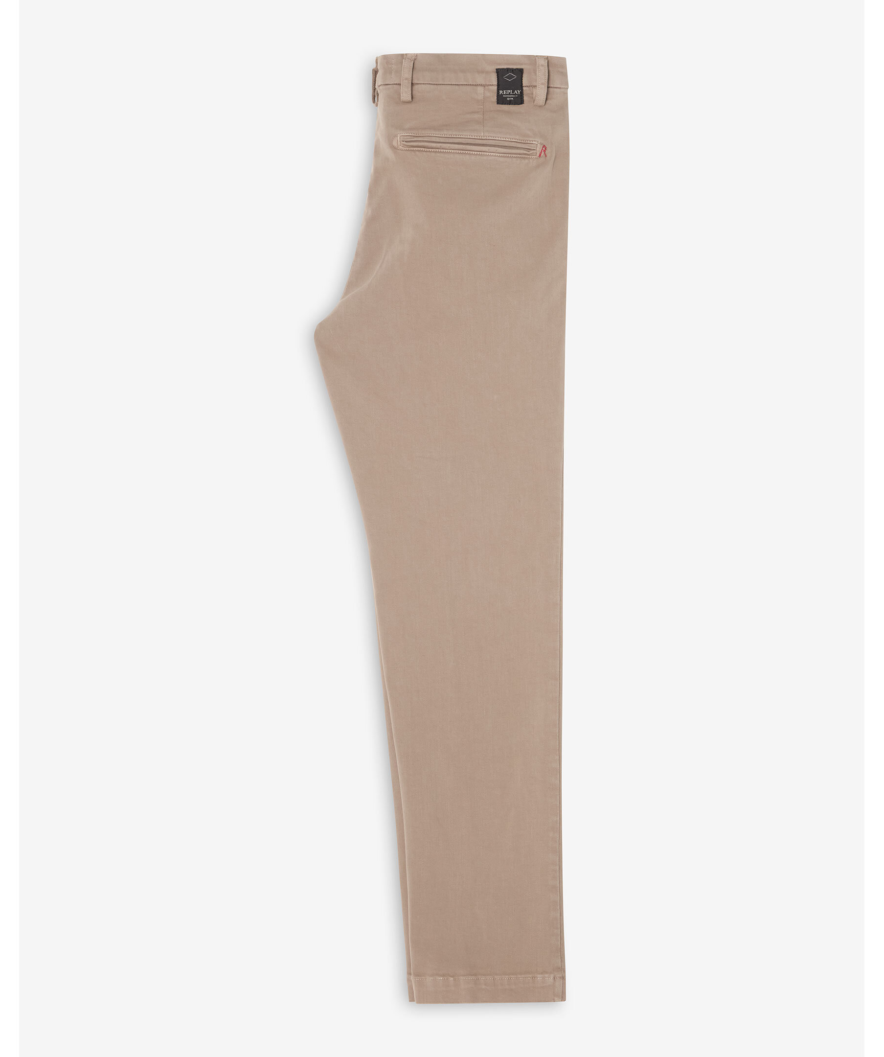 Sandfärgade chinos från Replay. Fem fickor, dragkedja i gylfen och hällor för skärp. Hyperflex modell. Tillverkade i stretchig bomullsblandning. Jeansen är lite stora i storlek, vi rekommenderar att gå ner en storlek för bäst passform.