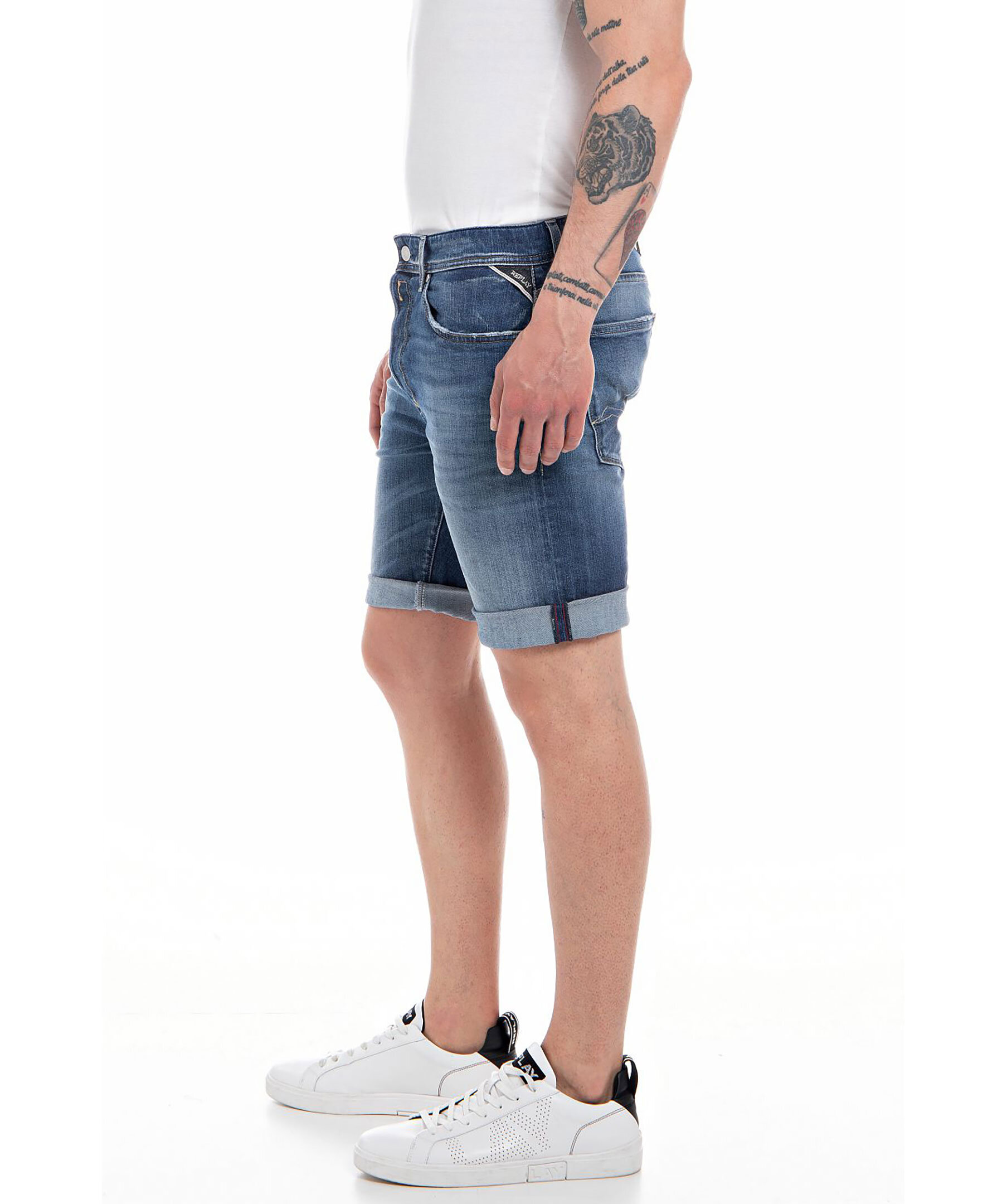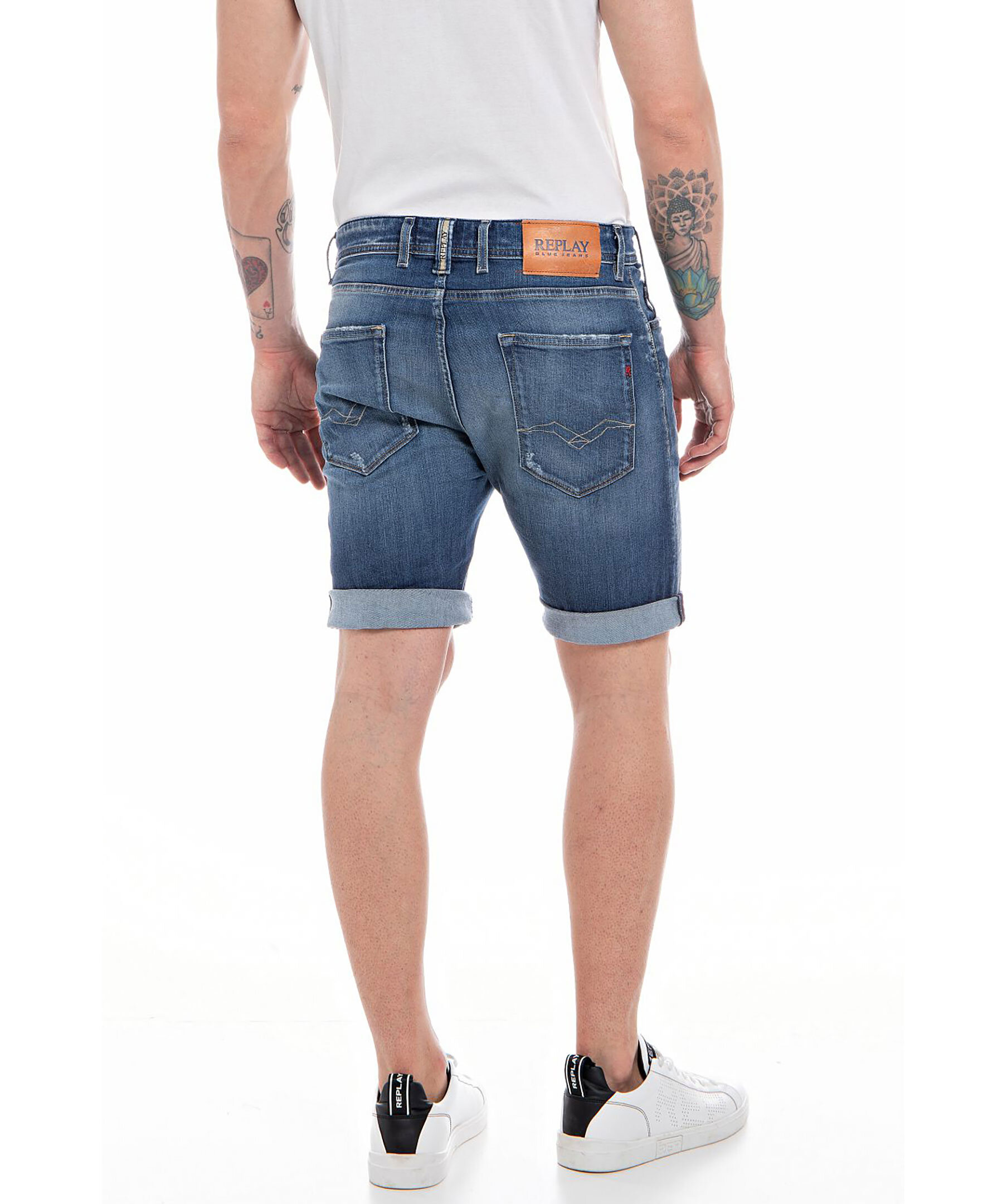 Mellanblåa jeansshorts från Replay. Avsmalnande passform med upprullade ben som även kan vikas ner efter tycke och smak. Vanlig midja, låg gren och avsmalnande ben, tvättad look och slitningar på fickkanter och på benen. Bakfickor med ikoniska Replay-sömmar, dragkedja och knappgylf. Hällor för bälte i midjan.