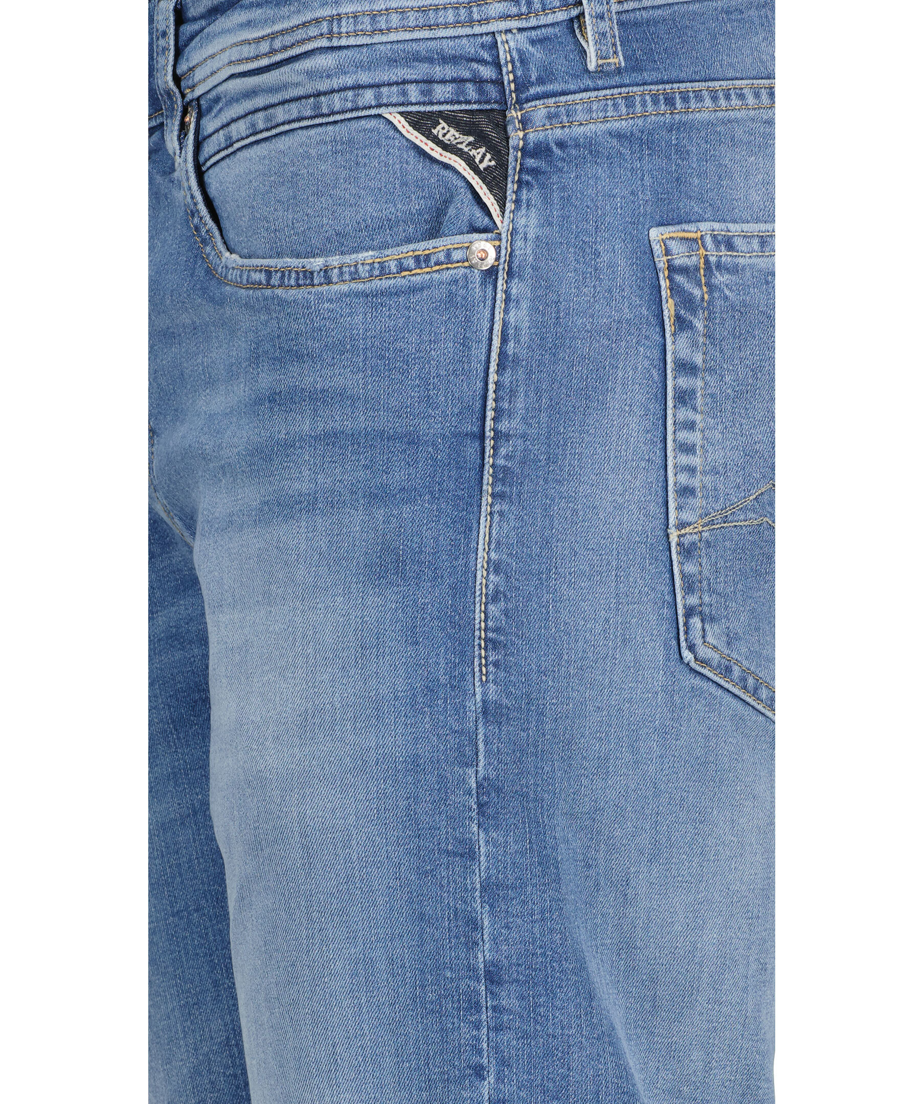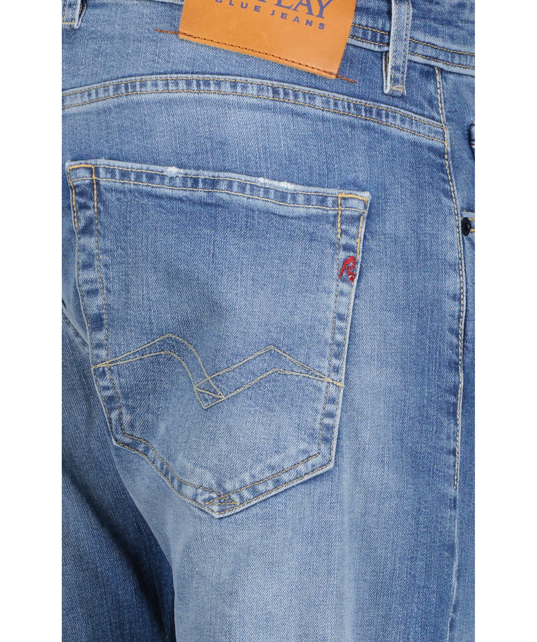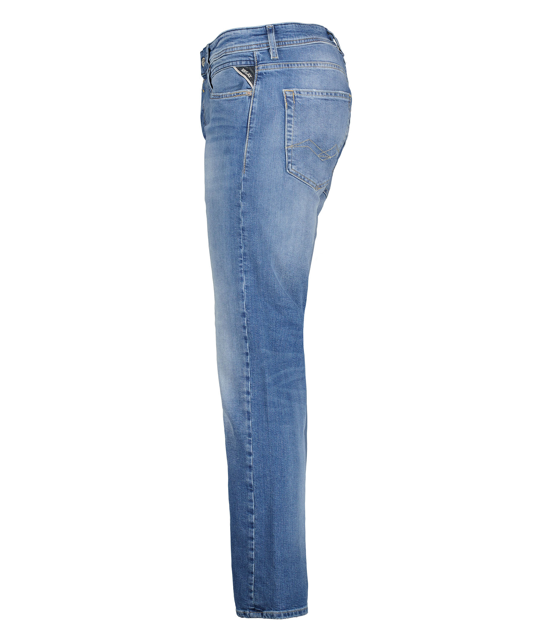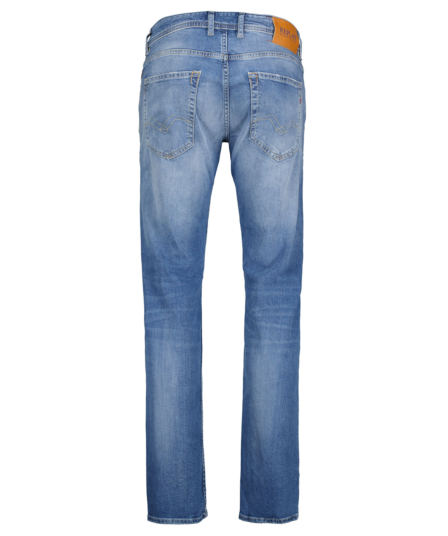 Mellanblåa straight fit jeans från Replay. Tillverkade i stretch-denim, normalhög midja och raka ben. Fem fickor, myntficka med söm och bakfickor med ikoniska Replay-sömmar och R-format broderi, kontrastfärgad etikett i linningen, dold gylf med knapp-knäppning. Hällor för bälte i midjan. Innerbenslängden är 79cm i storlek 32'32.