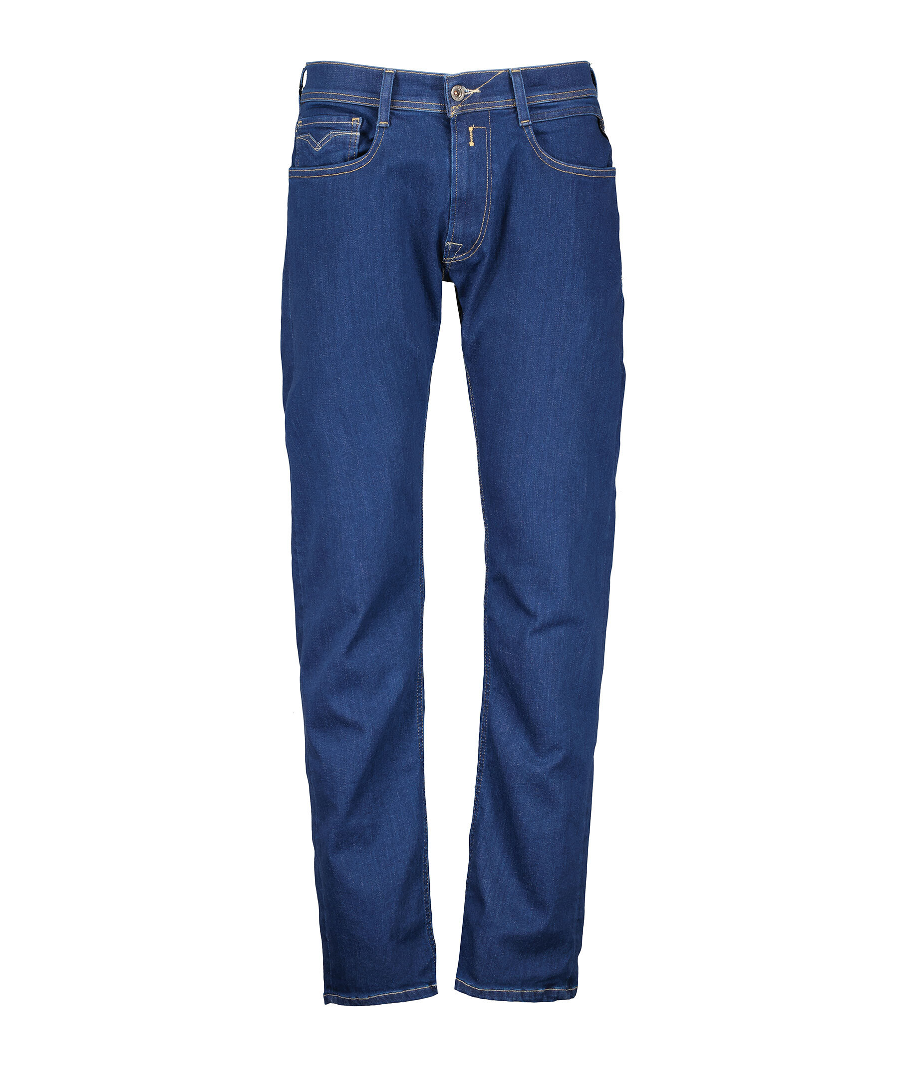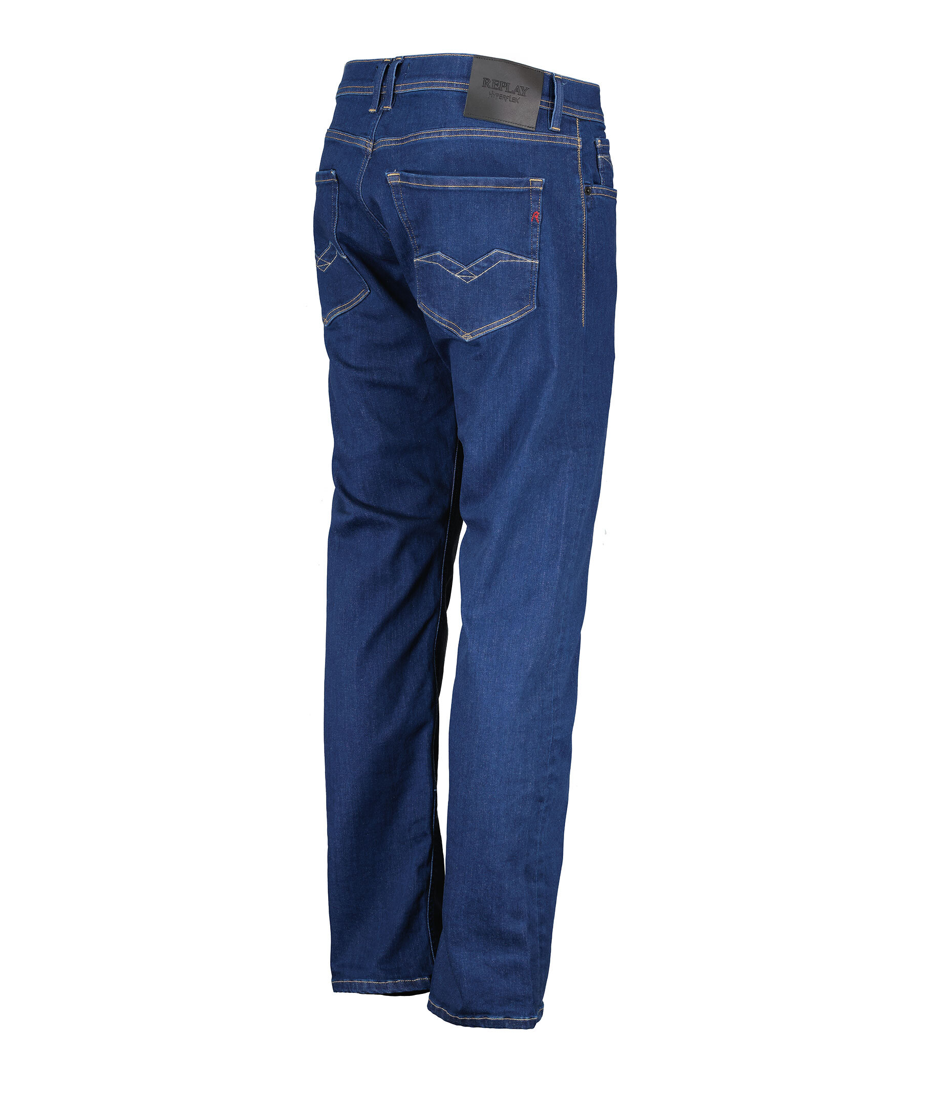 Mörkblåa jeans från Replay. Jeansen har en normalhög midja med bälteshällor, fem fickor, triangelformad REPLAY-etikett på vänster ficka, mynt ficka och bakfickor med ikoniska replay-sömmar. Läder etikett på linningen samt litet rött broderat R på höger bakficka. Tillverkad i en stretchig bomullsblandning.