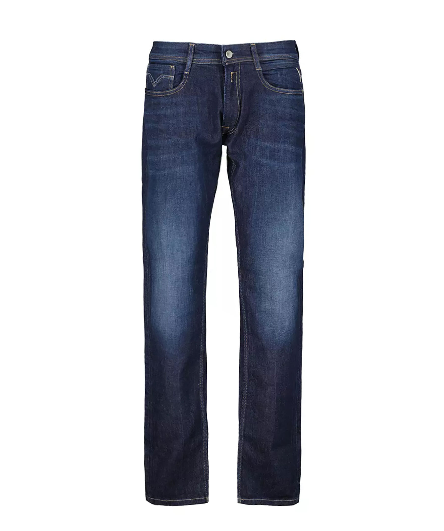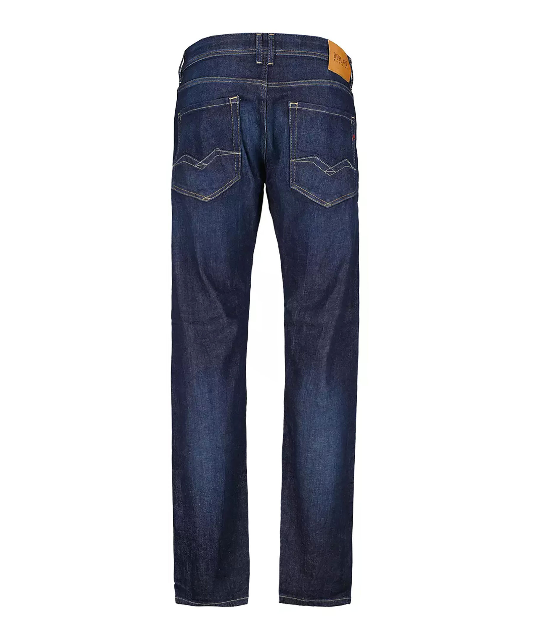 Mörkblåa jeans från Replay. Jeansen har en normalhög midja med bälteshällor, fem fickor, triangelformad REPLAY-etikett på vänster ficka, mynt ficka och bakfickor med ikoniska replay-sömmar. Läder etikett på linningen samt litet rött broderat R på höger bakficka. Tillverkad i en stretchig bomullsblandning.