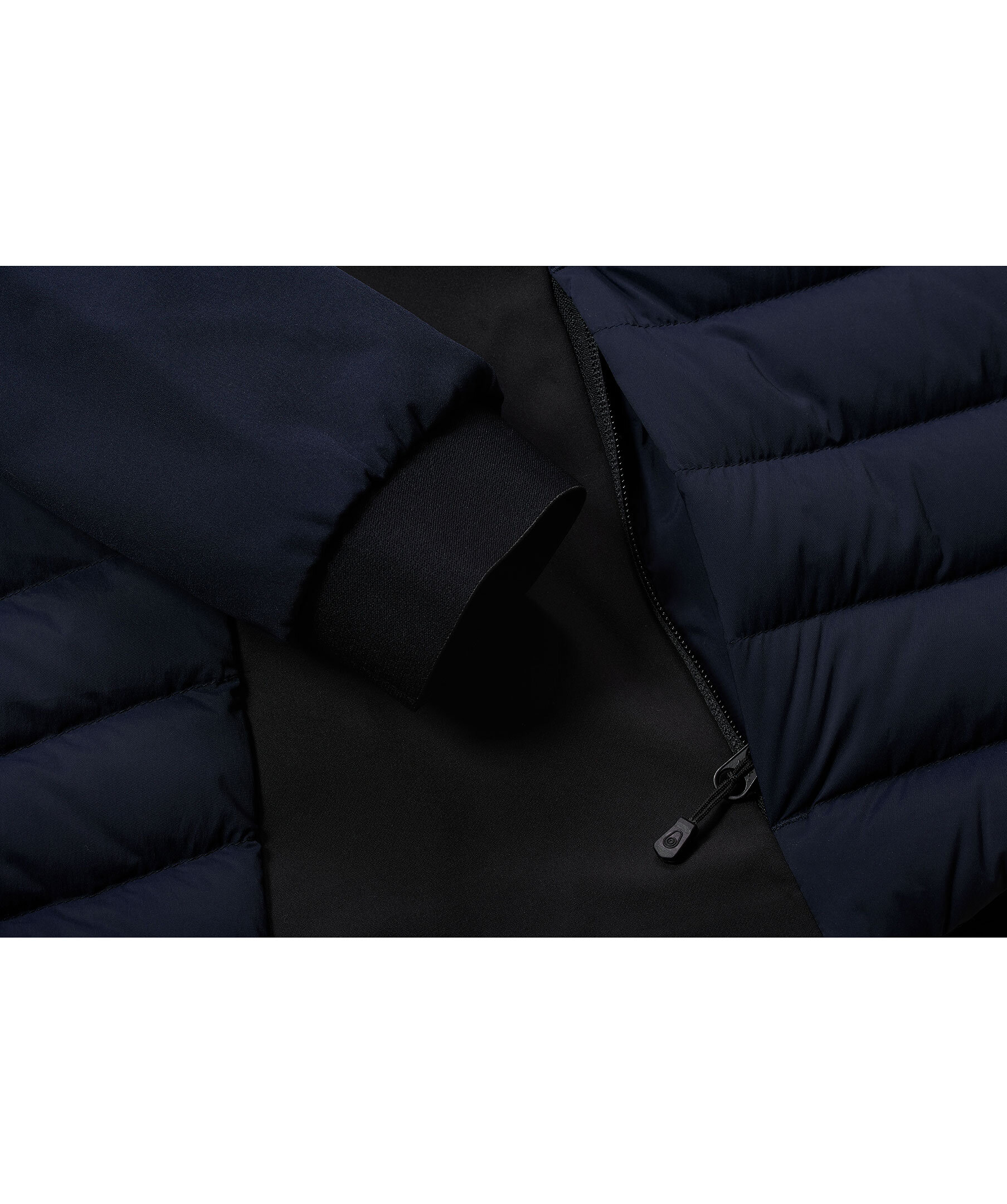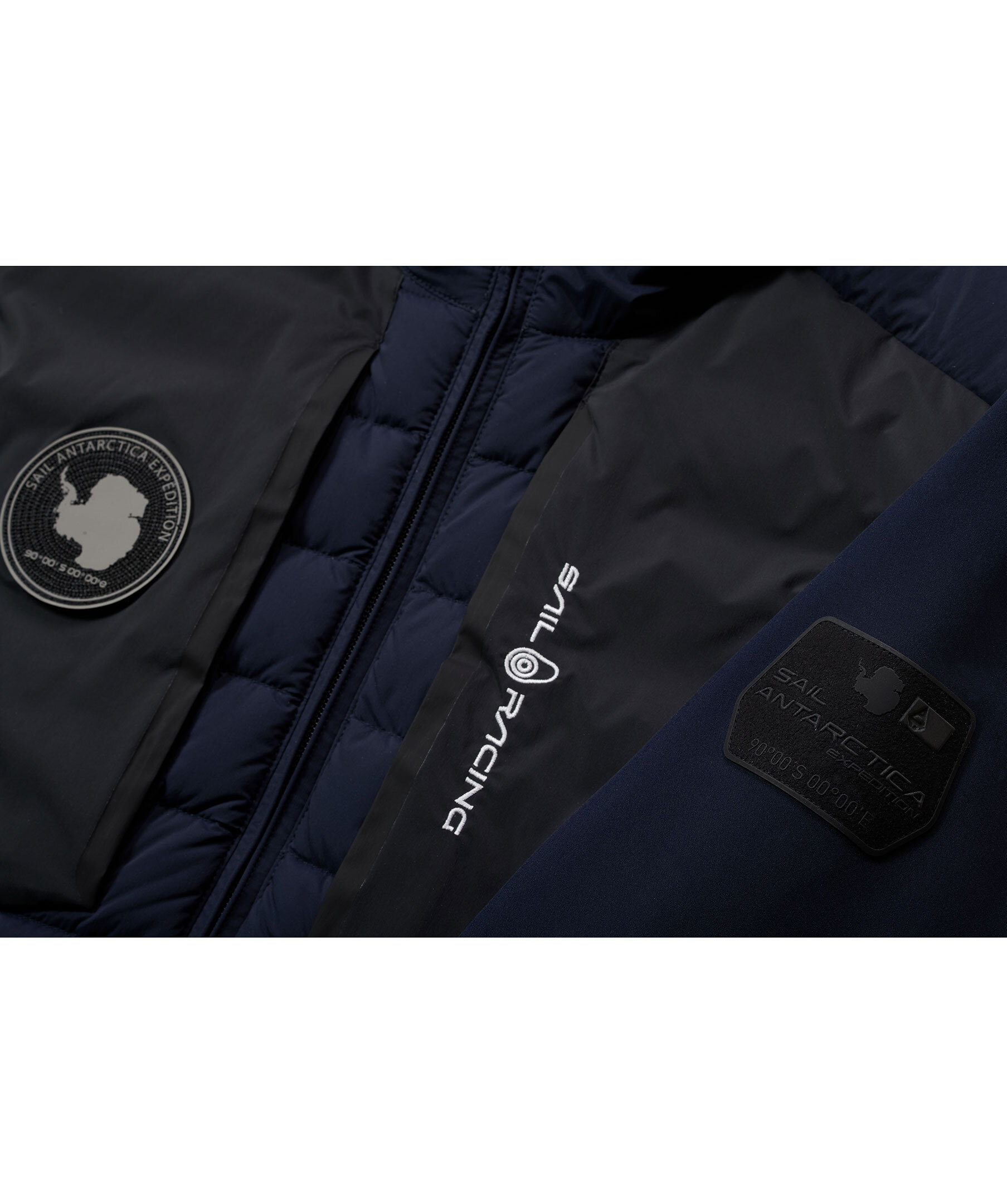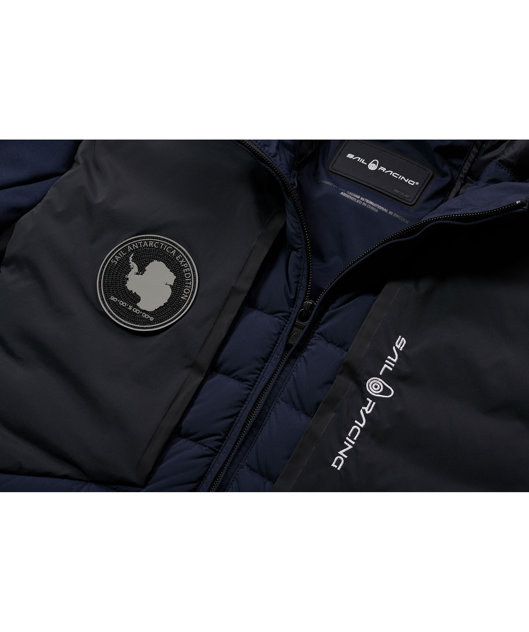 Mörkblå, tunn jacka som är vind- och vattenresistent från Sail Racing. Med svarta paneler framtill och i sidan, på ryggen och på luvans baksida. Dunfyllning fram och bak och ärmar i tunnare material. Resår i nederkant för att hålla värmen. Blixtlåsförsedda fleecefickor i sidorna. Bröstfickor med blixtlås. Broderad logotyp på bröstet. Passar bra till mild höst eller kylig vår.