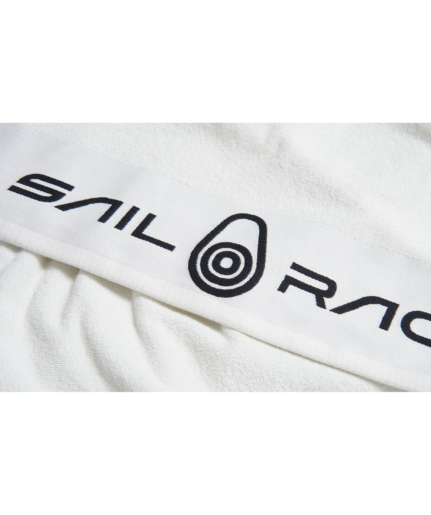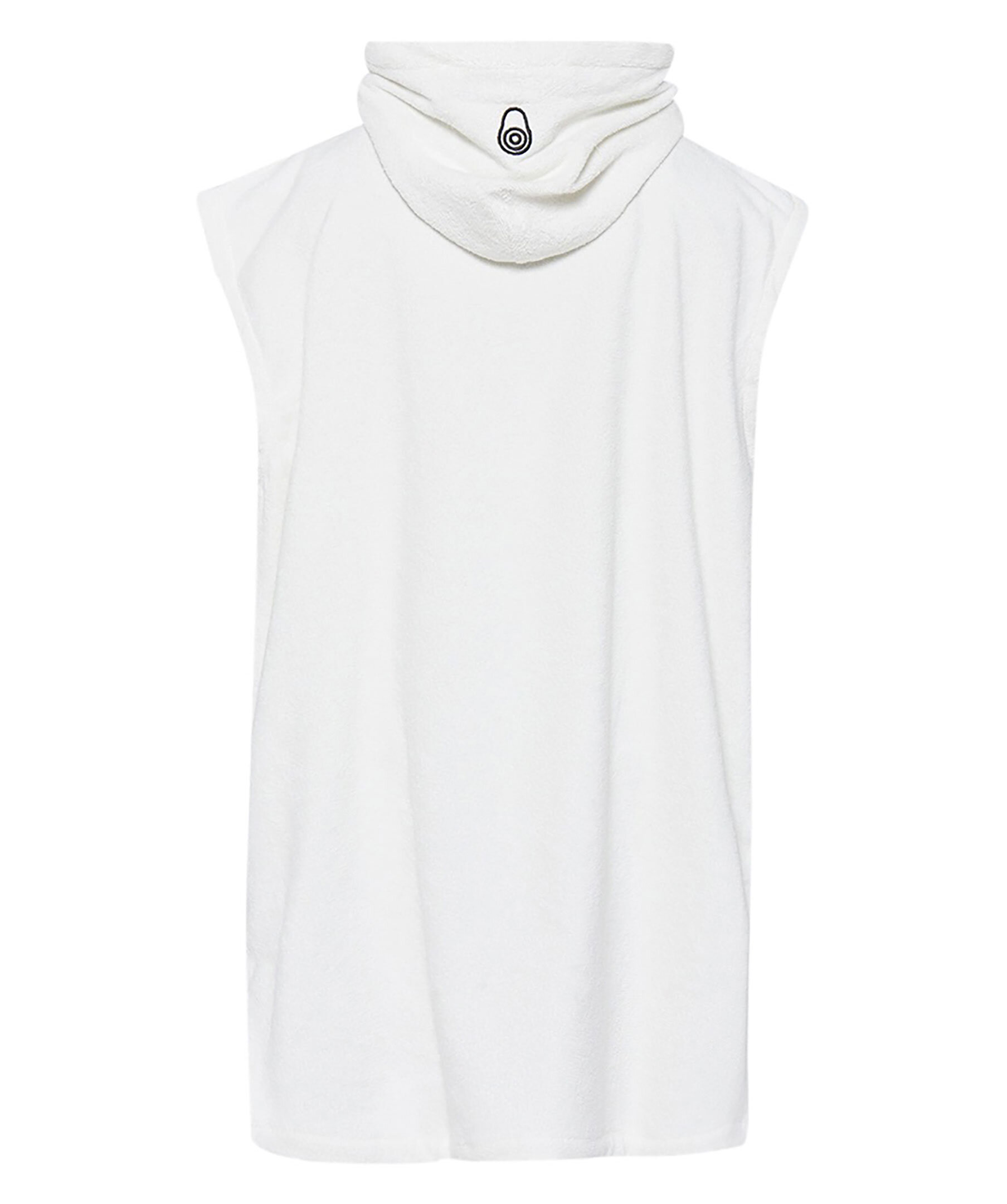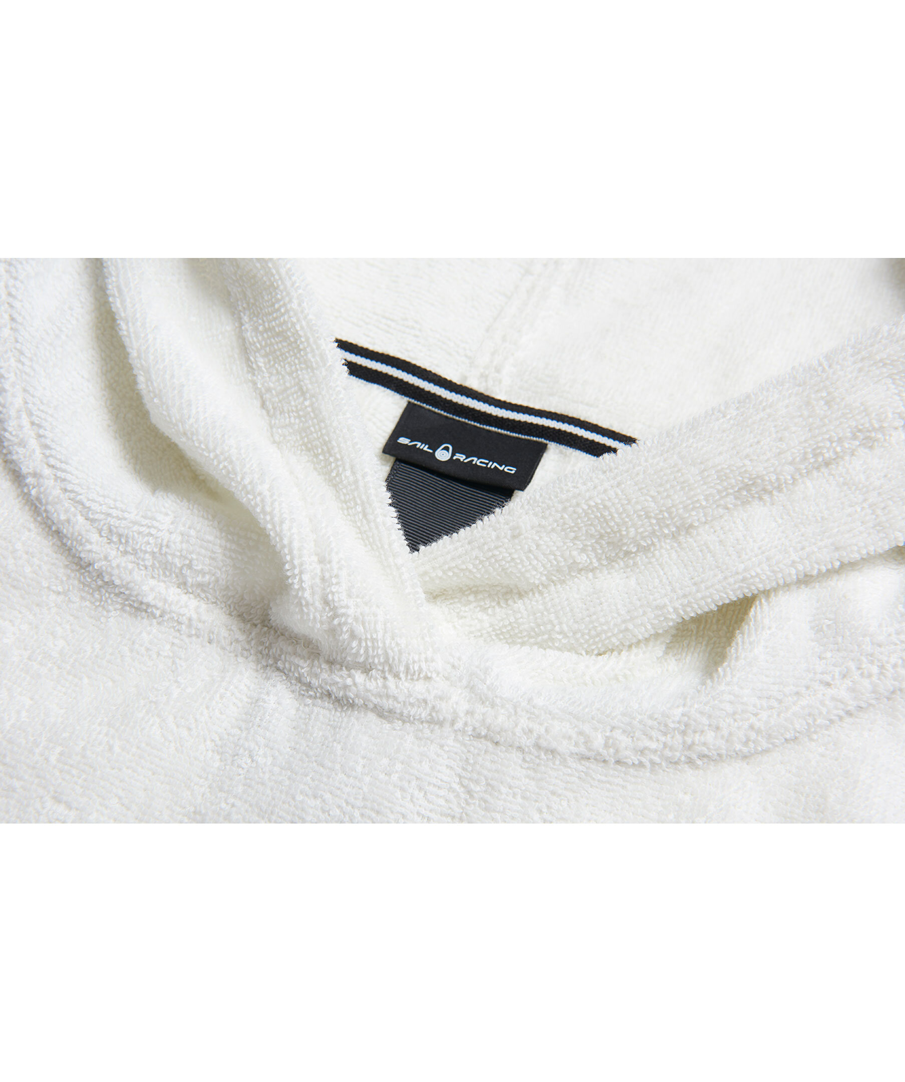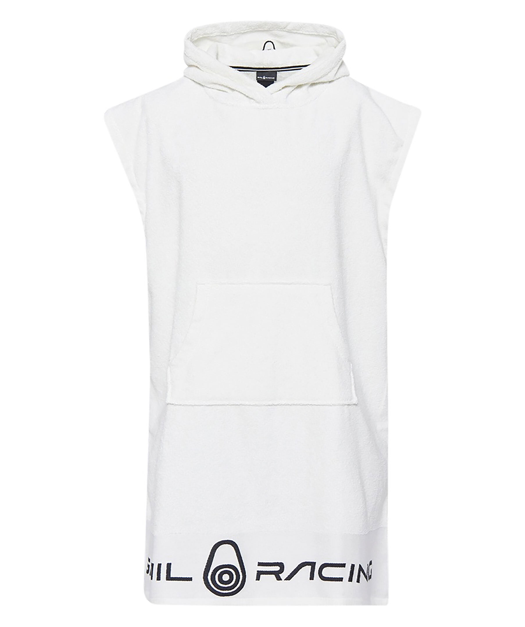 Vit poncho konstruerad i bomullsfrotté från Sail Racing. Rymlig känguruficka framtill och luva med broderad logotyp samt stor broderad logotyp på den nedre kanten fram. Utan ärmar och slutar mitt på låret samt har slitsar i sidorna.
