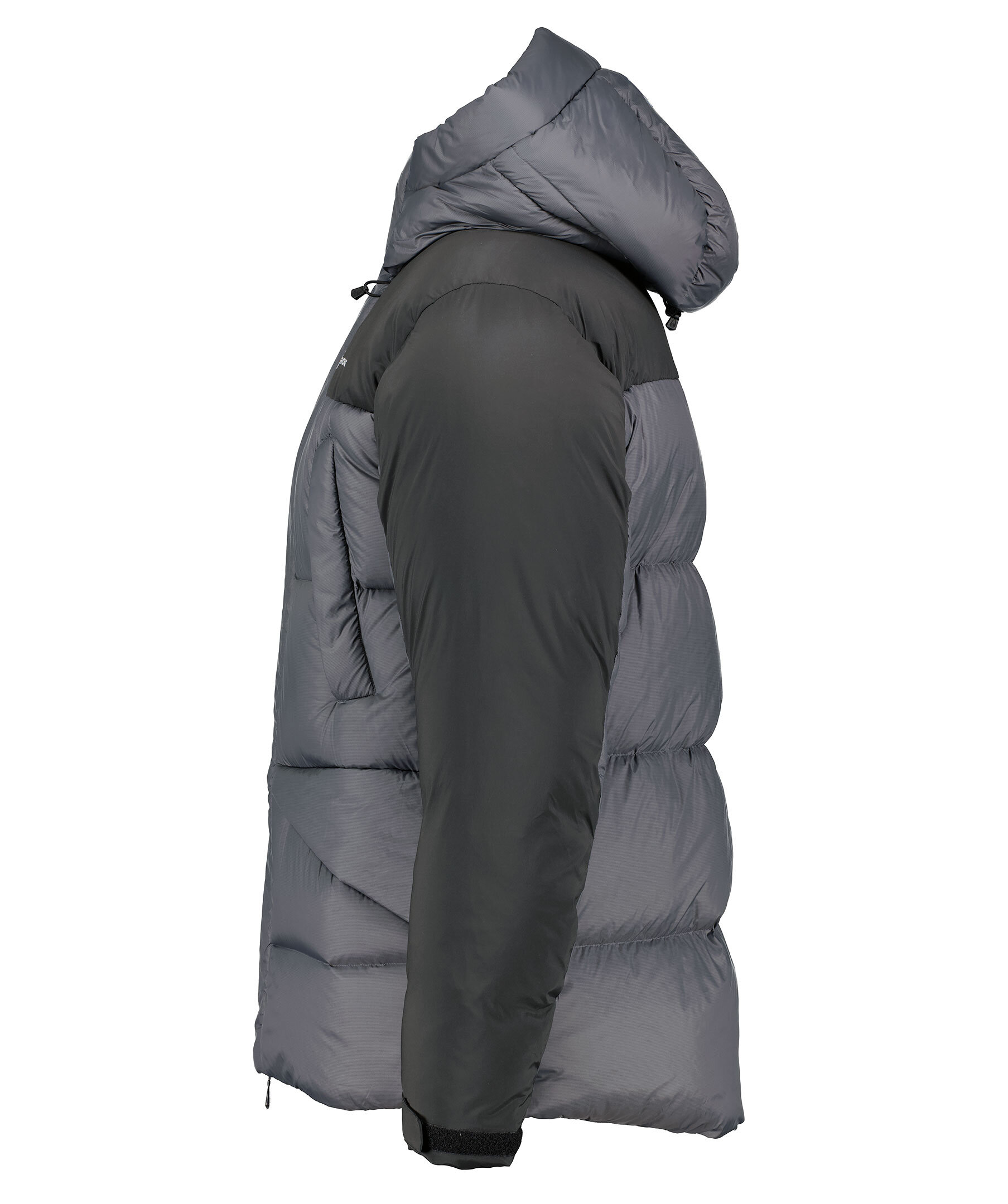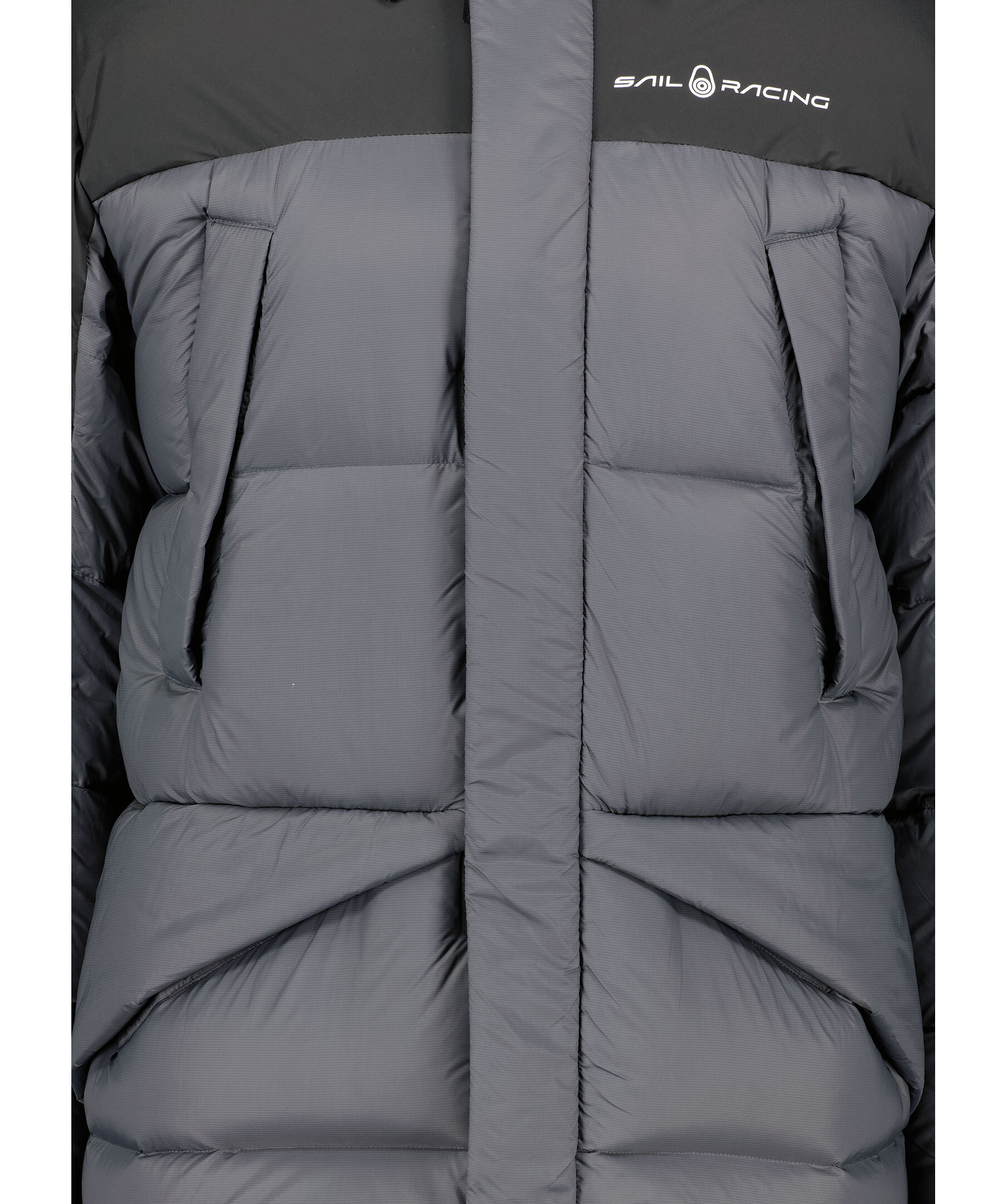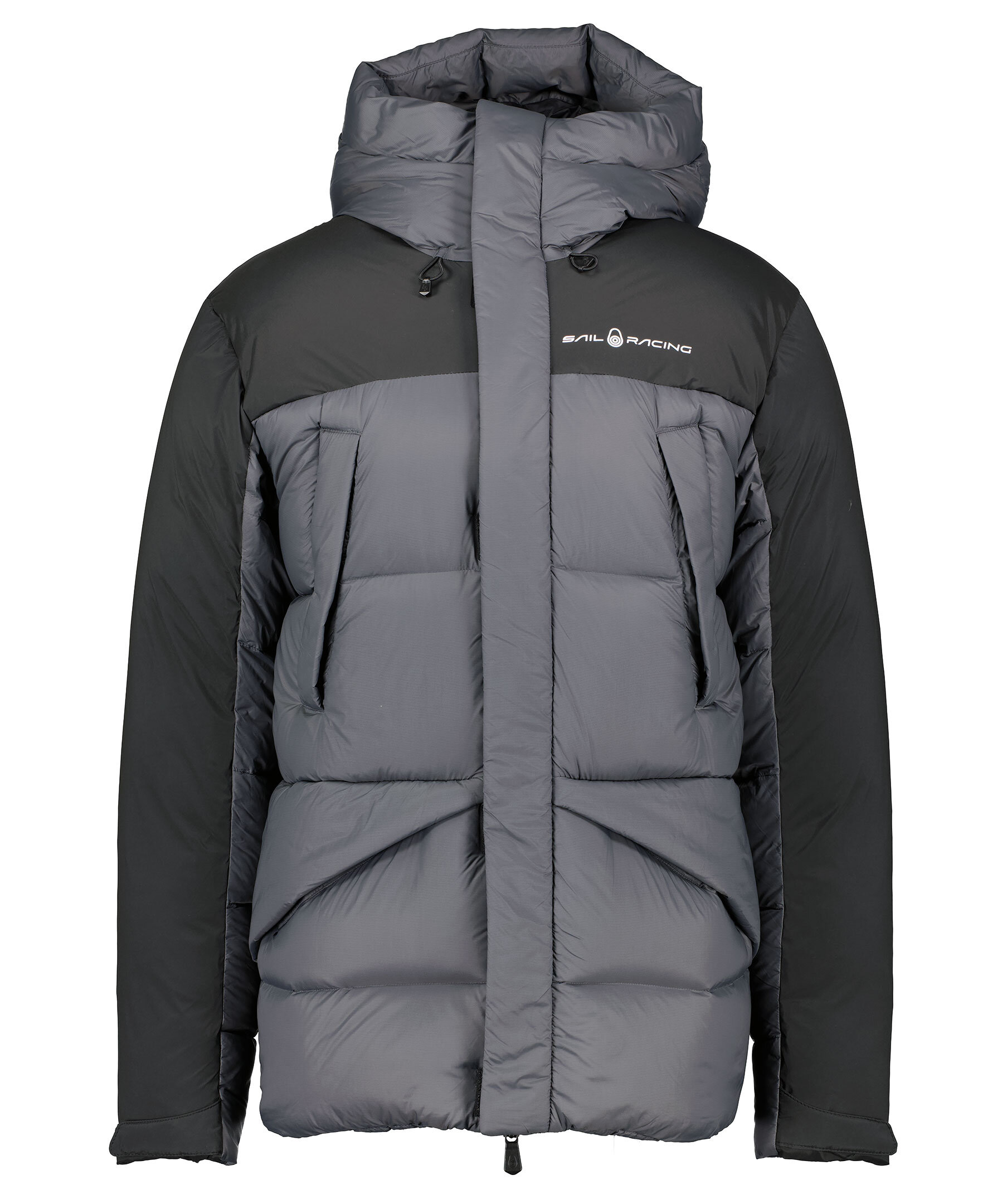 Svart och grå dunjacka från Sail Racing. Stängs med dragkedja och kardborrar framtill. Fyra fickor framtill, två som stängs med dragkedja. Tryckt logotyp på vänster bröst. Dragsko vid luvan och plaggslut. Justerbara ärmslut.