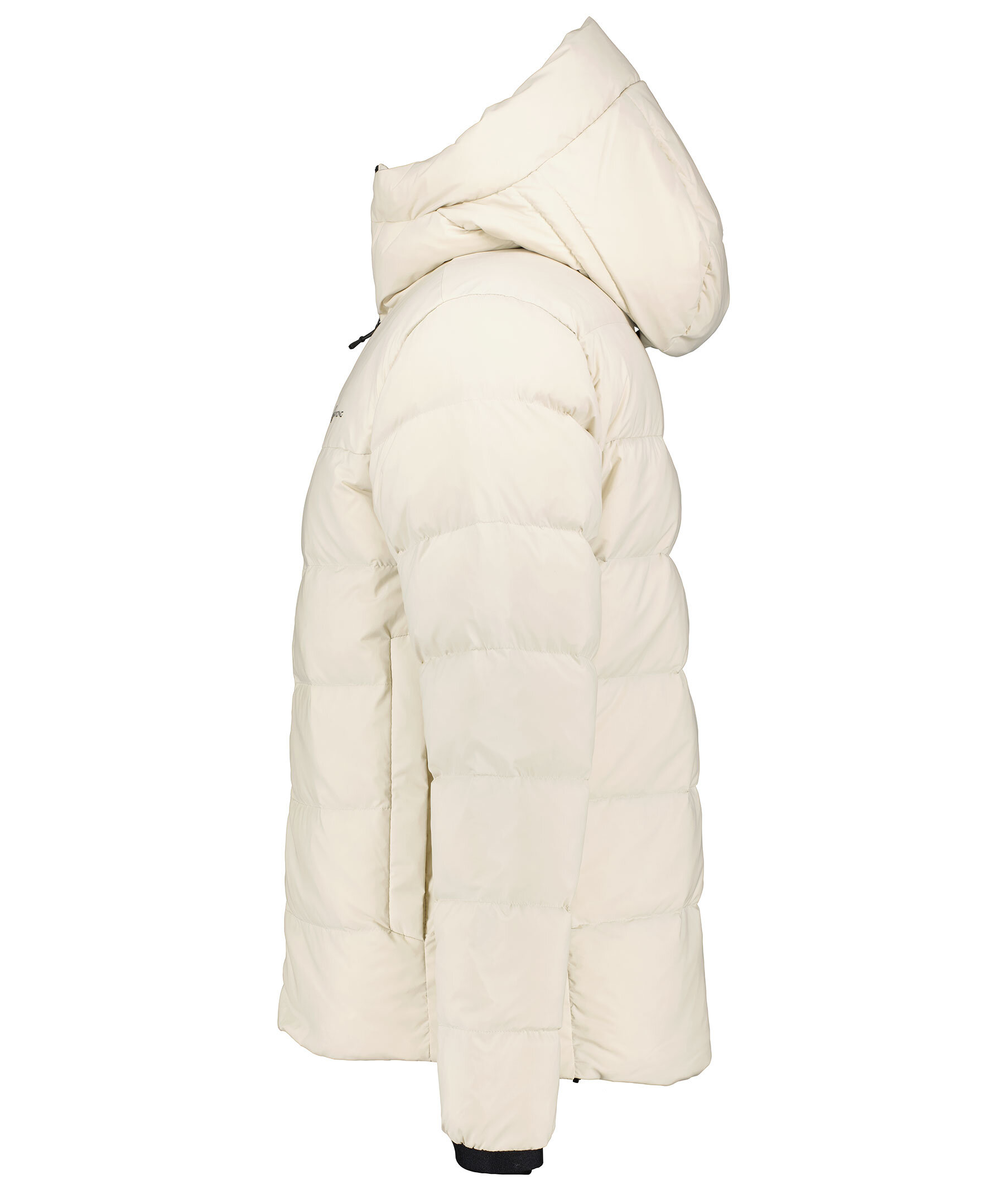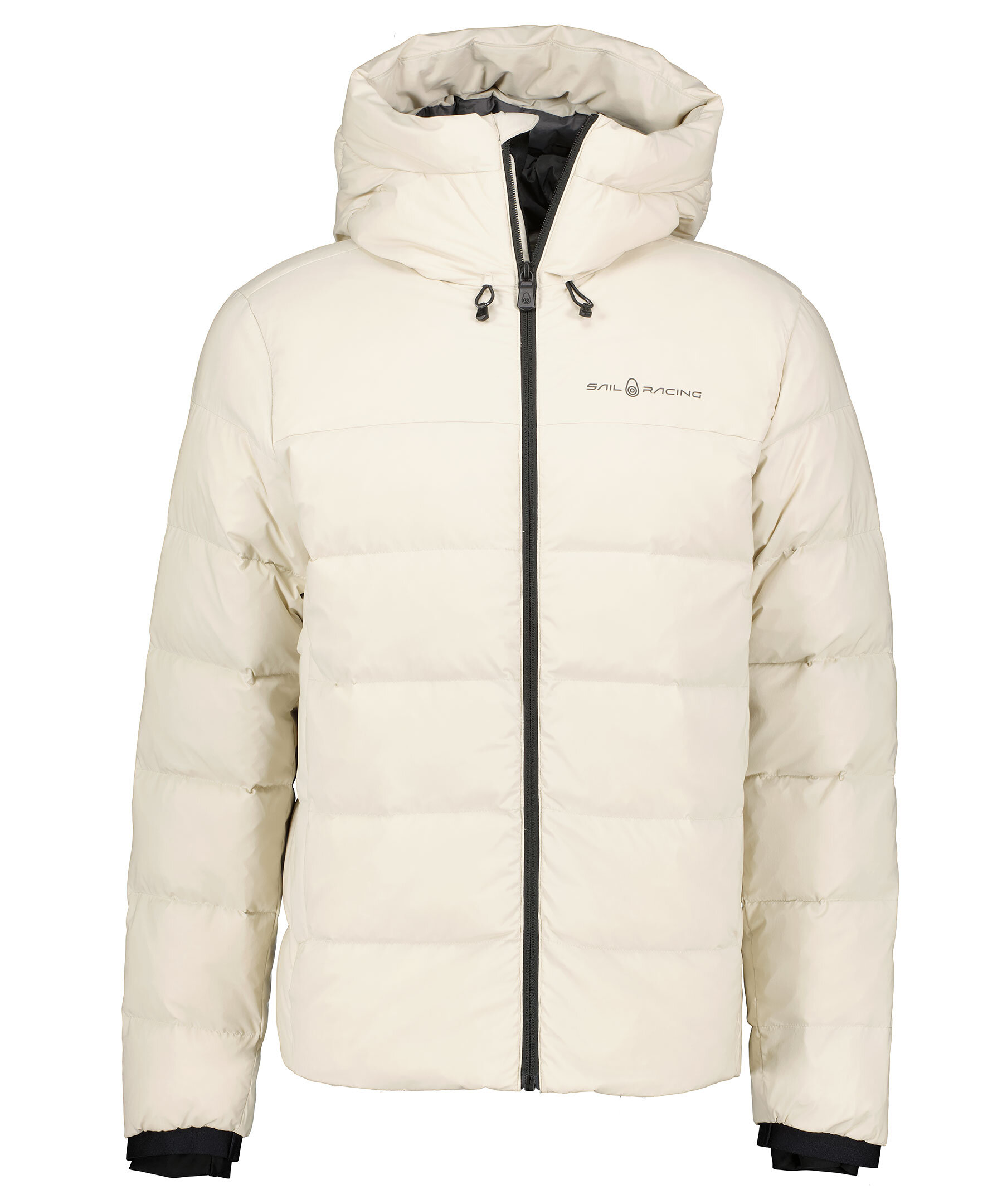 Beige dunjacka med quiltad panel från Sail Racing. Stängs med dragkedja framtill. Luva med dragsko. Två sidfickor som stängs med dragkedja. tryckt logotyp på vänster bröst och bak på luvan.