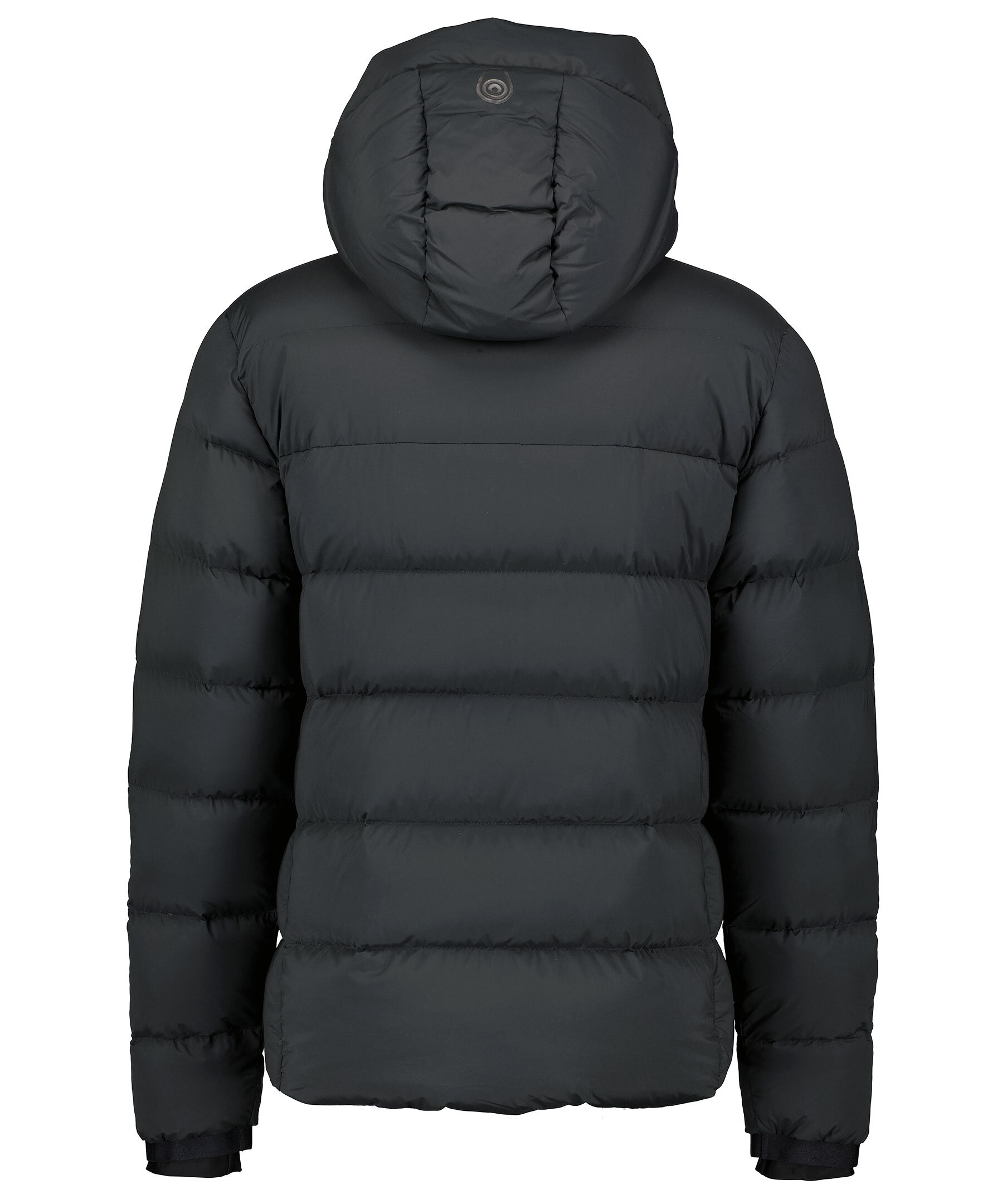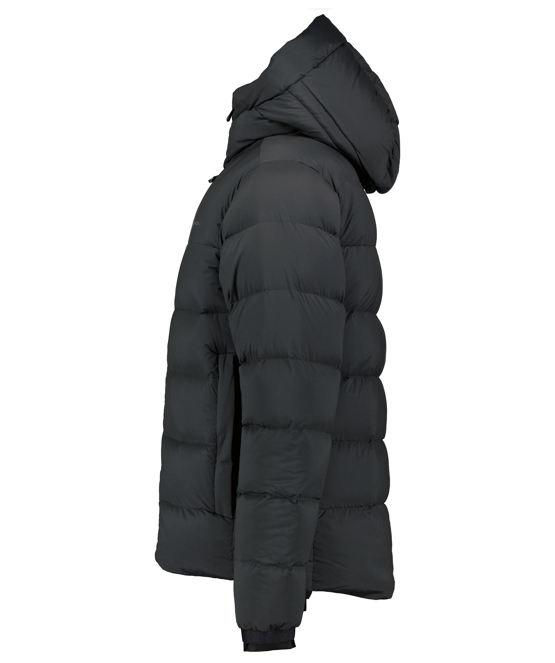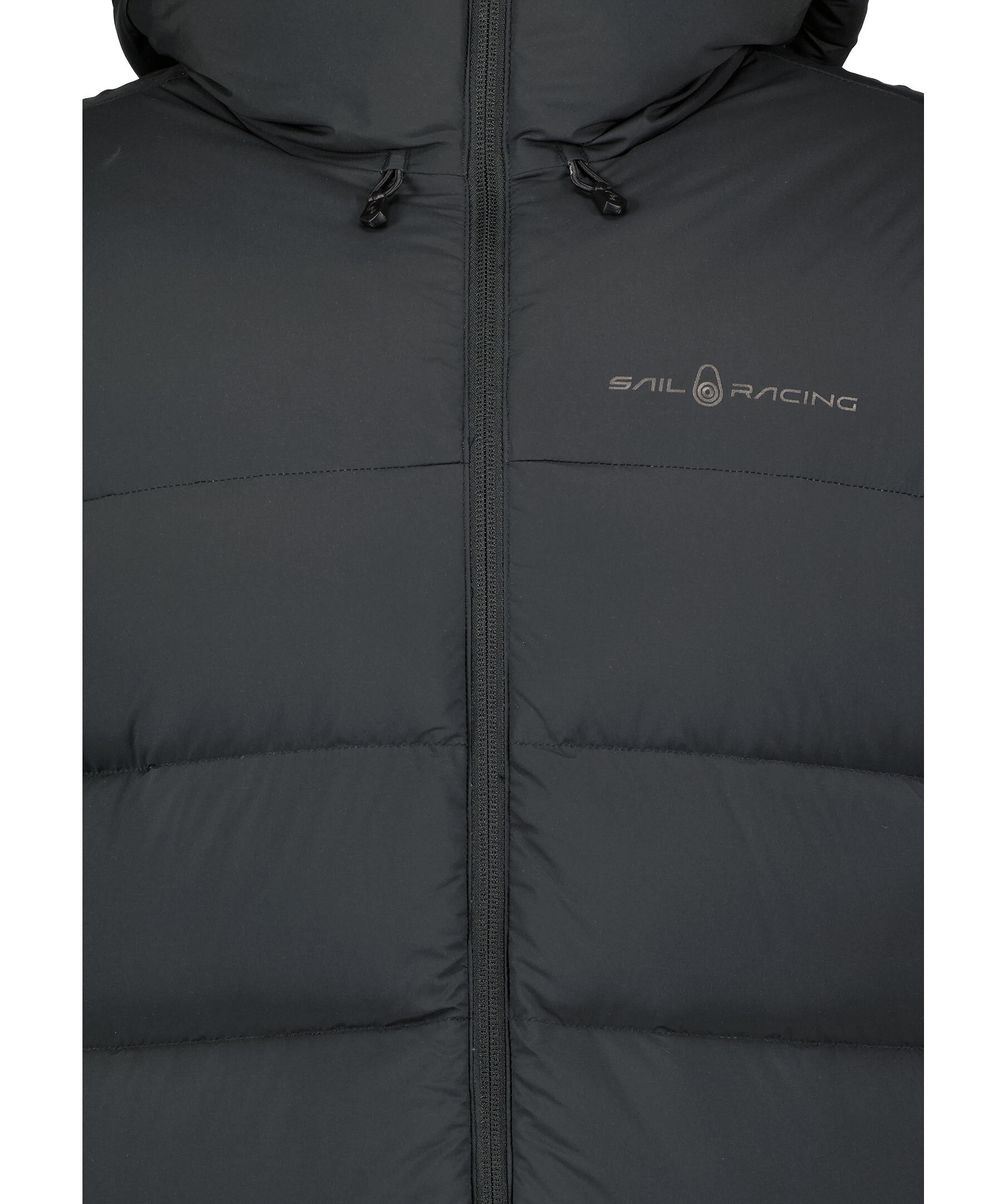 Svart dunjacka med panel quiltning. från Sail Racing. Stängs med dragkedja framtill. Luva med dragsko. Två sidfickor som stängs med dragkedja. Tryckt logotyp på vänster bröst och bak på luvan.