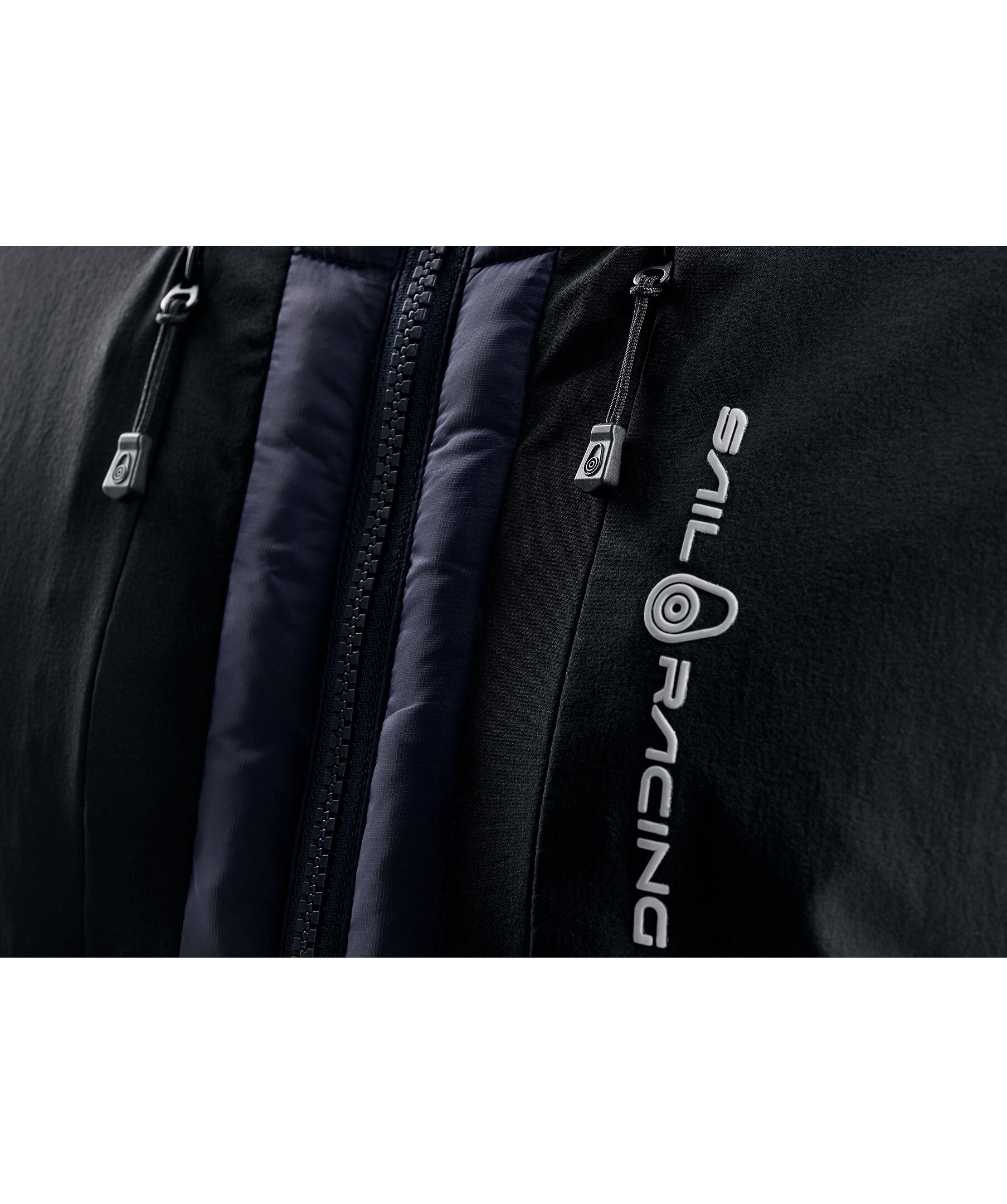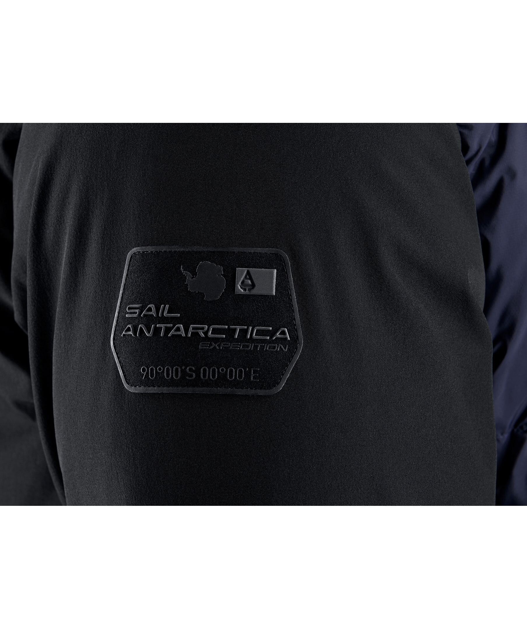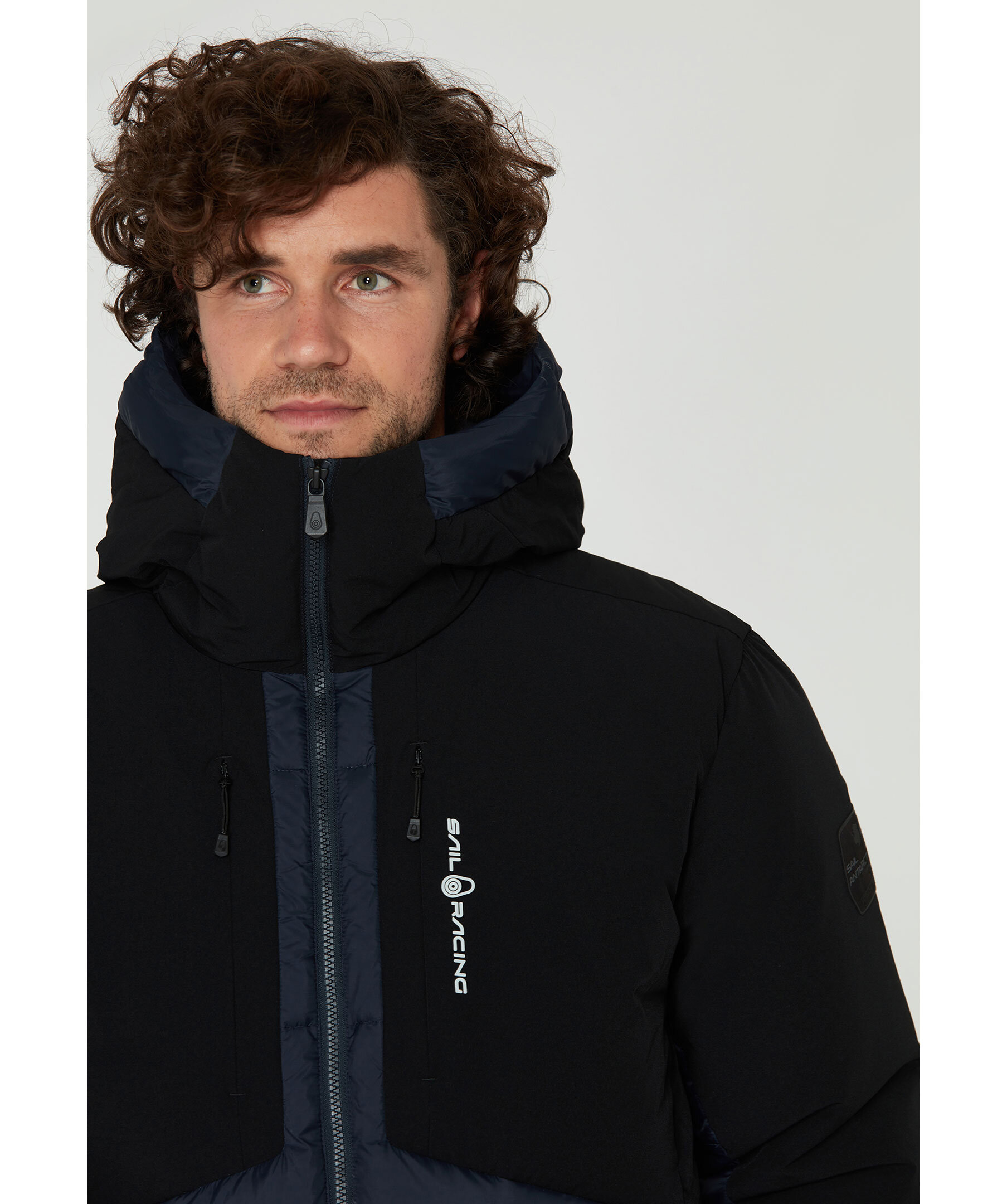 Mörkblå quiltad dunjacka från Sail Racing. Panel i svart kontrasttyg på bröstet och axlarna. Stängs framtill med tvåvägsdragkedja. Två bröstfickor framtill som stängs med dragkedjor, två fickor i sidorna som stängs med dragkedja. Logotyp i vitt på vänster bröst och baktill på luvan. Patch med gummerad logotyp på vänster ärm. Jackan är vindtät och tillverkad i ett vattenavvisande material.