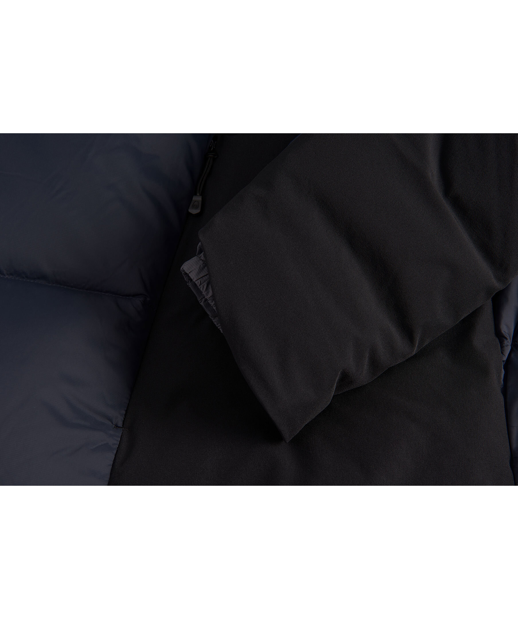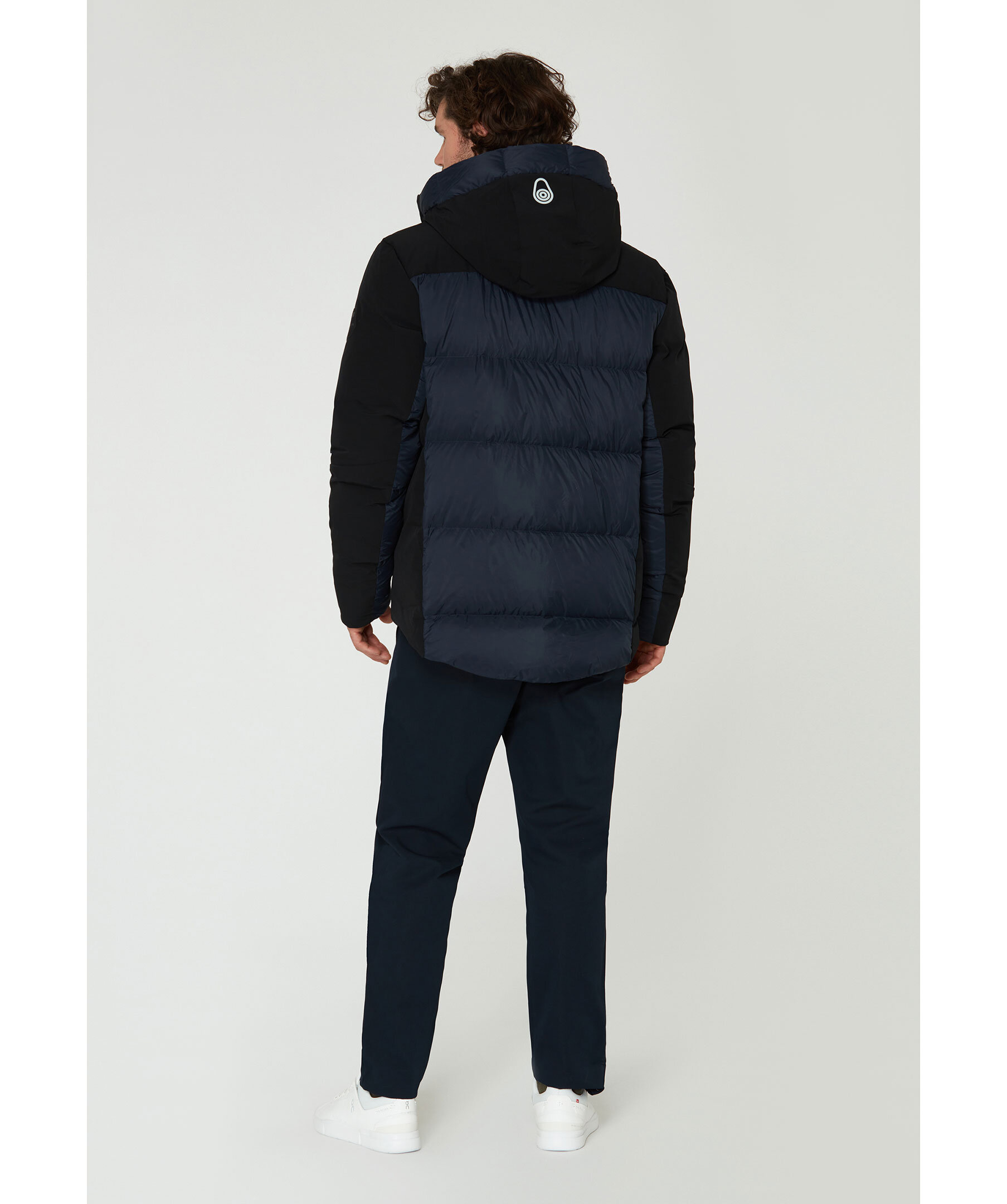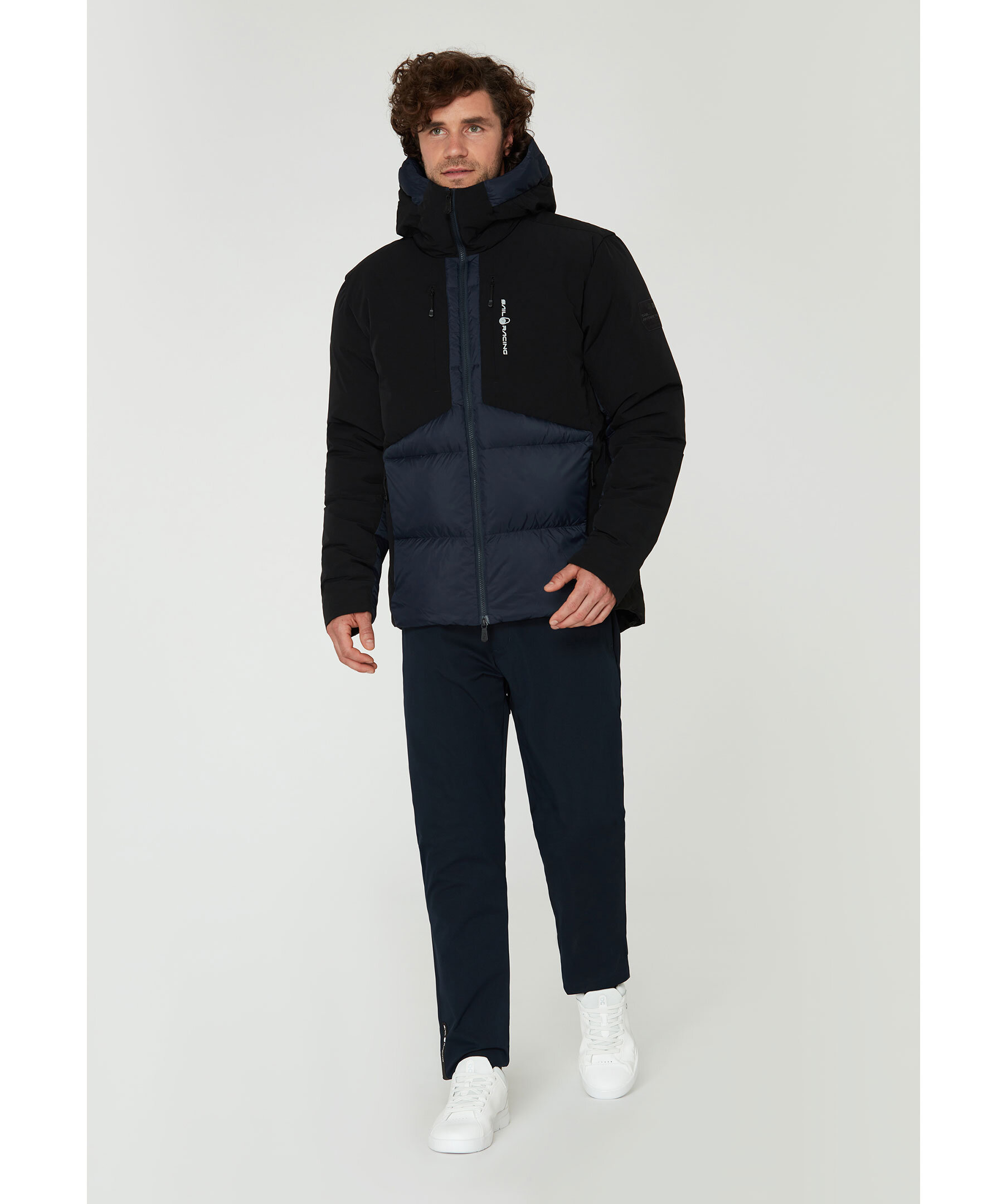 Mörkblå quiltad dunjacka från Sail Racing. Panel i svart kontrasttyg på bröstet och axlarna. Stängs framtill med tvåvägsdragkedja. Två bröstfickor framtill som stängs med dragkedjor, två fickor i sidorna som stängs med dragkedja. Logotyp i vitt på vänster bröst och baktill på luvan. Patch med gummerad logotyp på vänster ärm. Jackan är vindtät och tillverkad i ett vattenavvisande material.