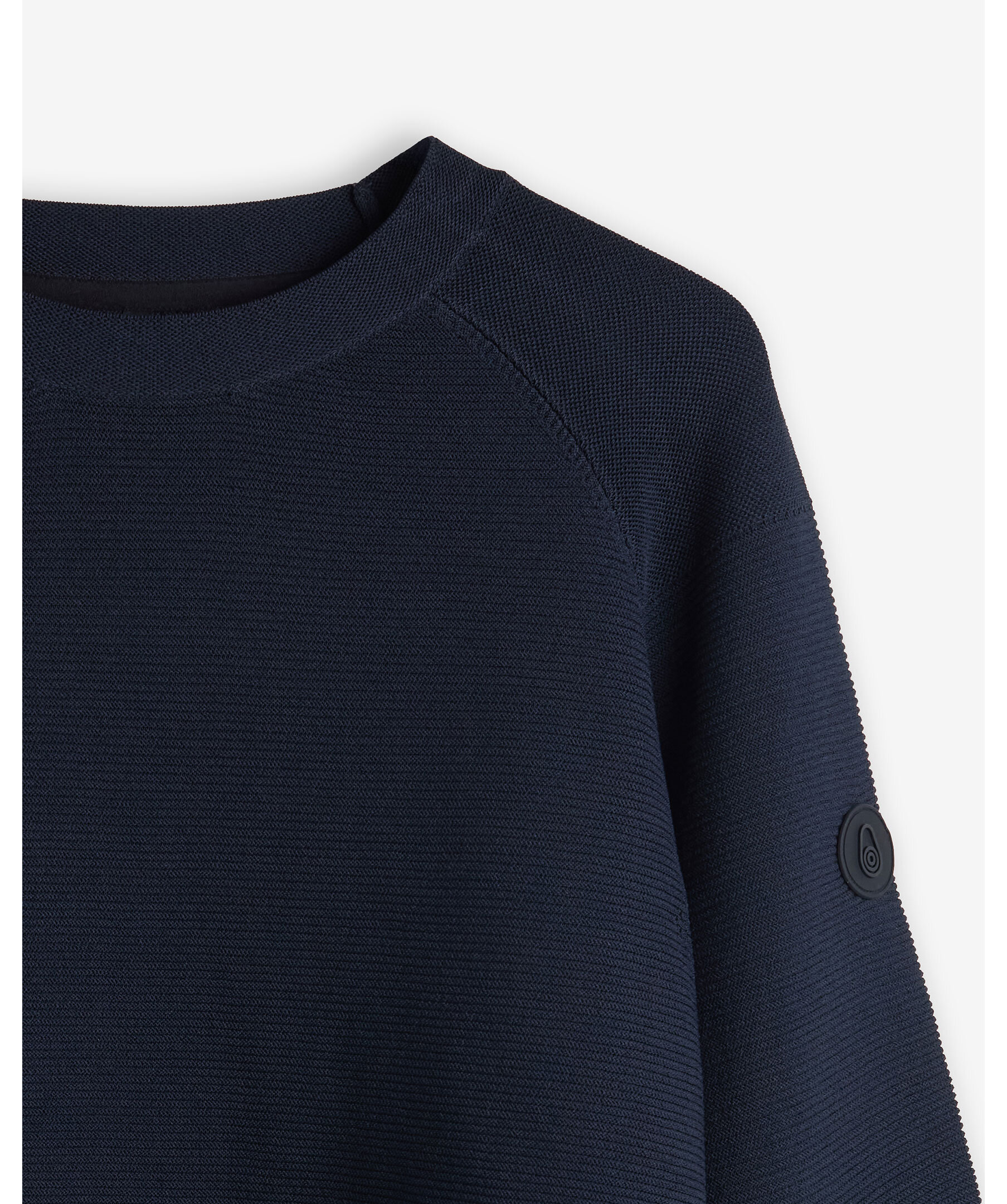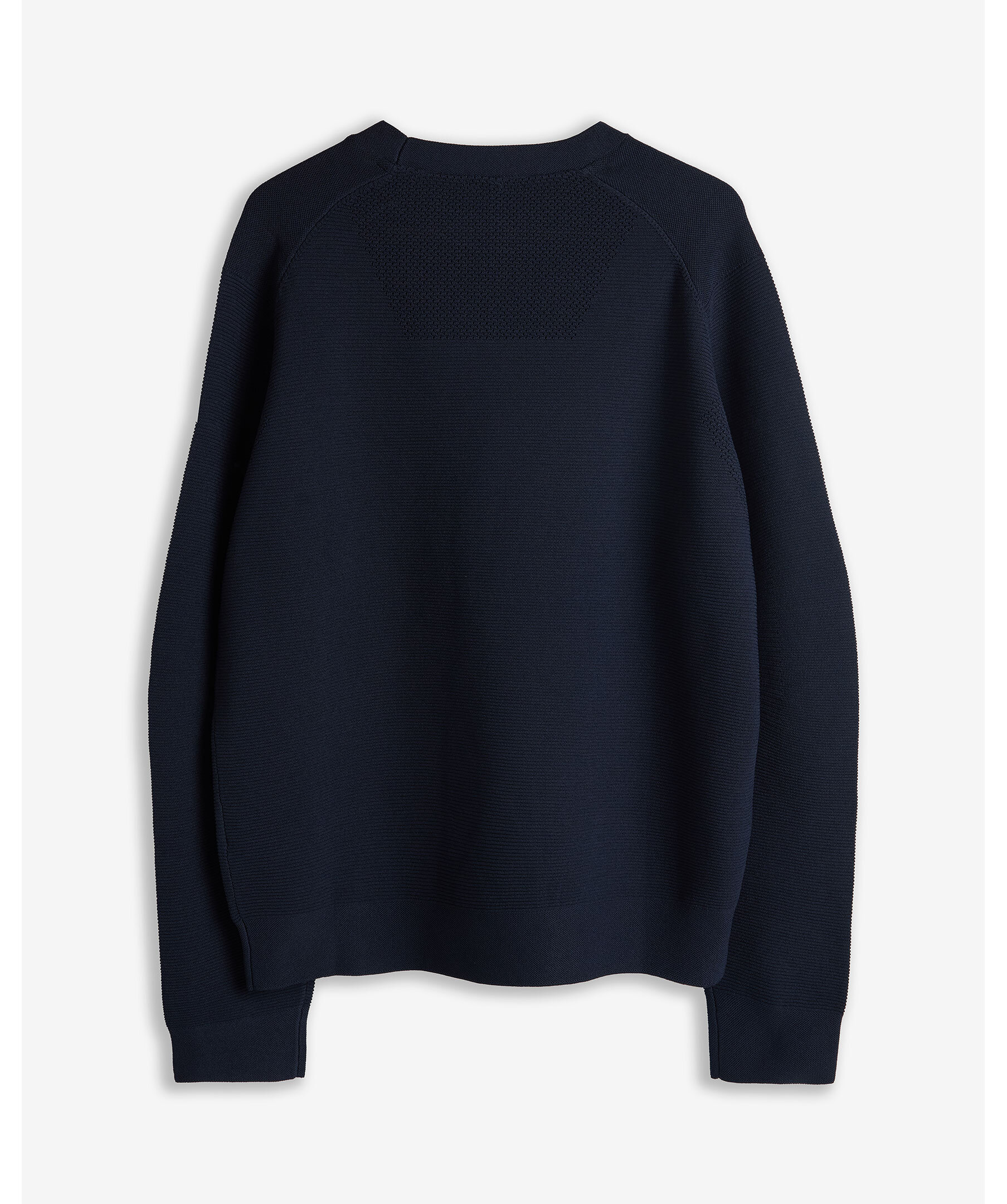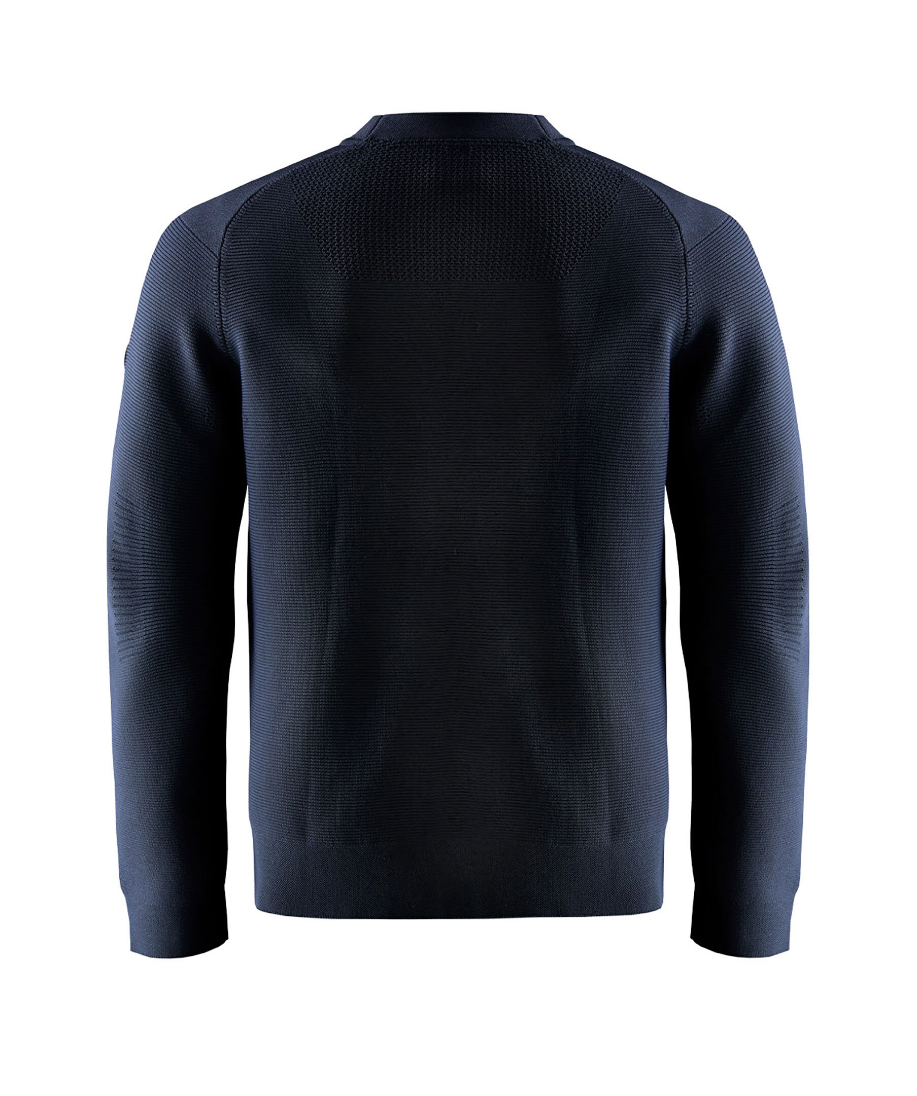 Mörkblå stickad crewneck från Sail Racing. Tröjan har rund halsringning, Sail Racing block-logotyp på vänster ärm samt är designad med flera olika stickningsstrukturer på ärmar, axlar och rygg. Tillverkad i polyester.