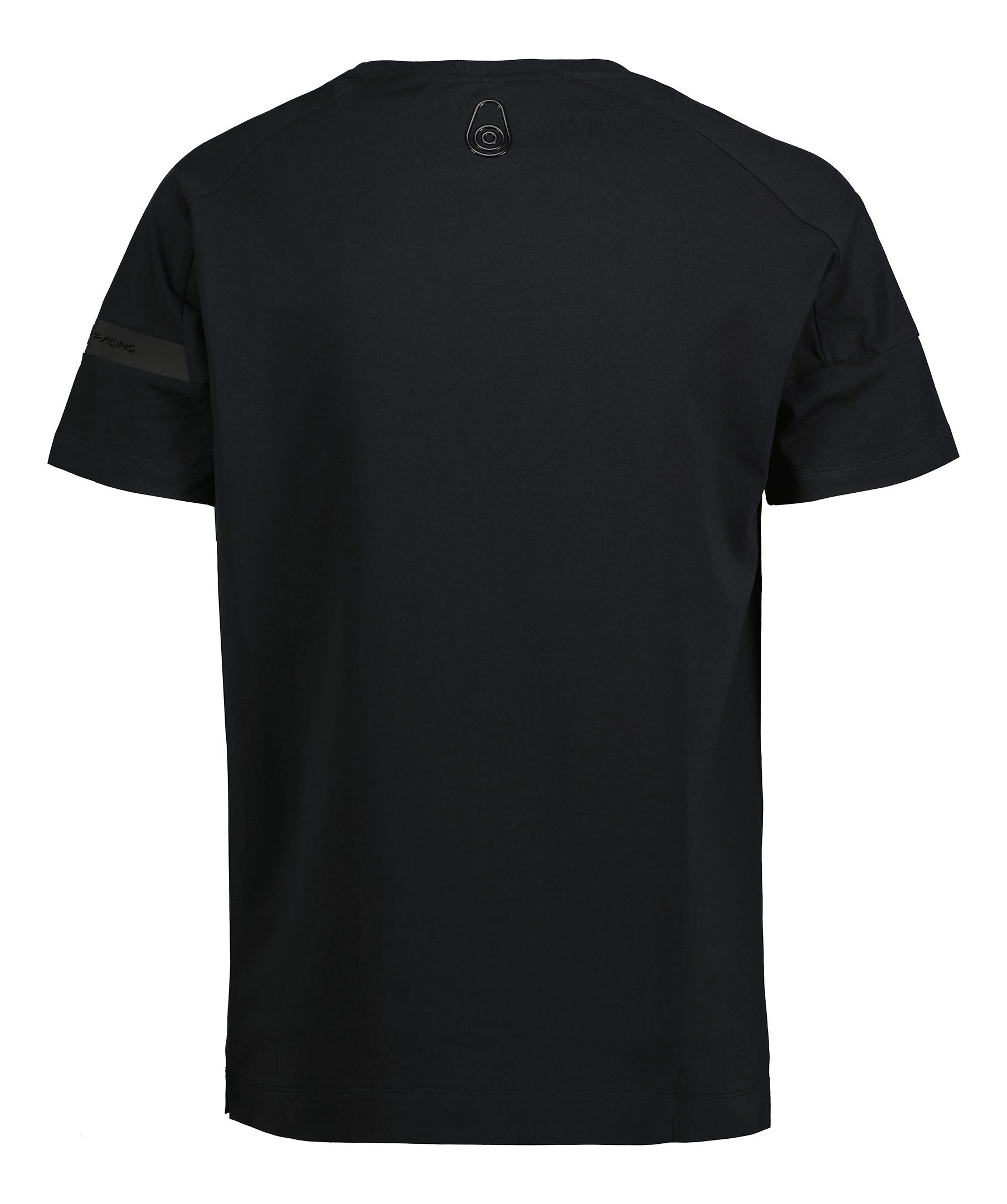 Svart t-shirt från Sail Racing. Tillverkad i en unik blandning av bomull och lycra. T-shirten har ett ribbat avslut kring halsen. Designad med en Sail Racing logotyp på vänster ärm och en blocklogotyp bak i nacken.