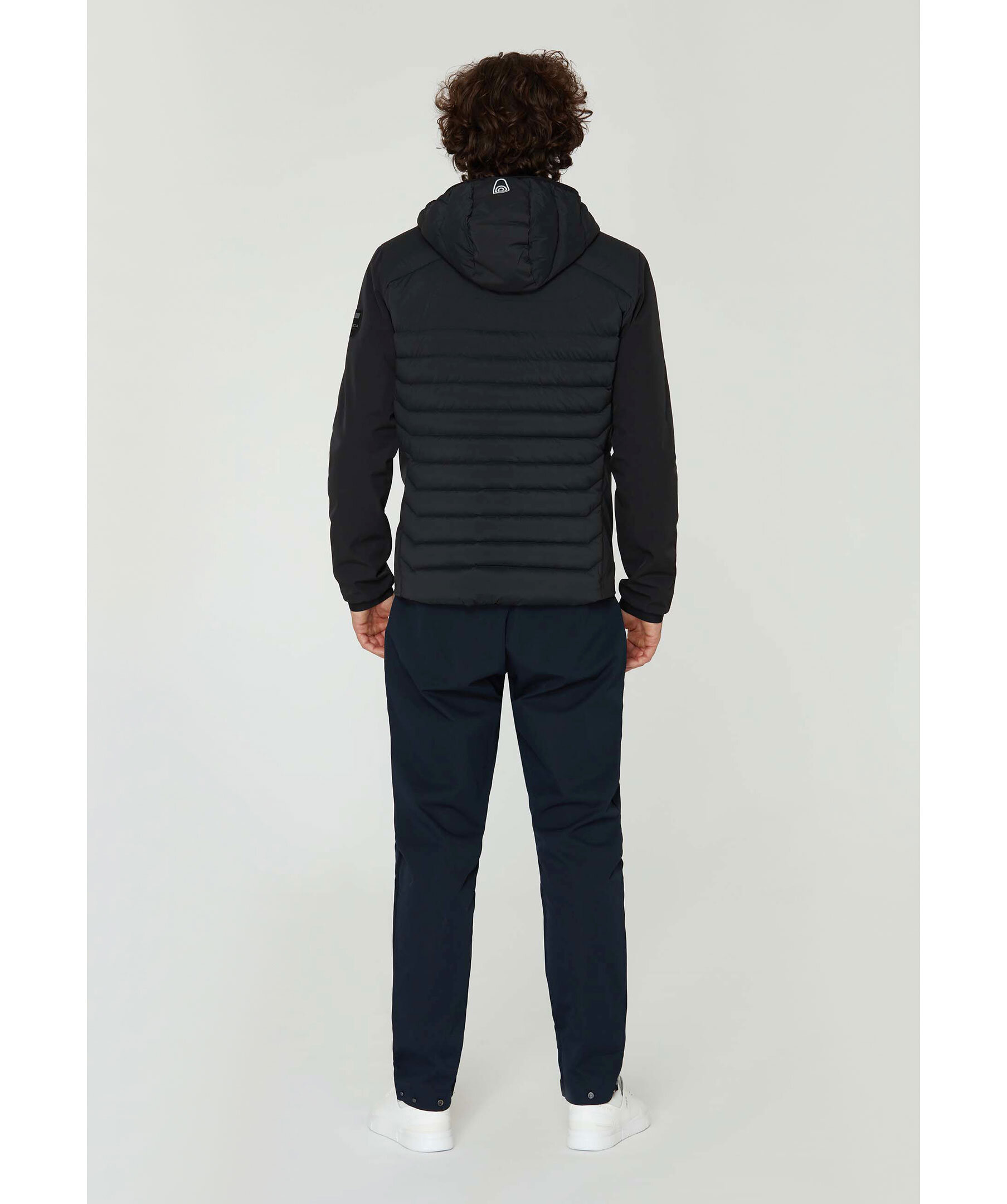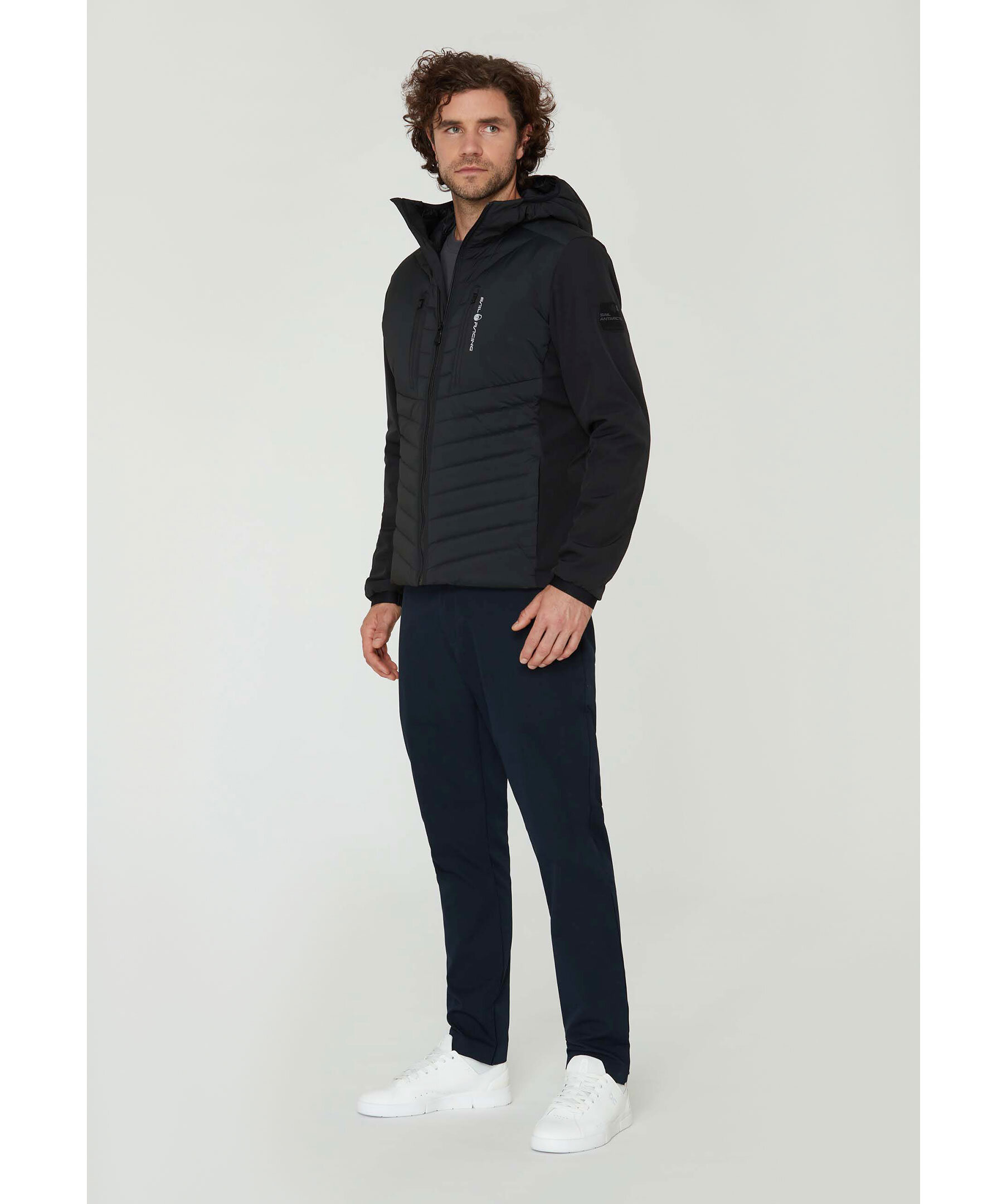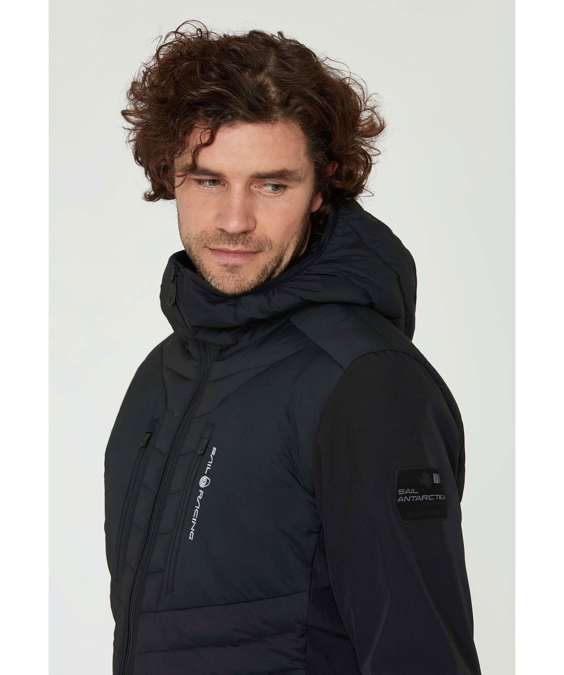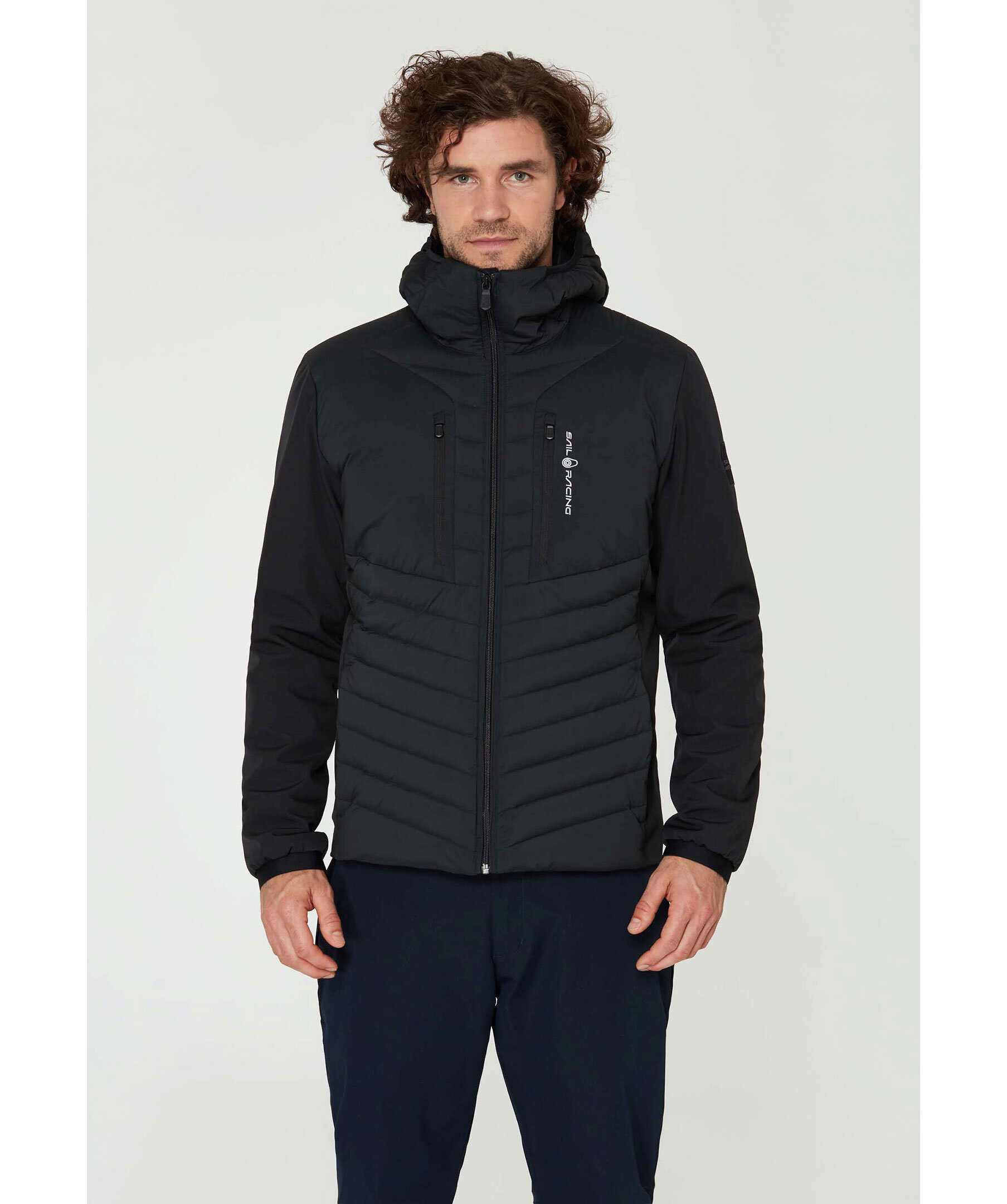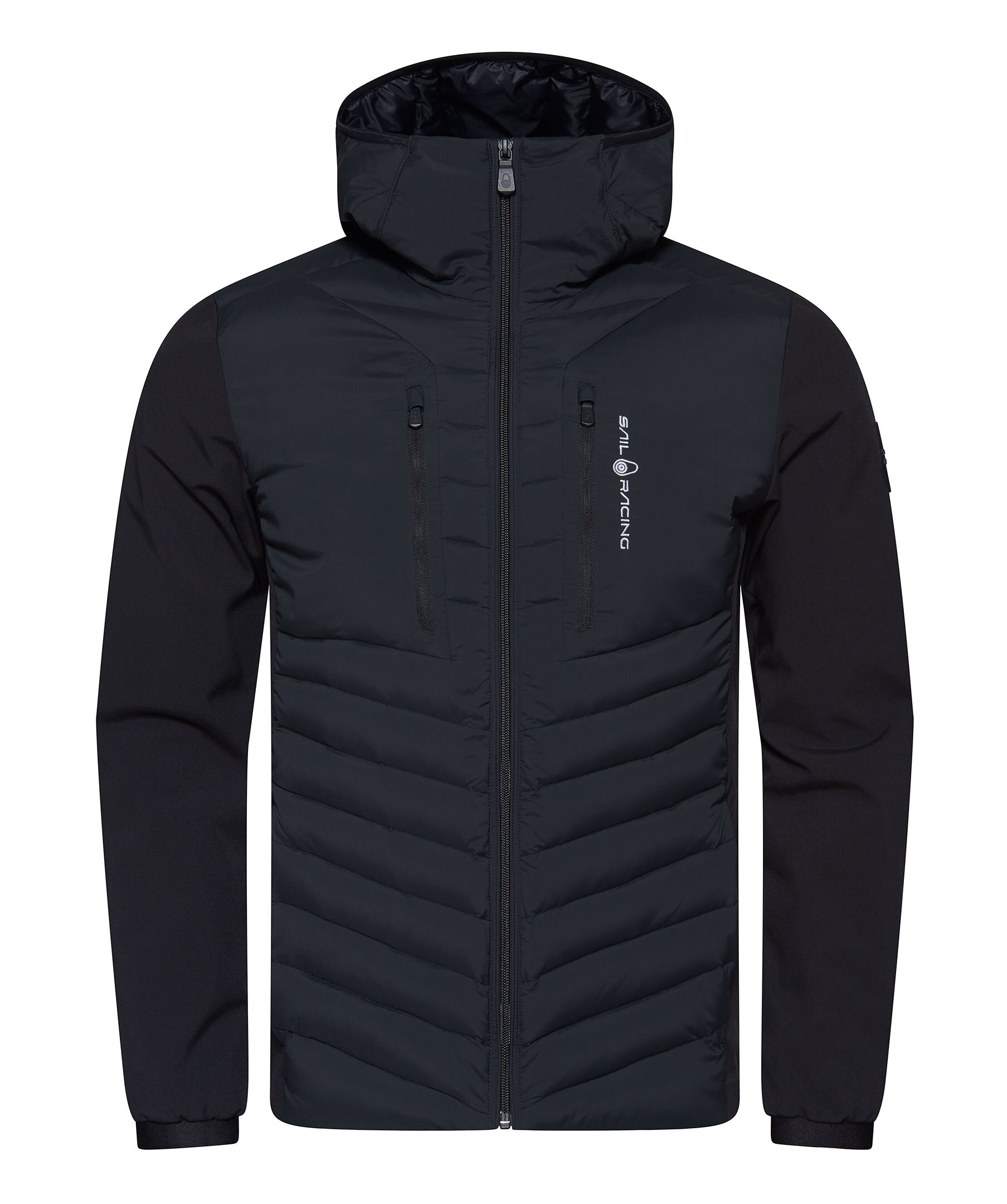 Svart hybrid jacka med dun från Sail Racing. Patrol Hybrid Jacket konstruerad i ett lättvikts 80% nylon och 20% polyuretantyg på kropp och huva. Ärmarna är gjorda i softshelltyg, 95% återvunnen polyester och 5% elastan. DWR-behandlad vattenavvisning. Bröstfickor och midjefickor med dragkedja. Isolerad med 90/10 Blue Sign och RDS-certifierade dun och fjädrar. Fill power: 800. Inre muddar vid ärmslut för bättre komfort och för att hindra vind- och vattenintrång.