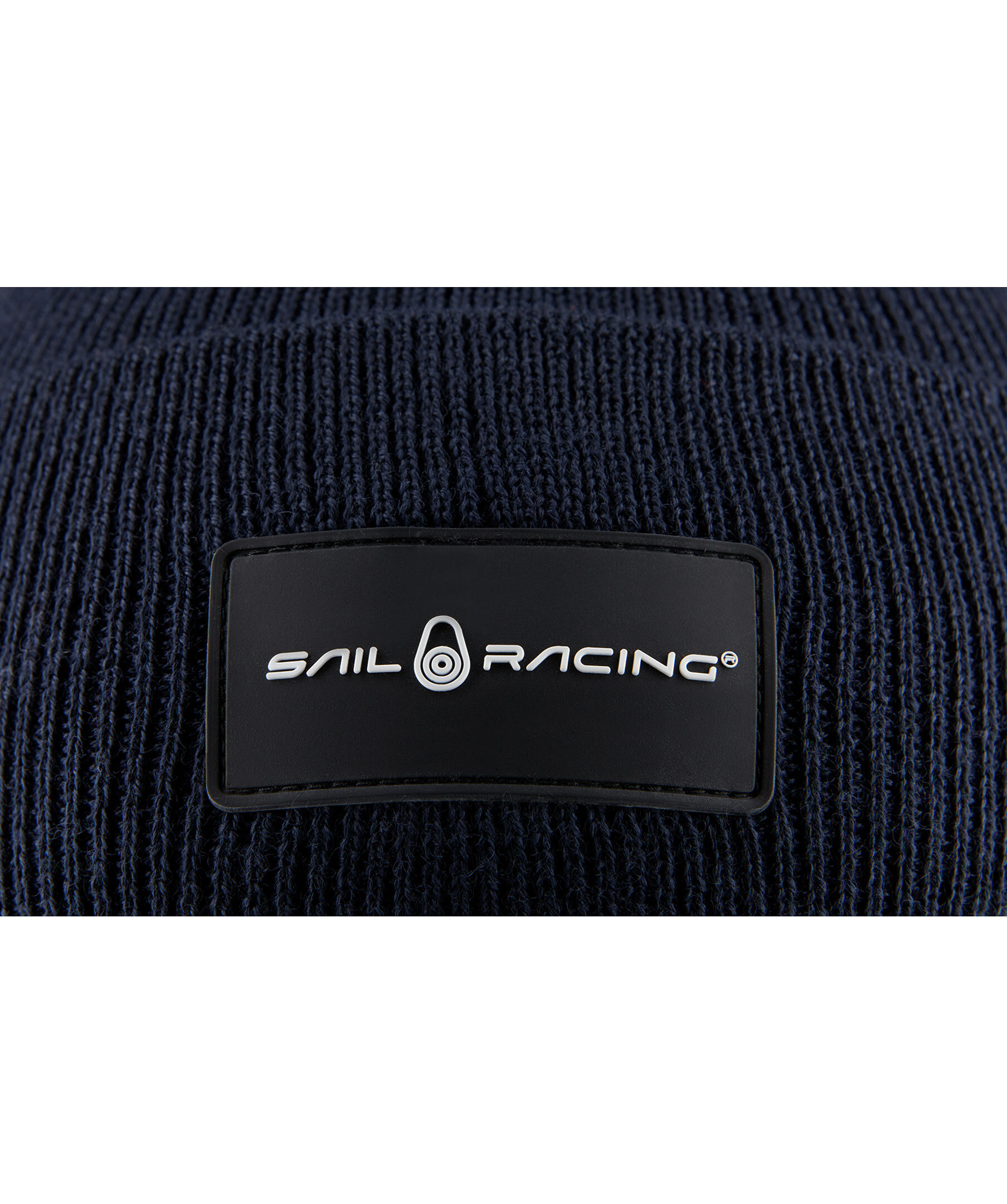 Mörkblå ribbstickad mössa från Sail Racing. Uppvikt kant med logotyp. Gjord i en ullblandning.