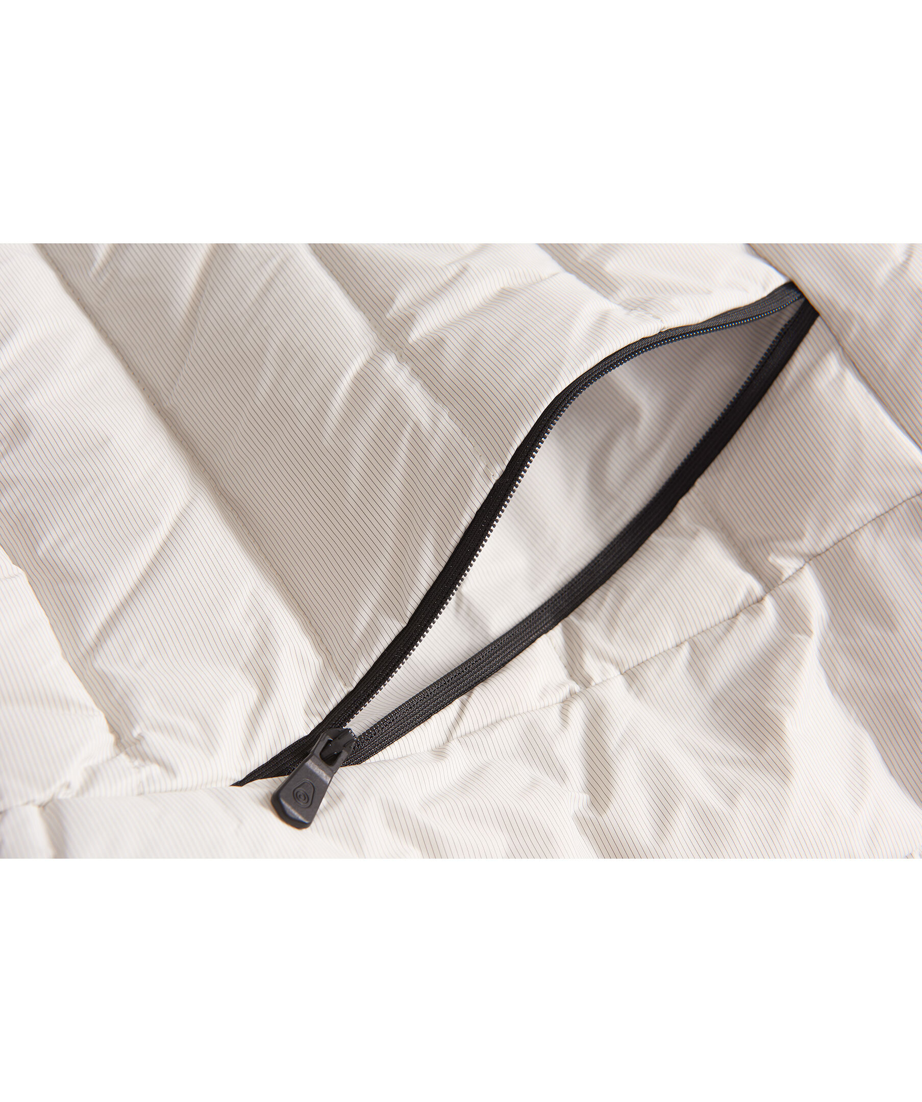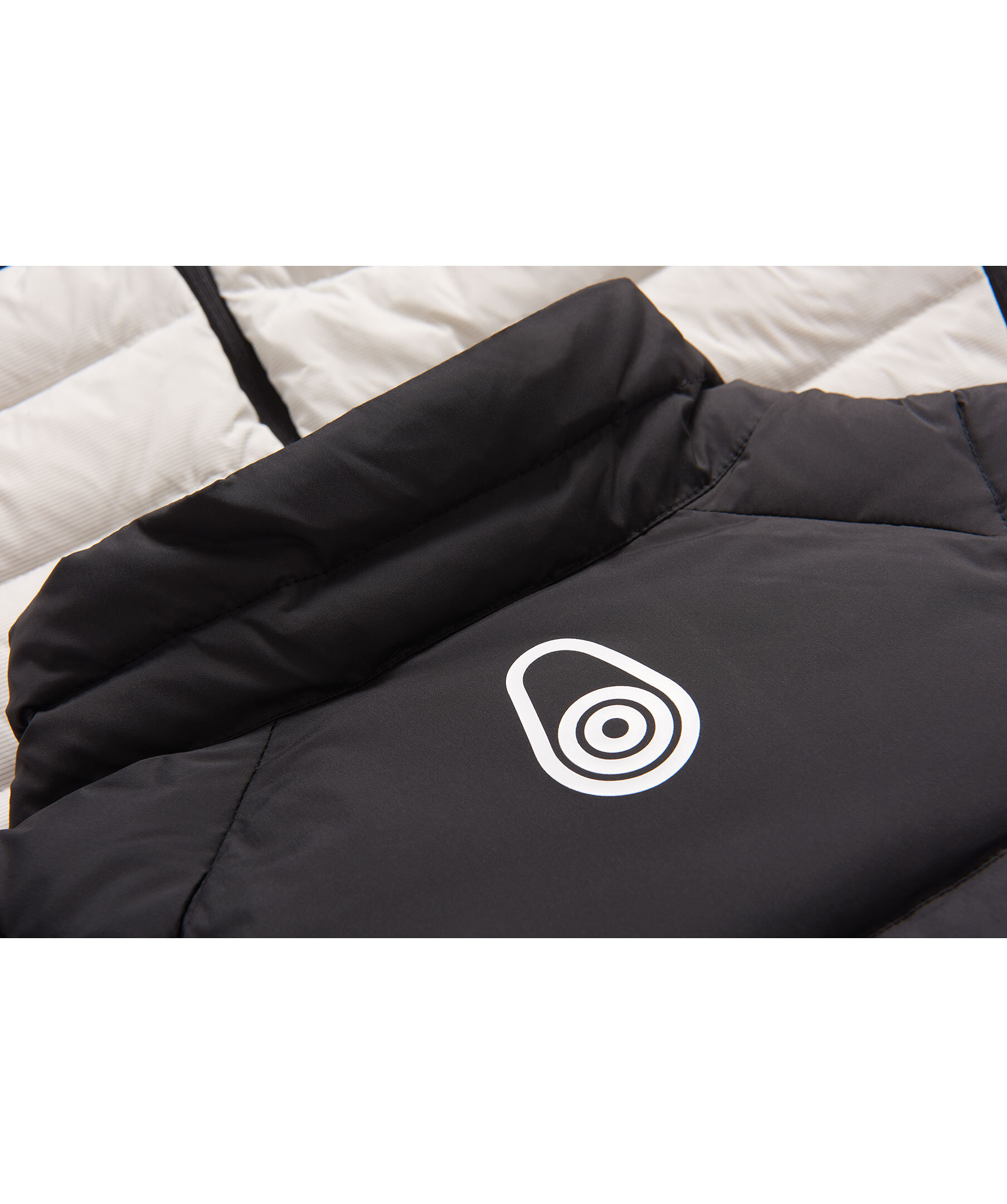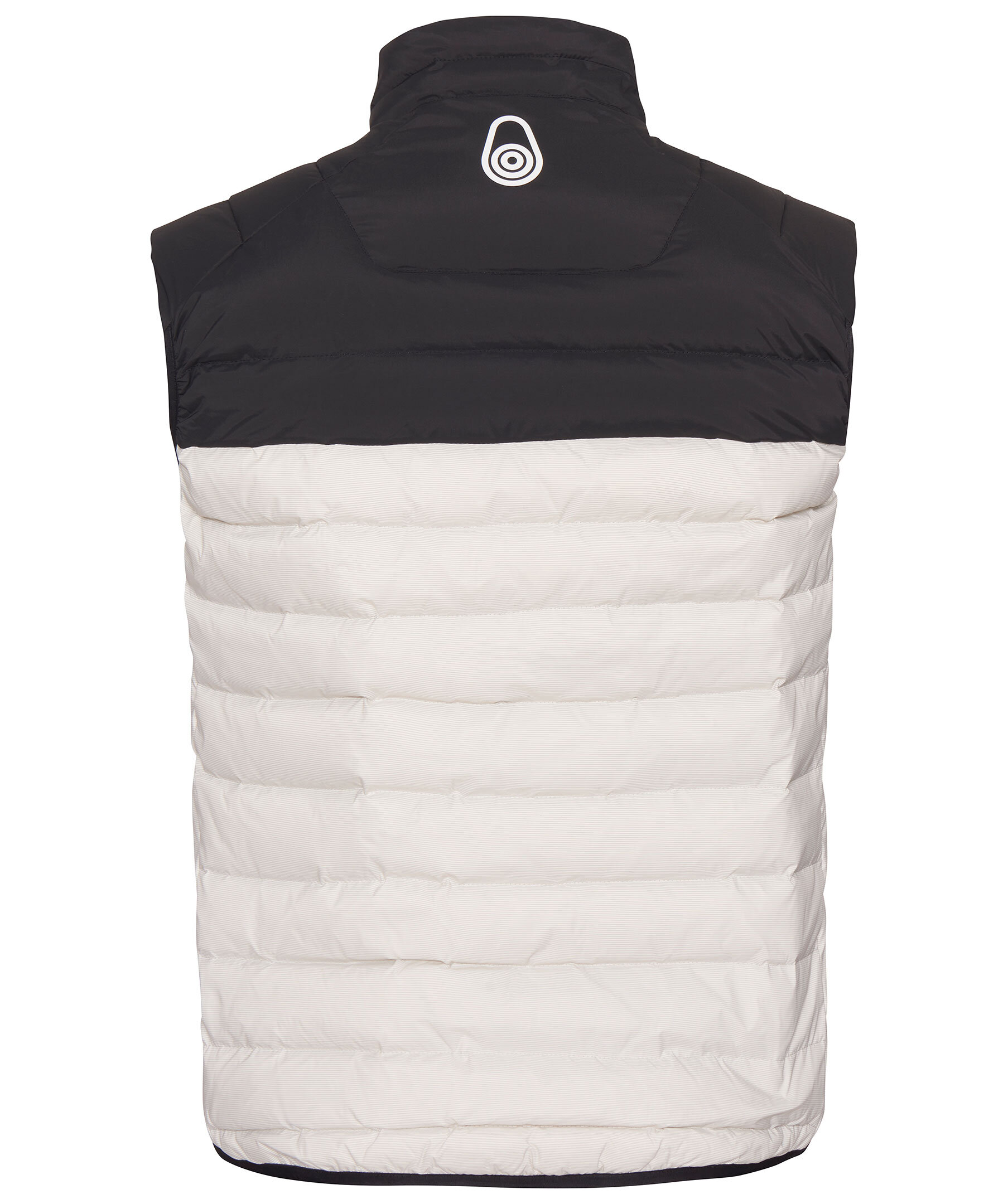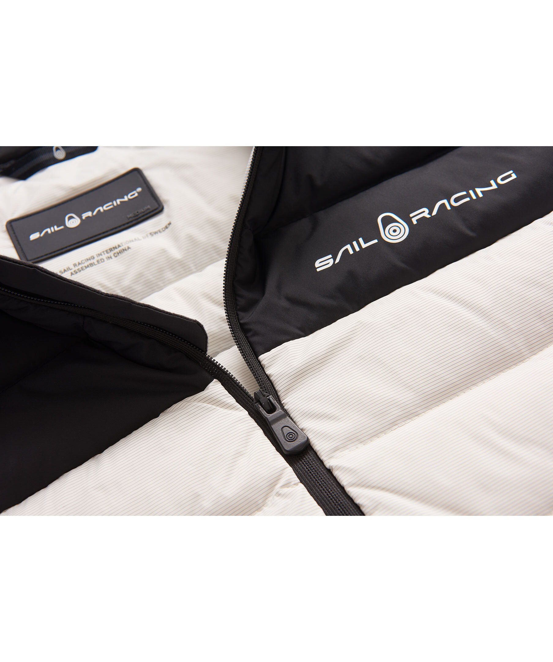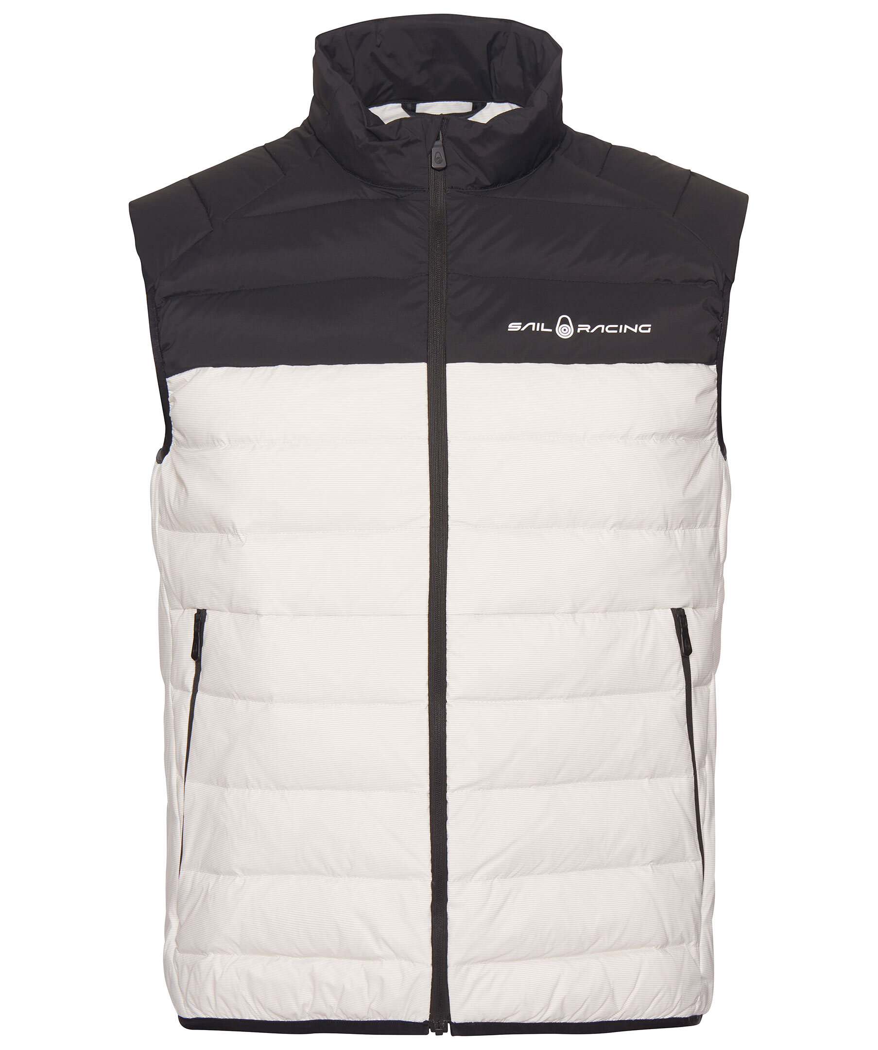 Vit dunväst med tunna ränder och svarta blockdetaljer från Sail Racing. Logotyp tryckt på bröstet och i nacken, två fleecefodrade framfickor med svart dragkedja och en innerficka. Stängs med svart dragkedja fram.