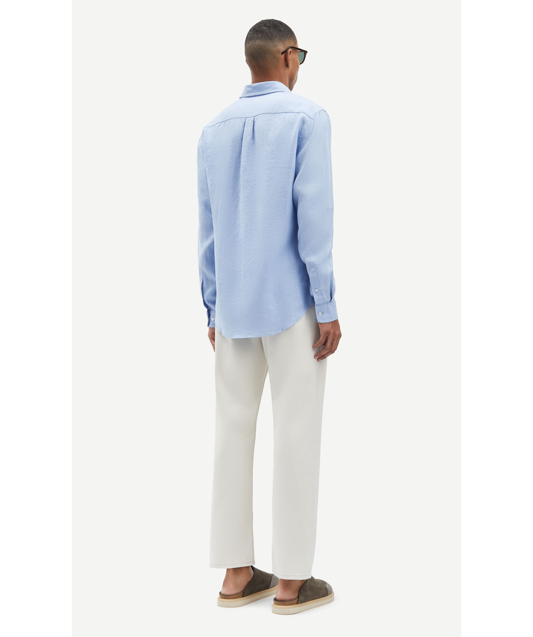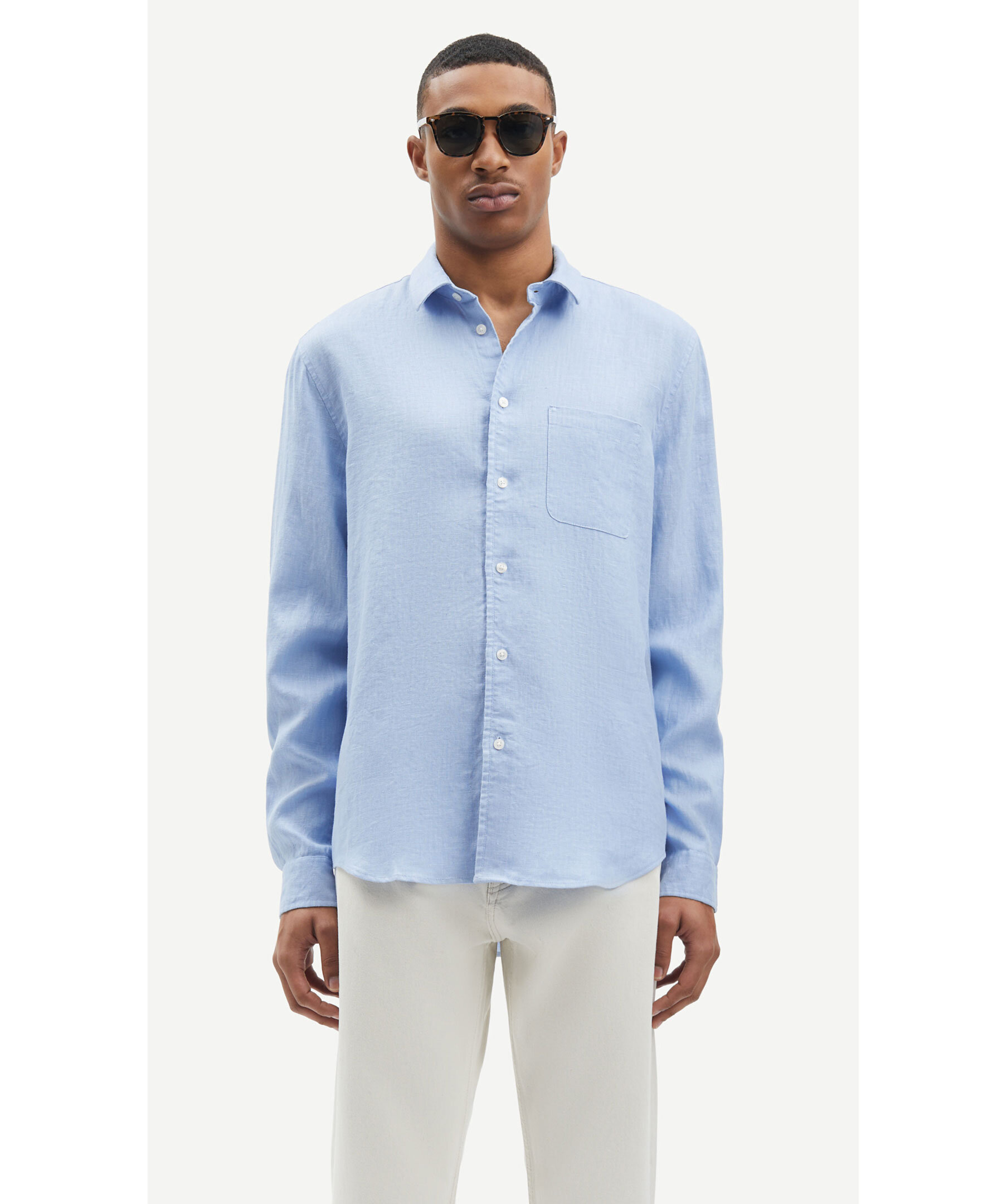 Ljusblå linne skjorta från Samsoe Samsoe. Stängs framtill med knappar. Bröstficka på vänster sida. Spetsig krage. Enkla manschetter vid ärmslut. Tillverkad i 100% Linne. Boxpleat på ryggen.