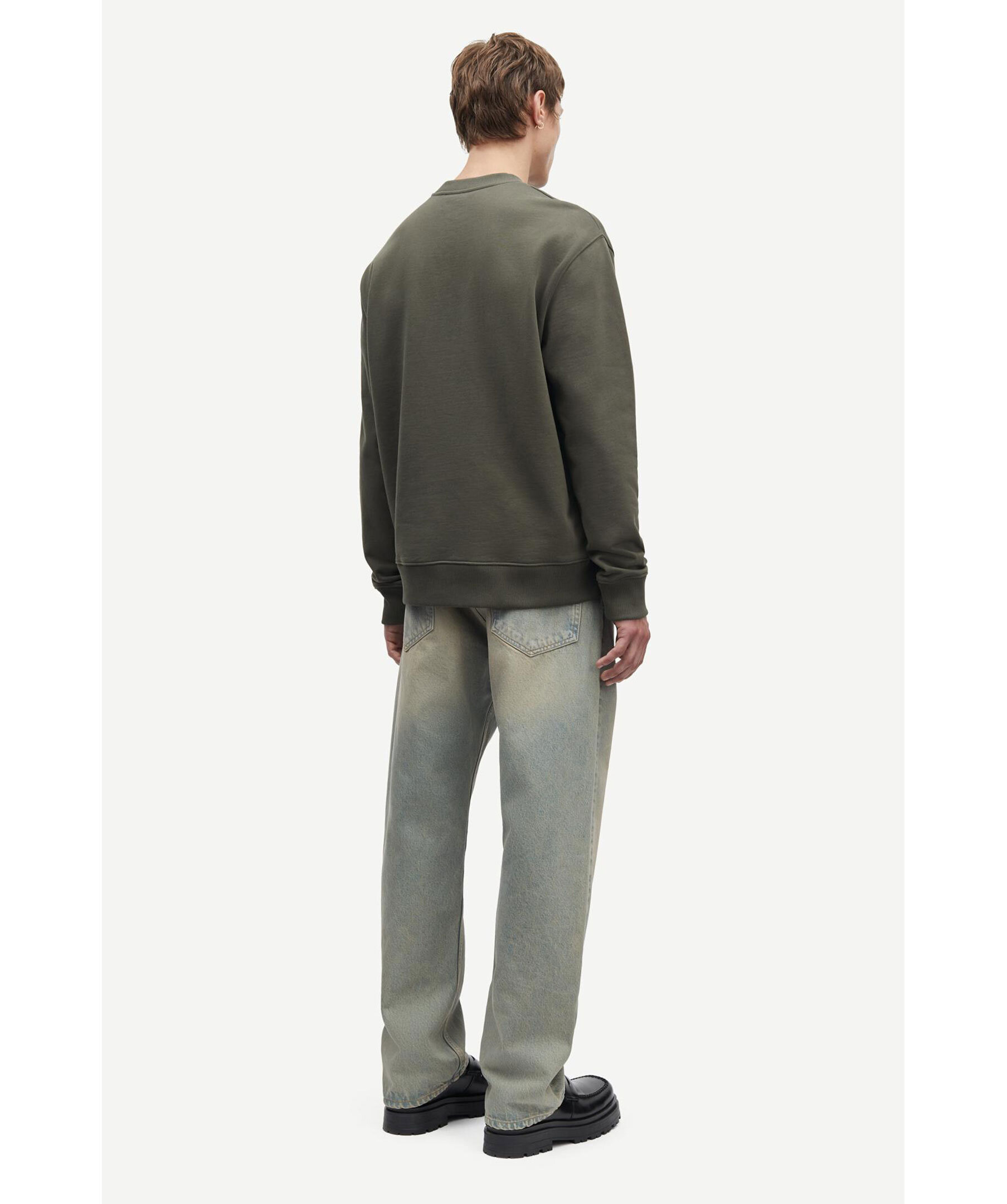Grön sweatshirt från Samsoe Samsoe. Tryckt logotyp i vitt på vänster bröst. Rundad halsringning, med ribbstickad mudd, ribbstickade muddar vid ärm- och plaggslut. Borstad insida.