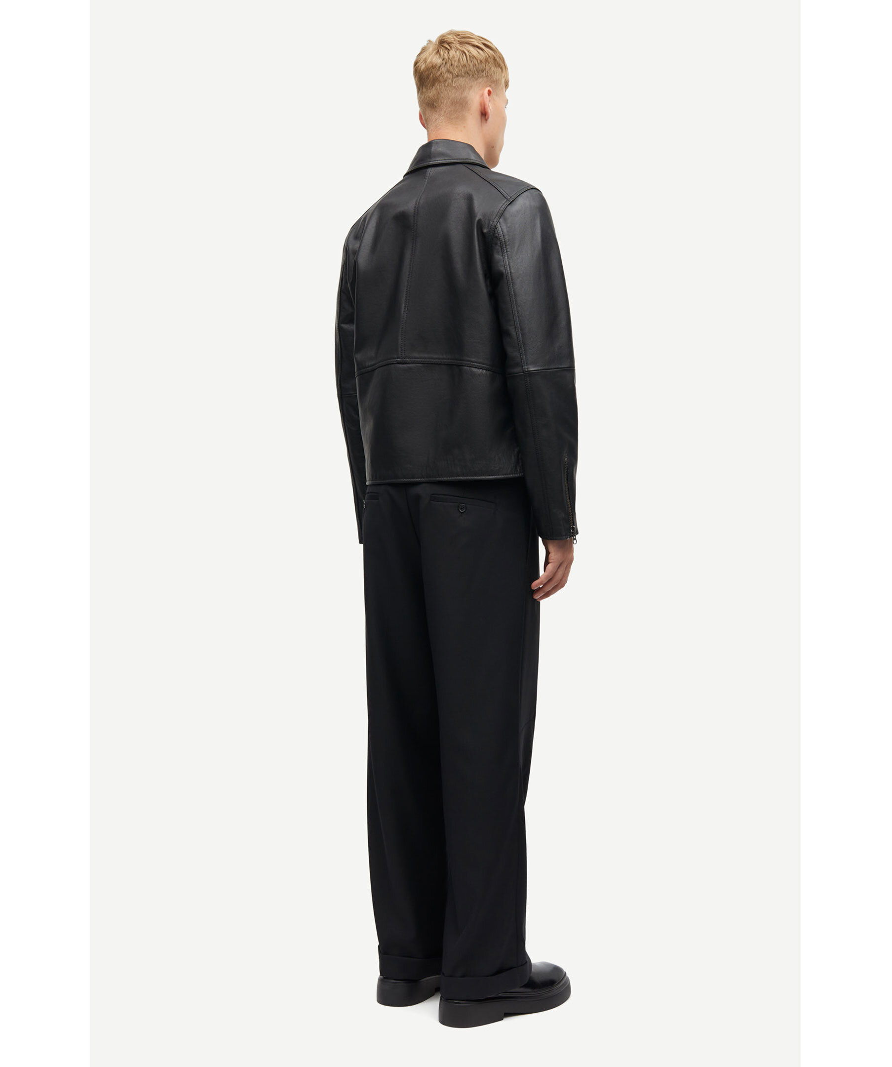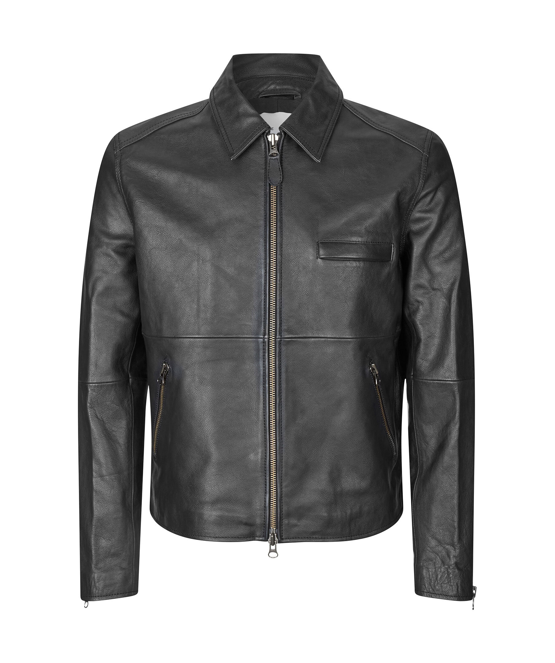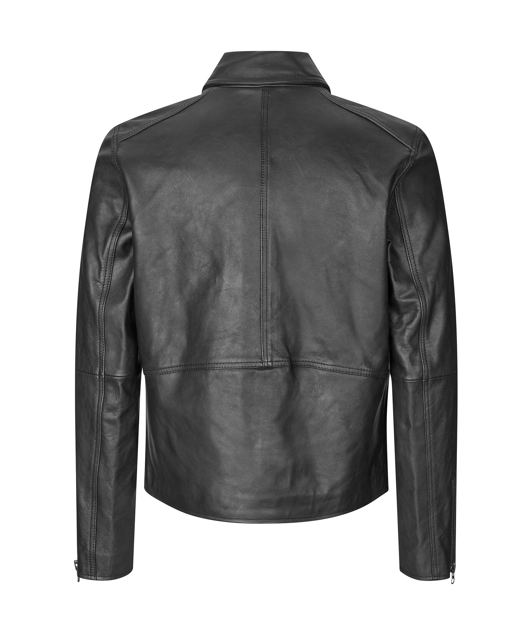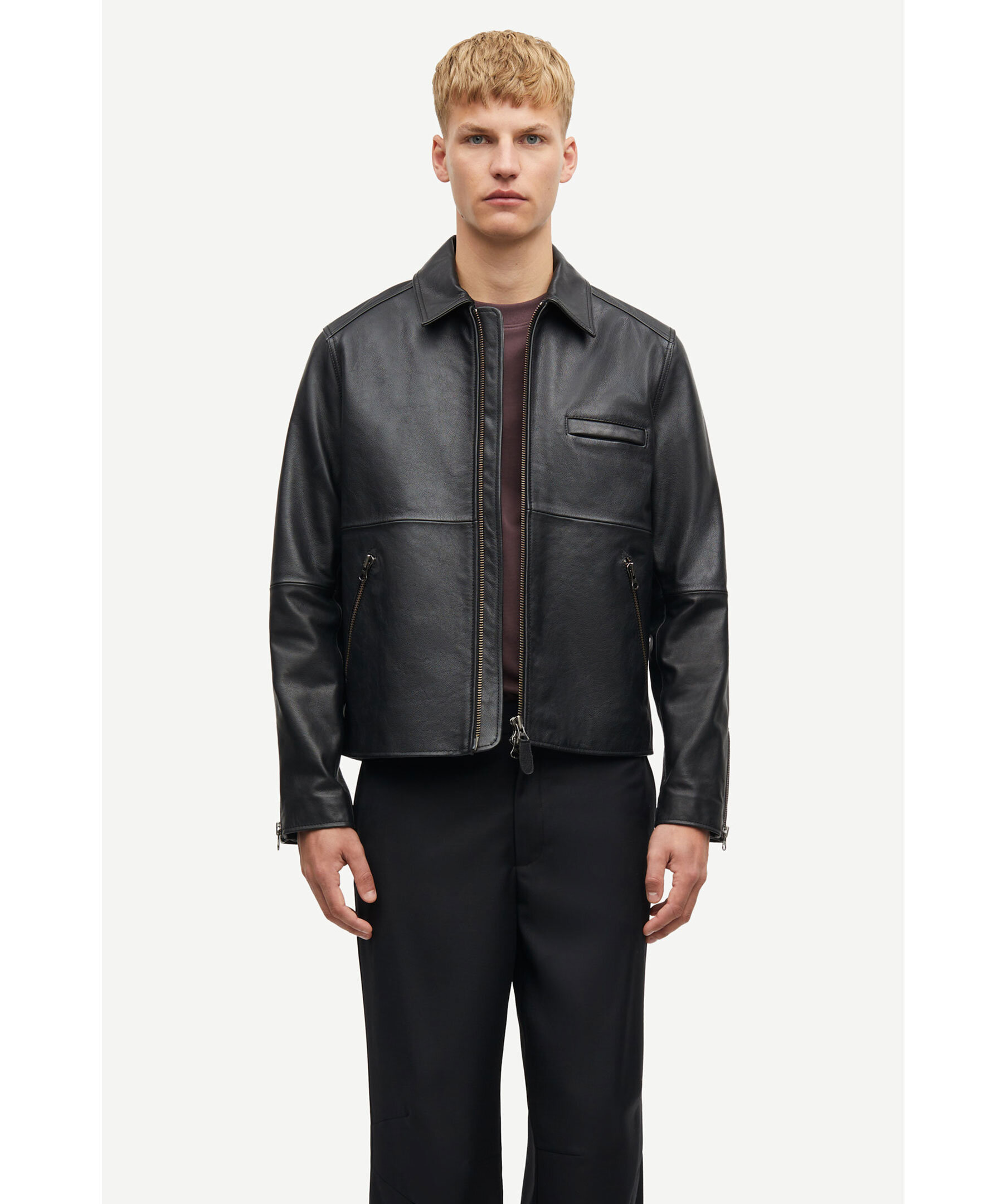 Svart skinnjacka från Samsoe Samsoe. Jackan stäng med tvåvägsdragkedja och har två sidfickor med dragkedja samt en bröstficka och dragkedjedetaljer vid ärmslut. Tillverkad i skinn med foder i bomull.