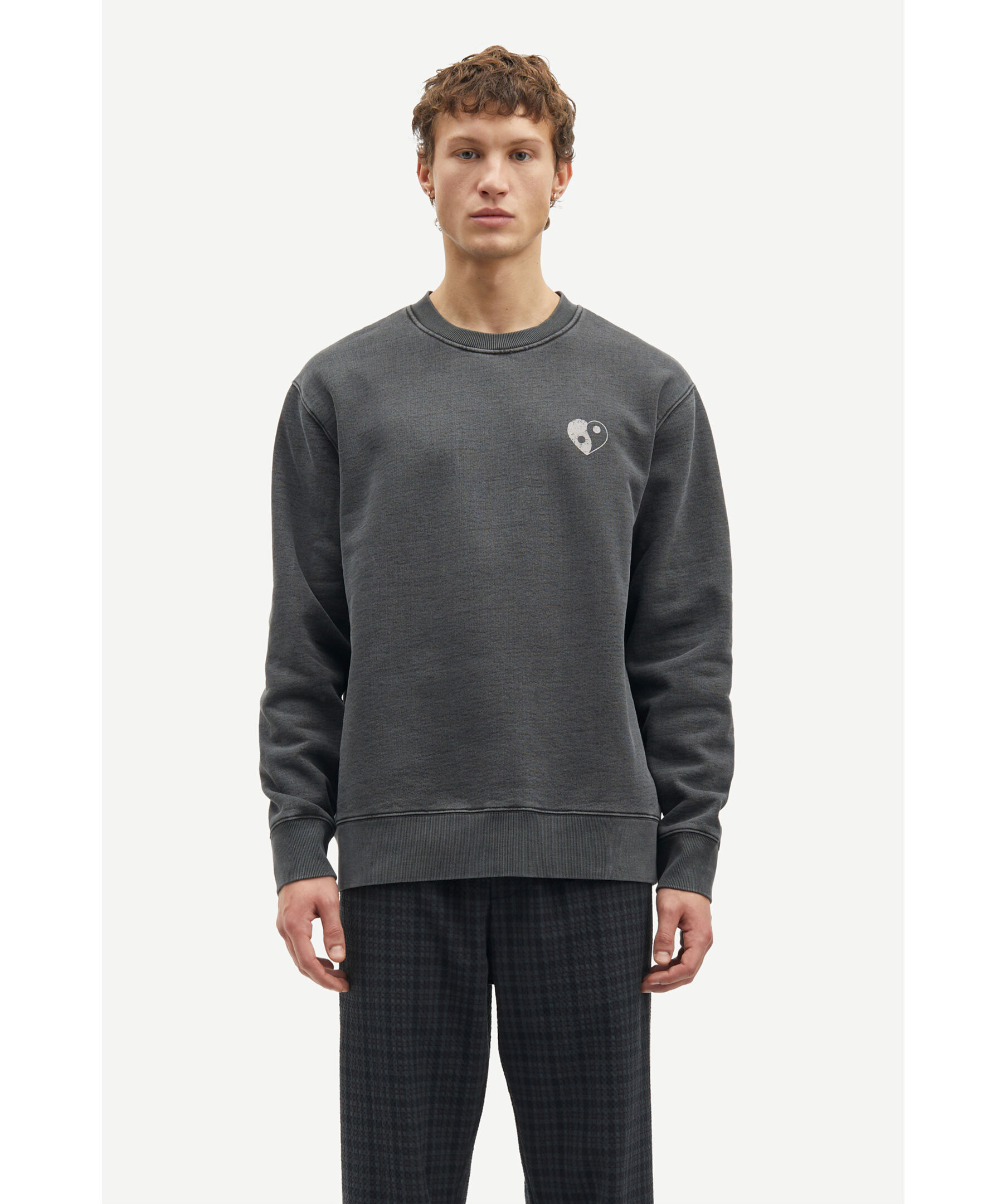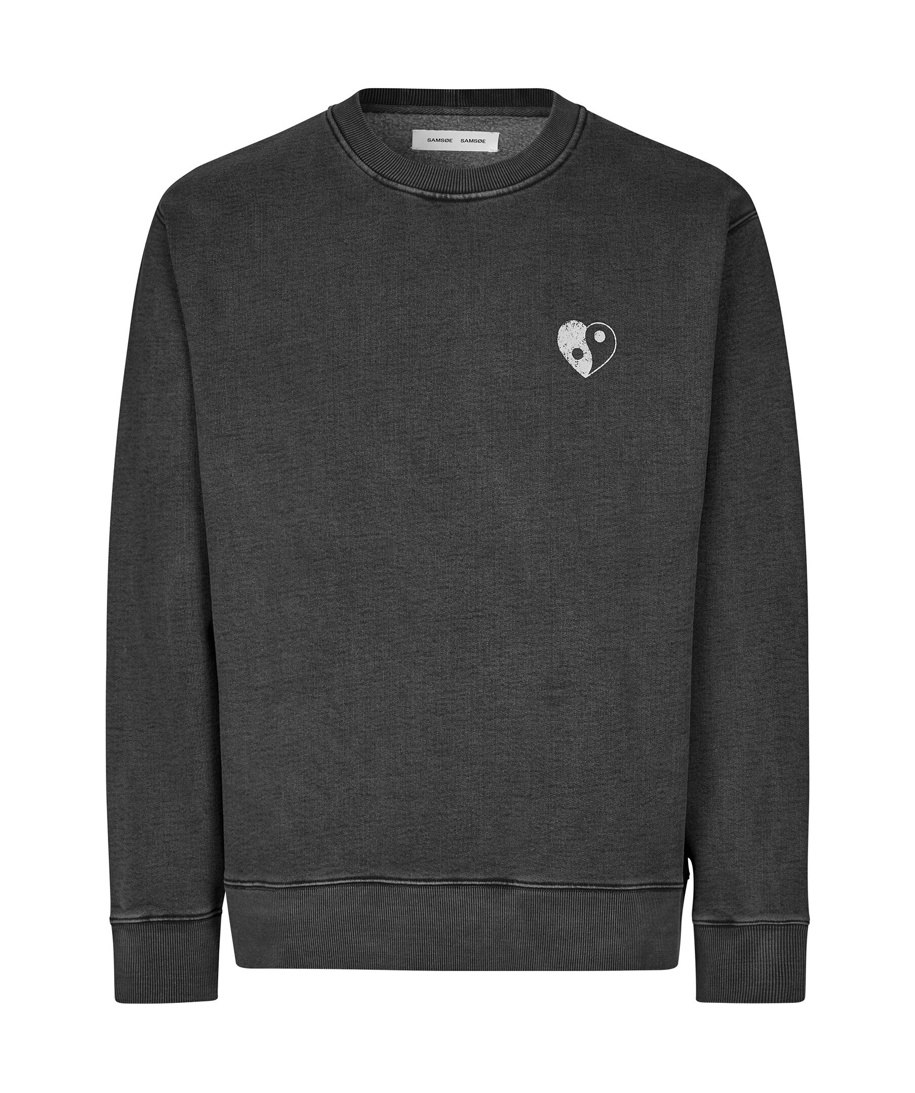 Grå sweatshirt från Samsoe Samsoe i en urtvättad look. Sweatshirten har rund och ribbstickad halsringning, ribbstickade muddar vid ärm- och plaggslut samt tryck fram och bak. Tillverkad i en bomullsblandning.