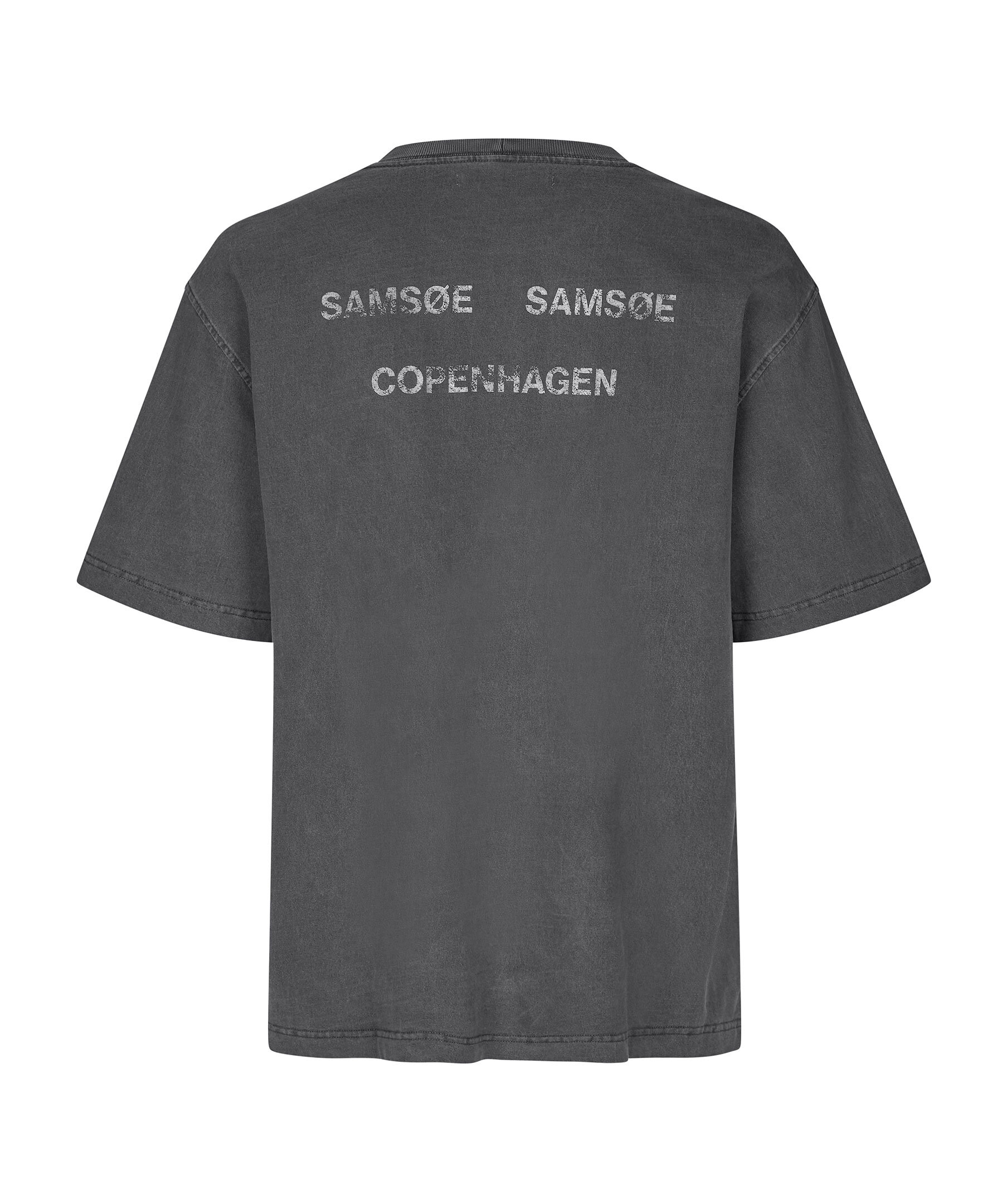 Grå t-shirt från Samsoe Samsoe i en urtvättad look. T-shirten har rund halsringning samt tryck fram och bak. Tillverkad i bomull.