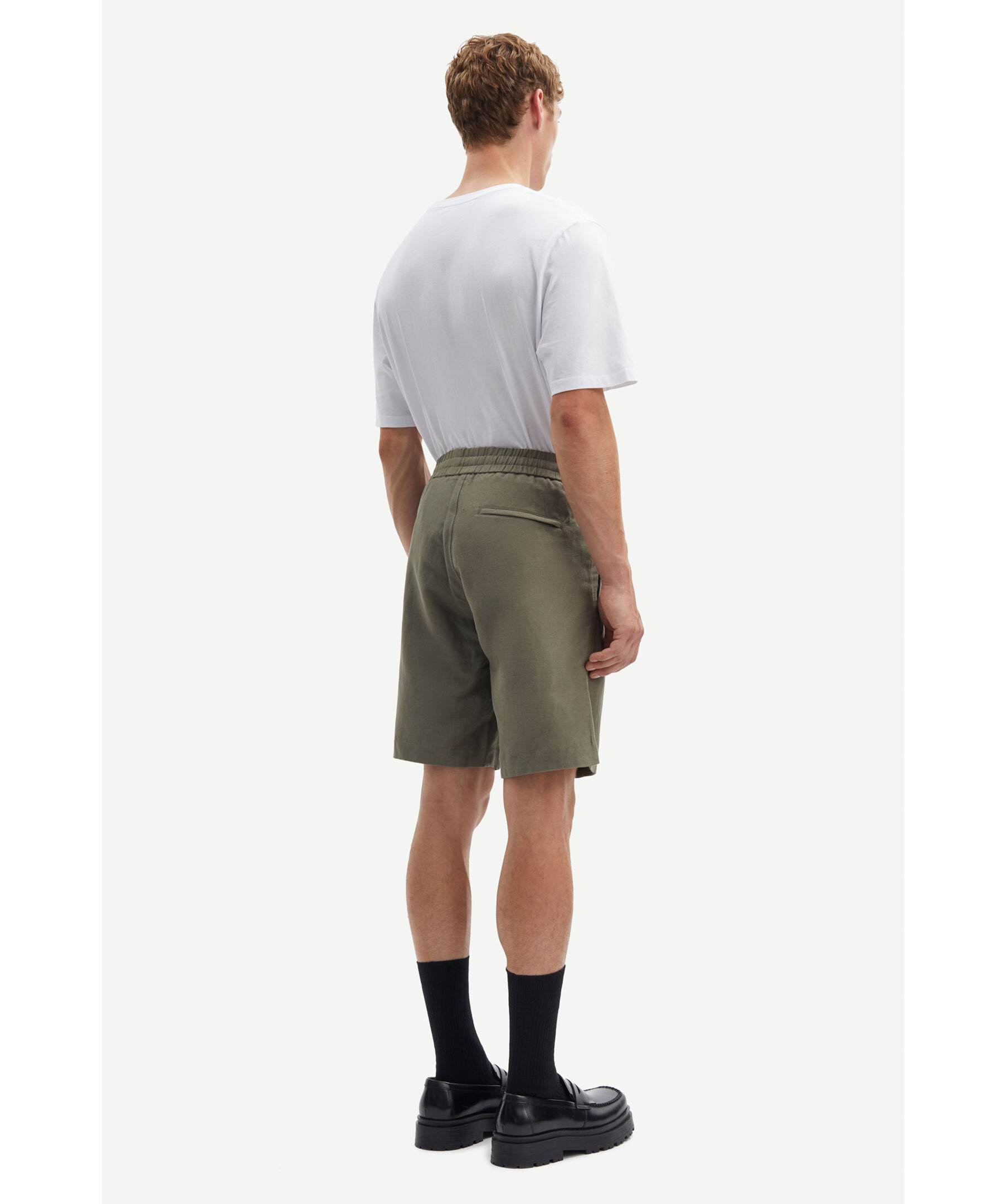 Olivgröna shorts från Samsoe Samsoe. Resår och dragsko i midjan. Två sidfickor samt en bakficka med dragkedja. Tillverkad i en linneblandning. Normal passform.