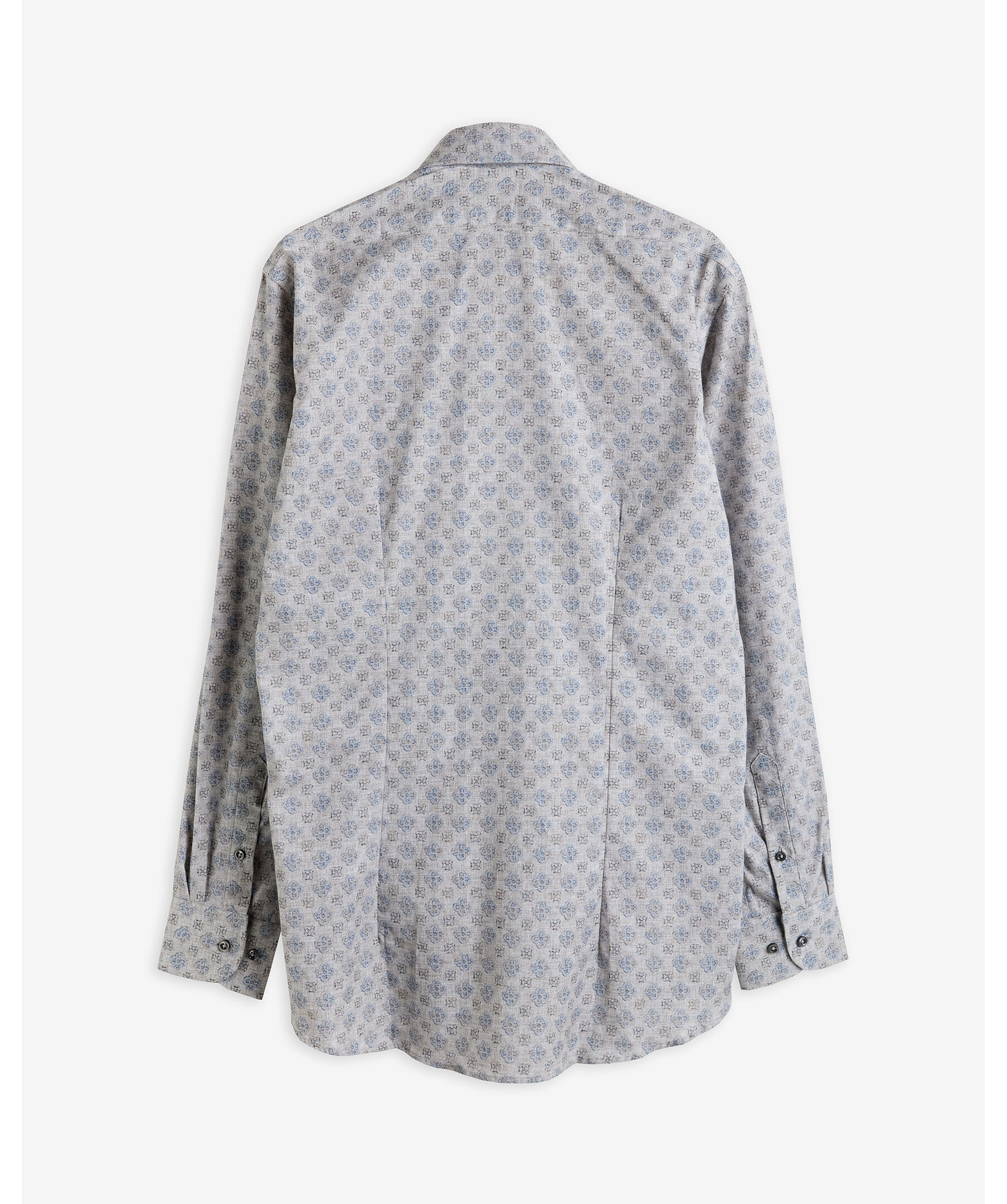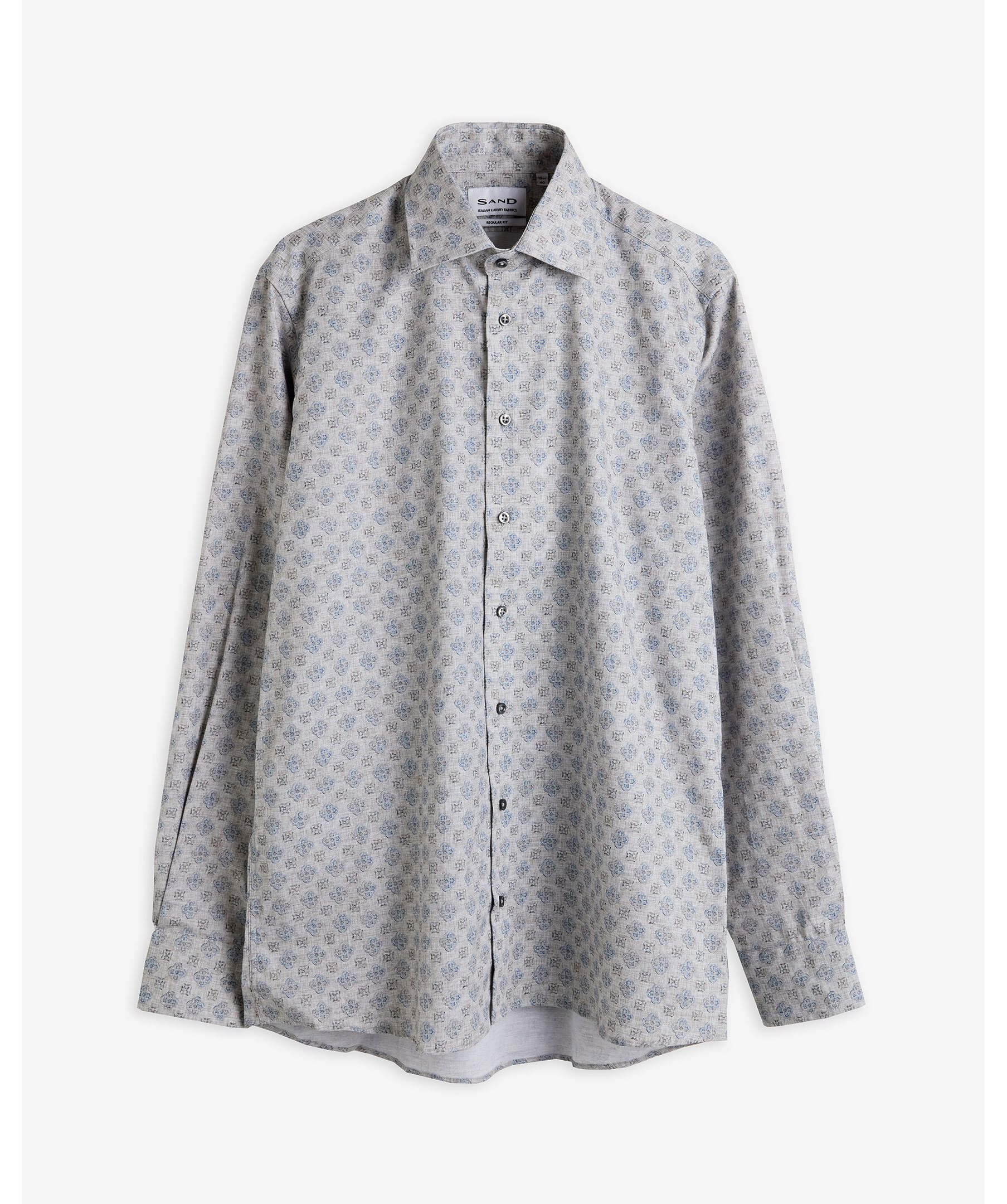 Grå skjorta med blått mönster från SAND. Skjortan stängs med knappar framtill och har en spetsig krage. Tillverkad i lätt och mjukt bomullstyg från Italien. En stilren skjorta som fungerar till både vardag och mer uppklädda tillfällen.