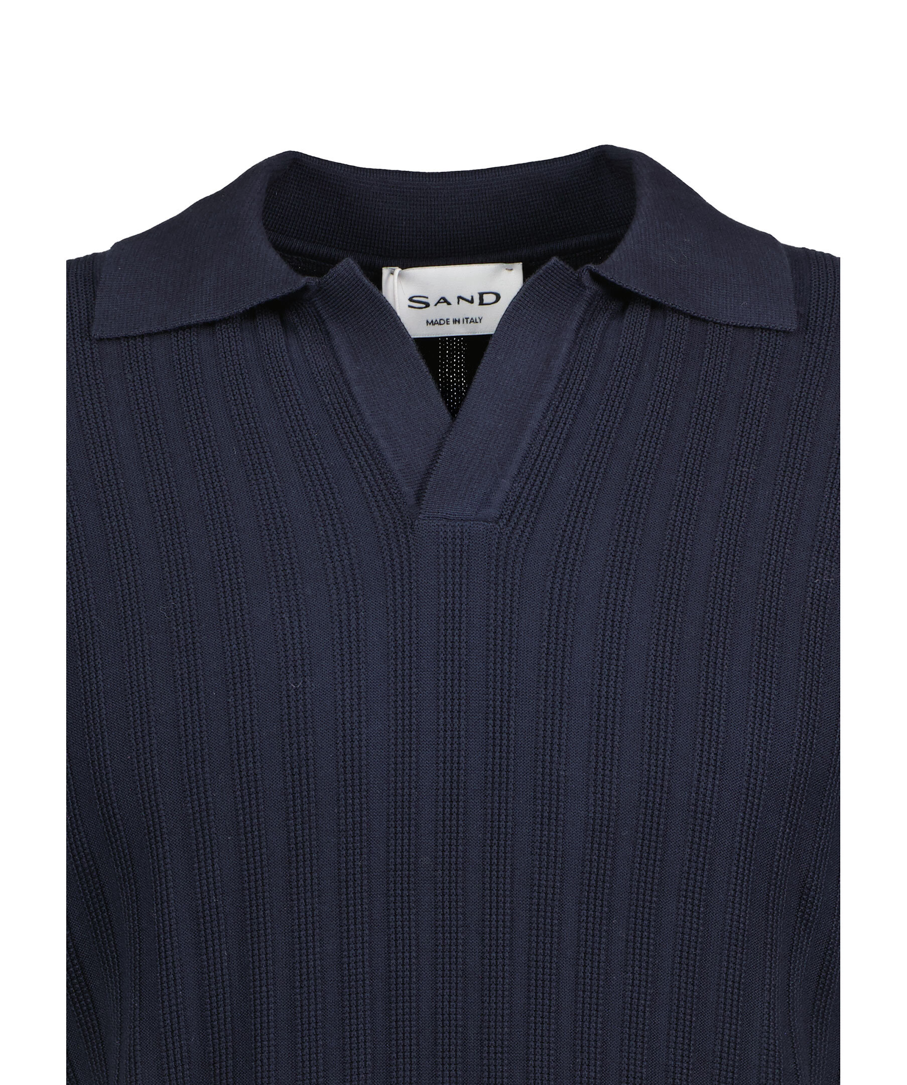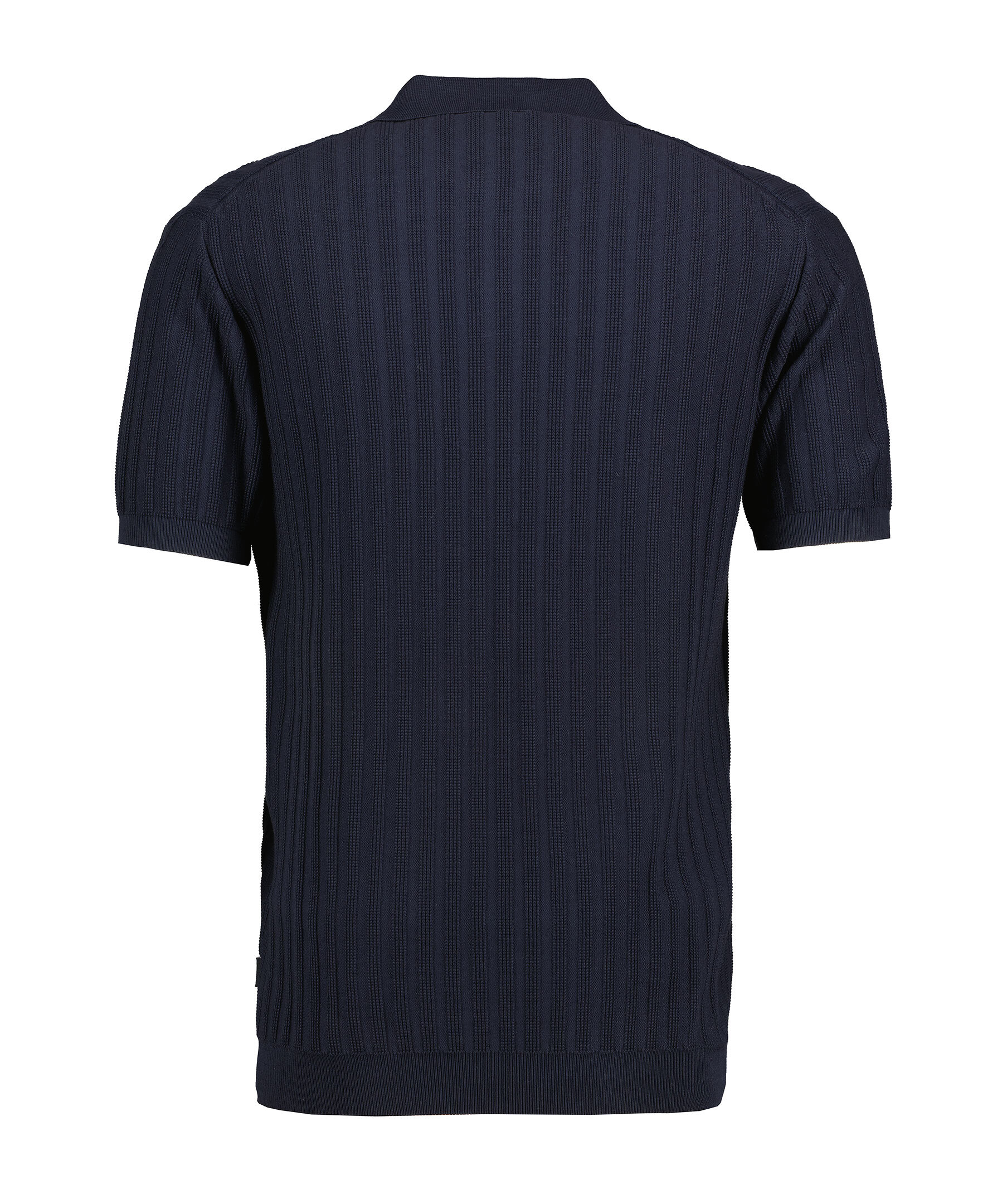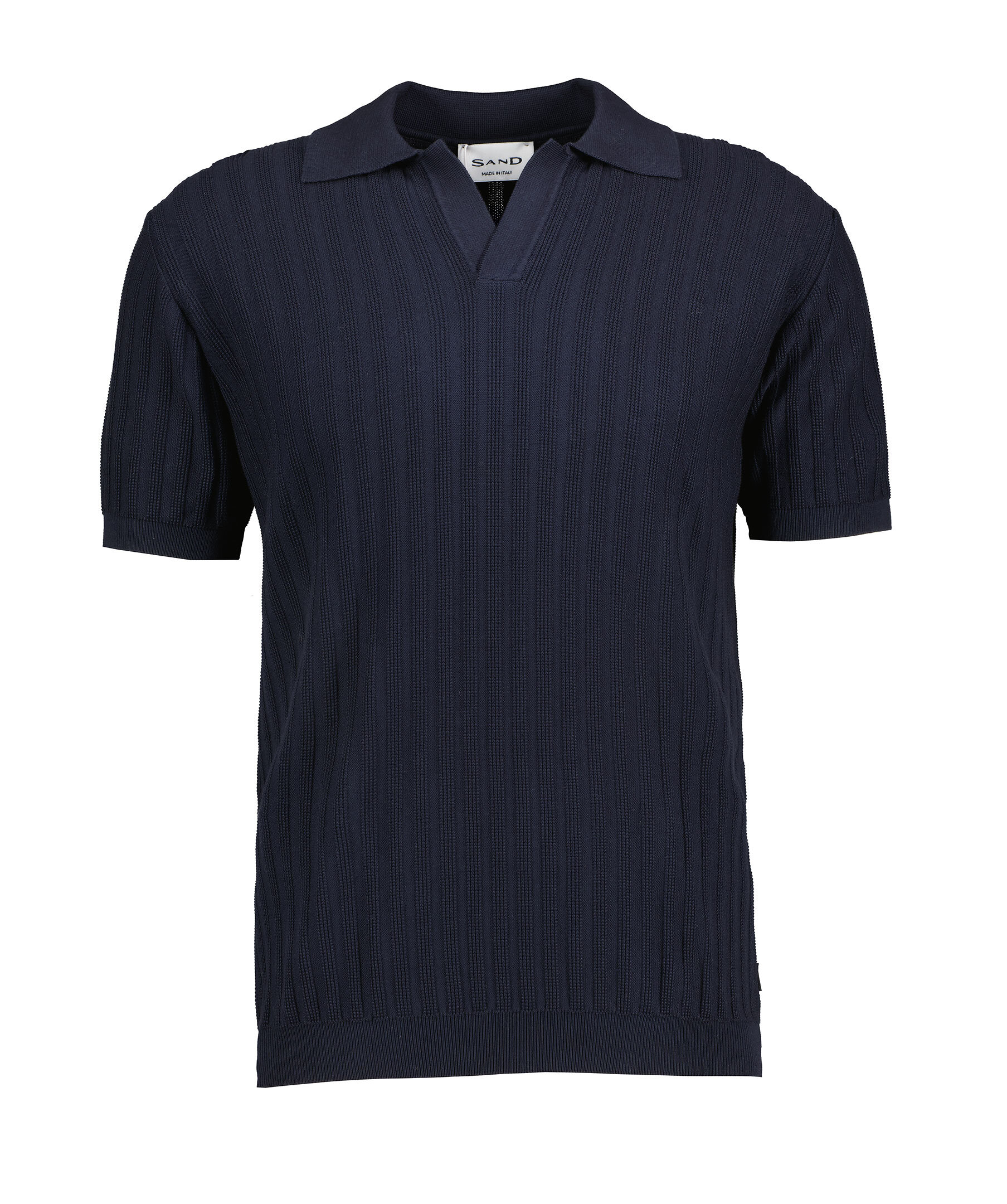 Mörkblå, kortärmad piké från Sand. Pikén är subtilt texturerad och har ribbstickade detaljer. Tillverkad i bomull.