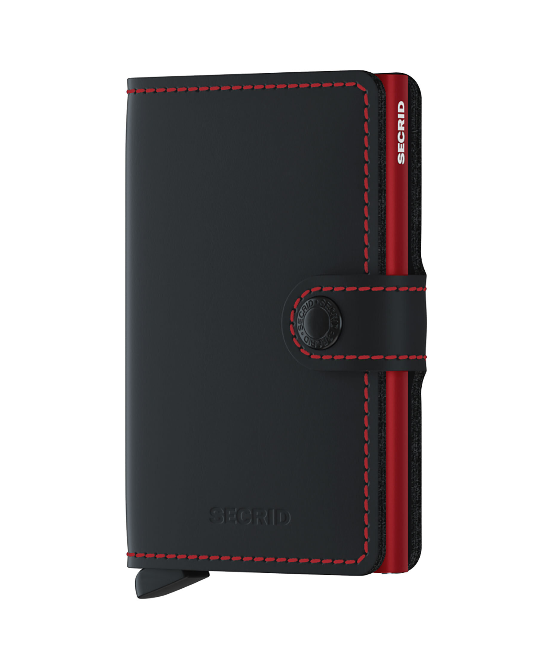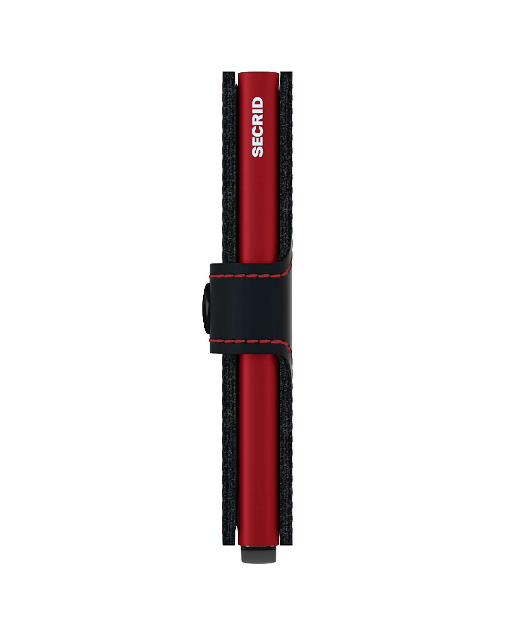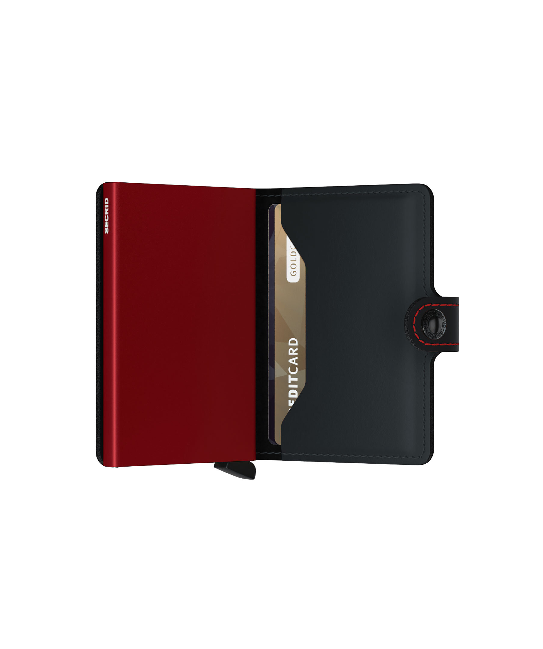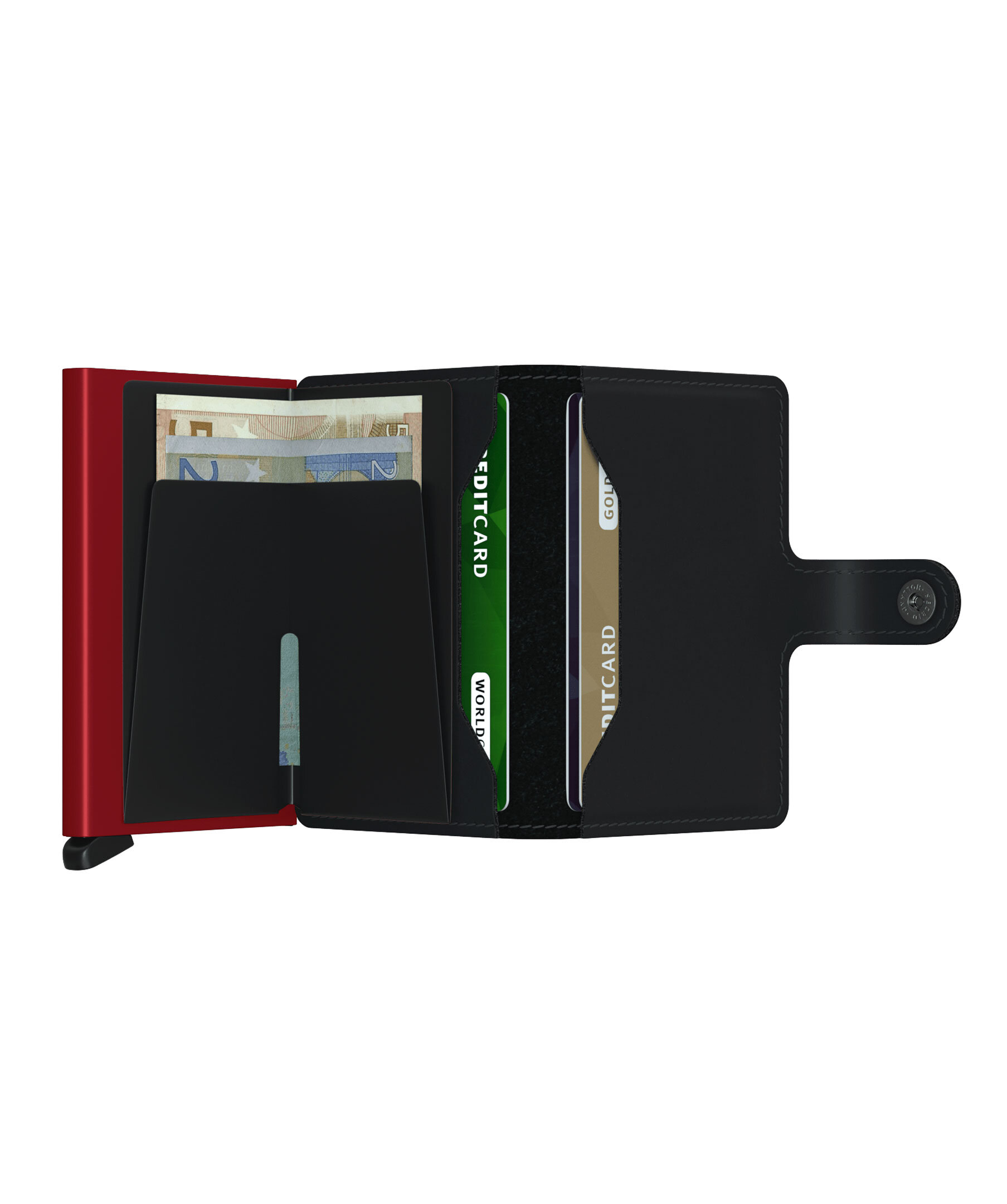 Miniwallet i stilen Matte Black & Red från Secrid. Liten i storleken och förvånansvärt stor i lagringskapacitet, och kombinerar det bästa av två världar. Utsidan rymmer sedlar, kvitton och kort, medan Cardprotectorn i aluminium låter dig skjuta ut kort med en enkel rörelse och skyddar dem från böjning, brott och oönskad trådlös kommunikation. Den håller fyra präglade eller sex platta kort, fyra extra kort, sedlar samt visitkort. Tillverkad i vattenavvisande läder. Mått: B: 6,5 cm, H: 10,2 cm, D: 2,1 cm.