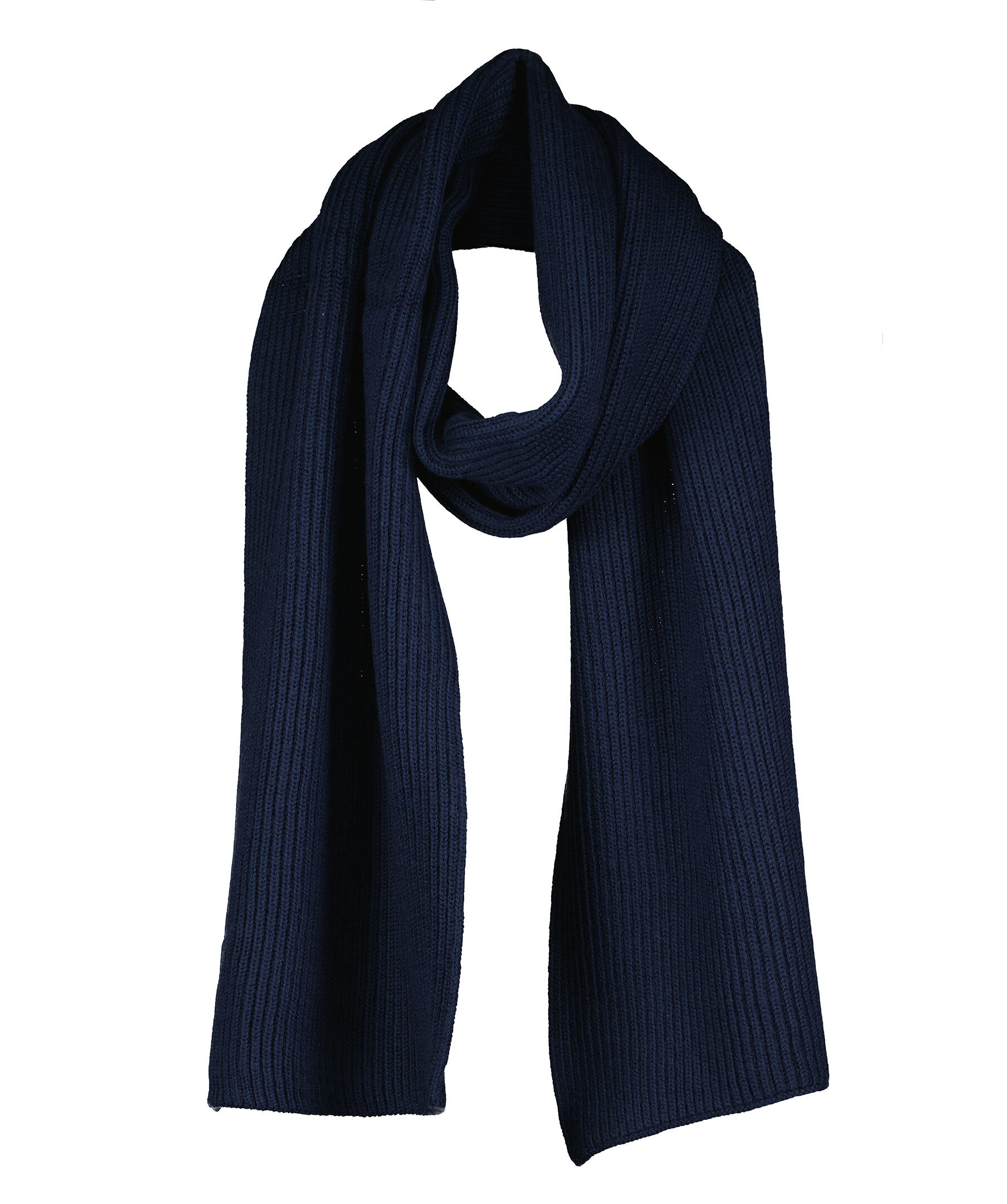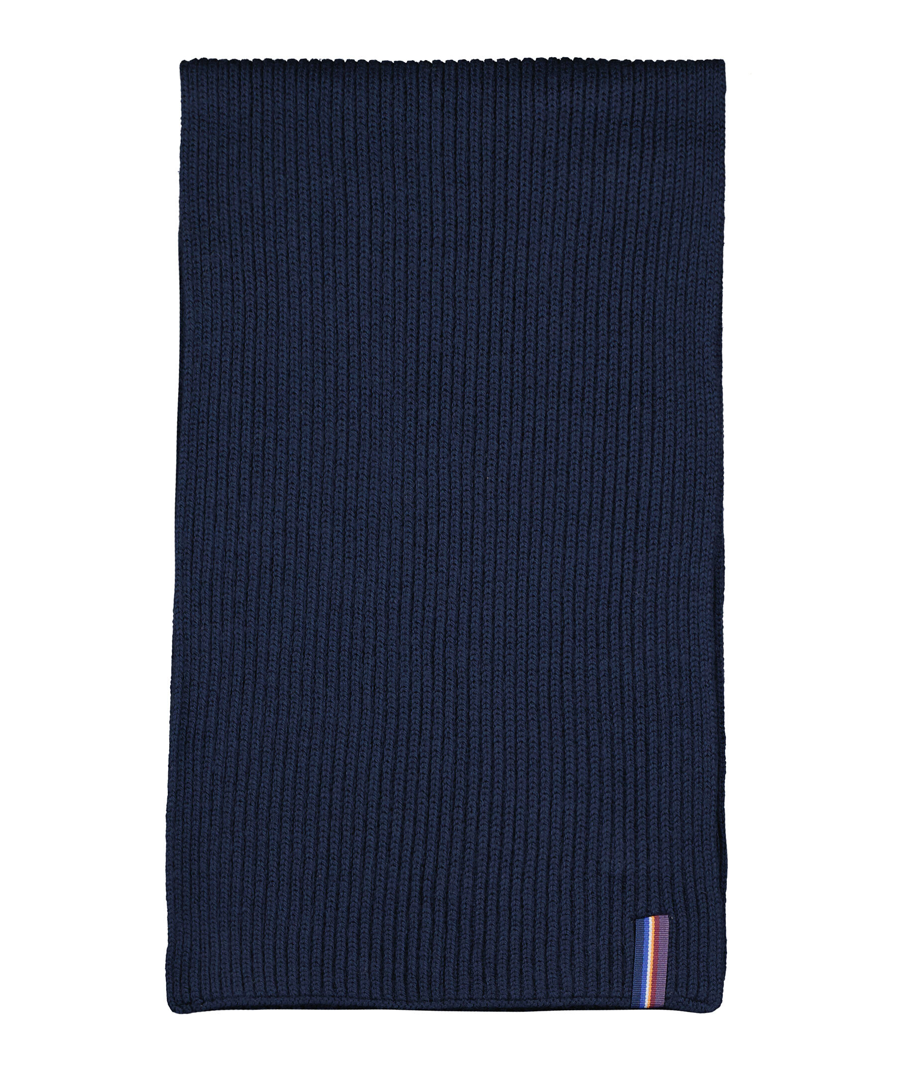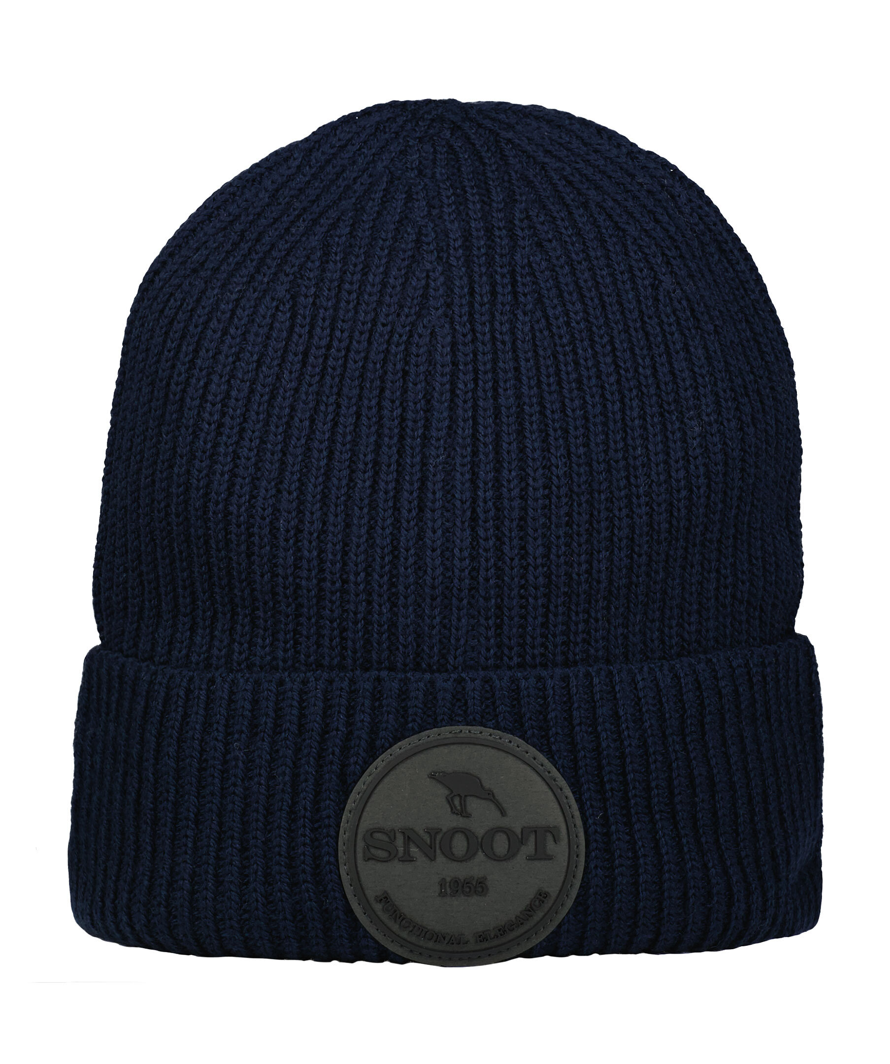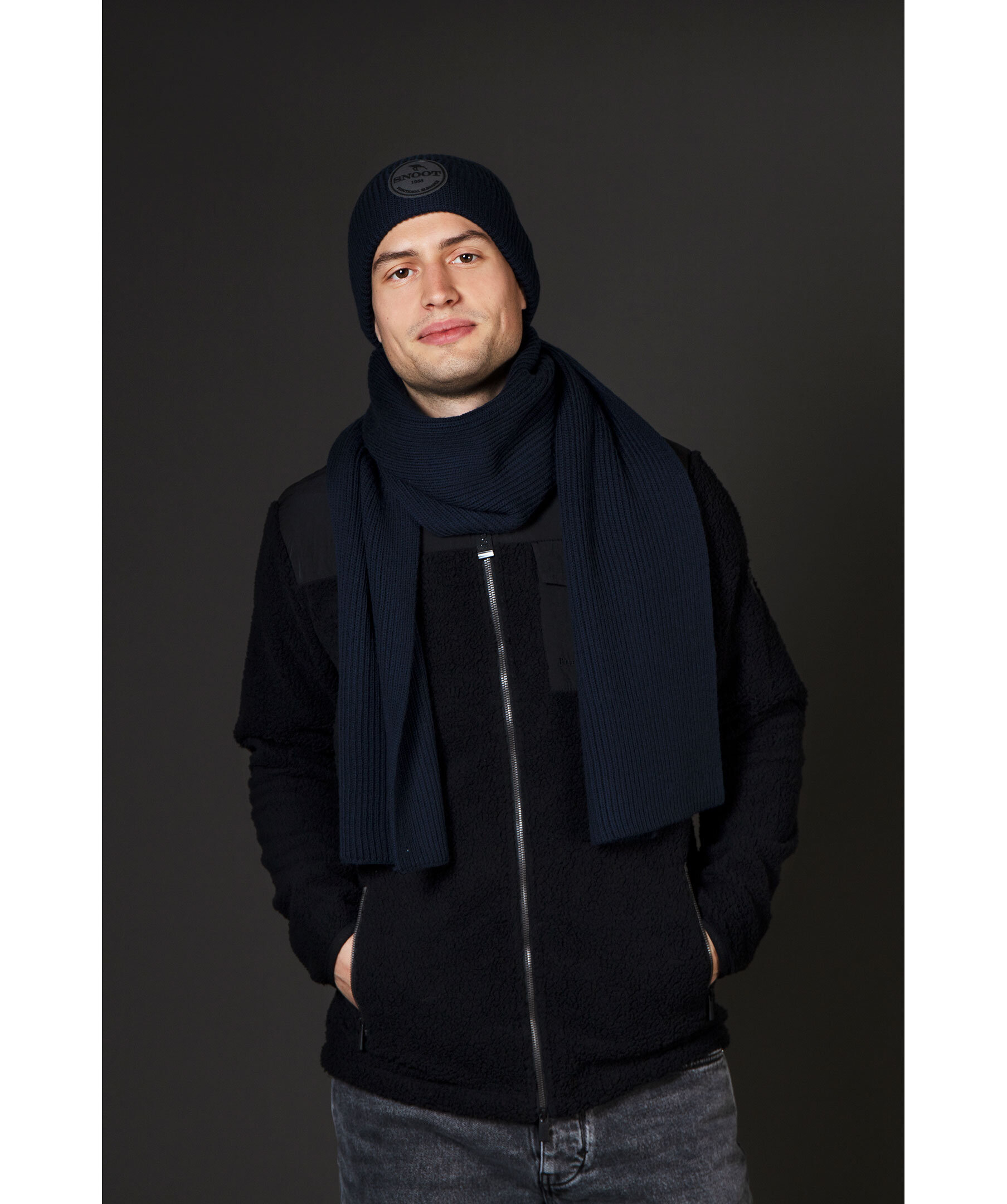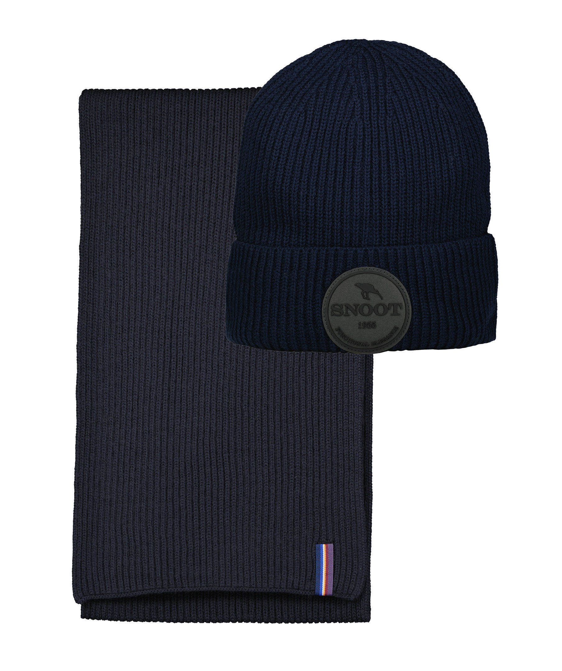 Marinblå set med ribbstickad mössa och halsduk från Snoot tillverkade i 100% merinoull. Mössan har en vikt kant med grå, rund patch med logotyp mitt fram och halsduken har en randig, färgglad flärp på ena kortsidan. Halsduken har måtten: 180 x 28 cm. 100% merinoull Handtvätt