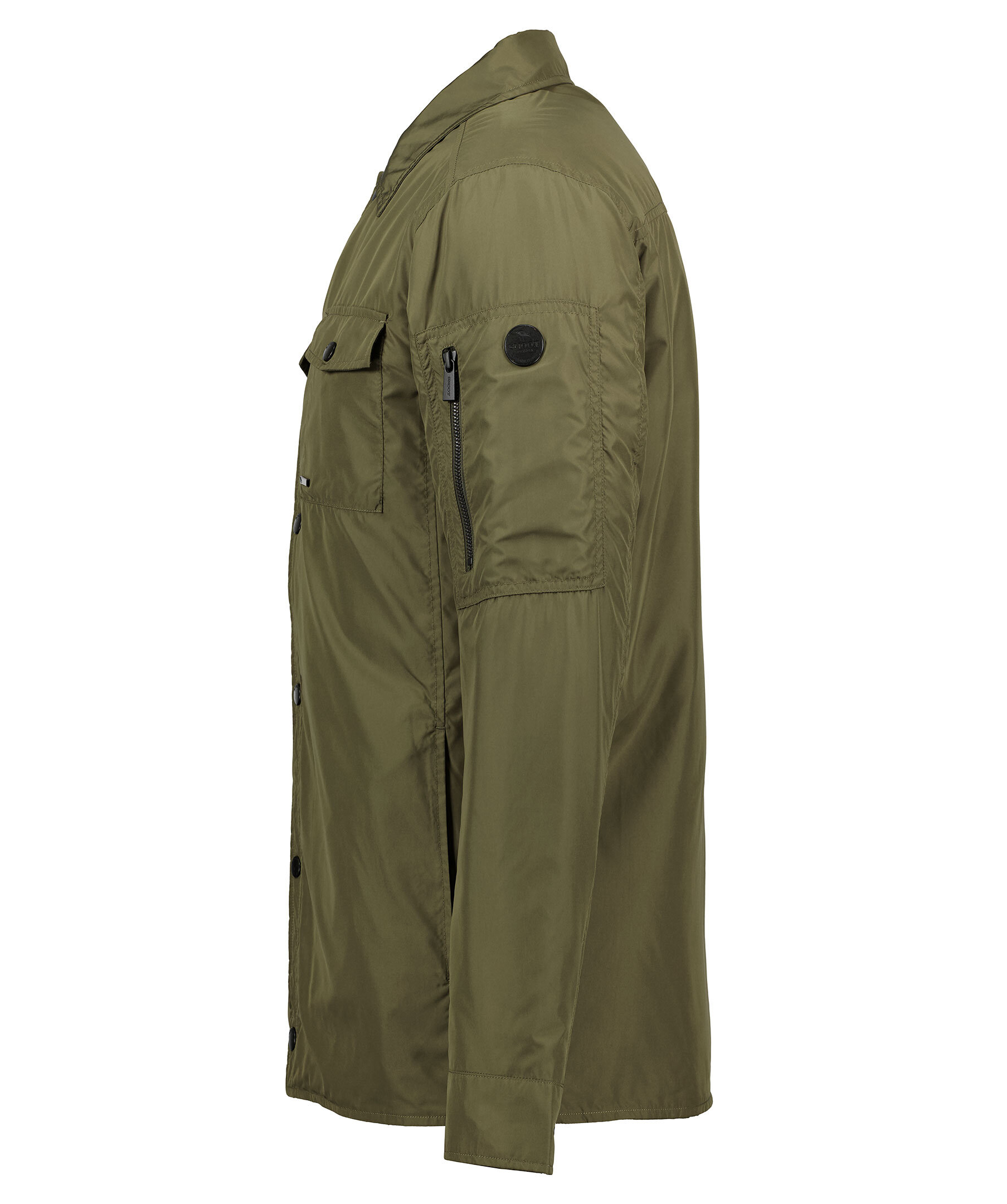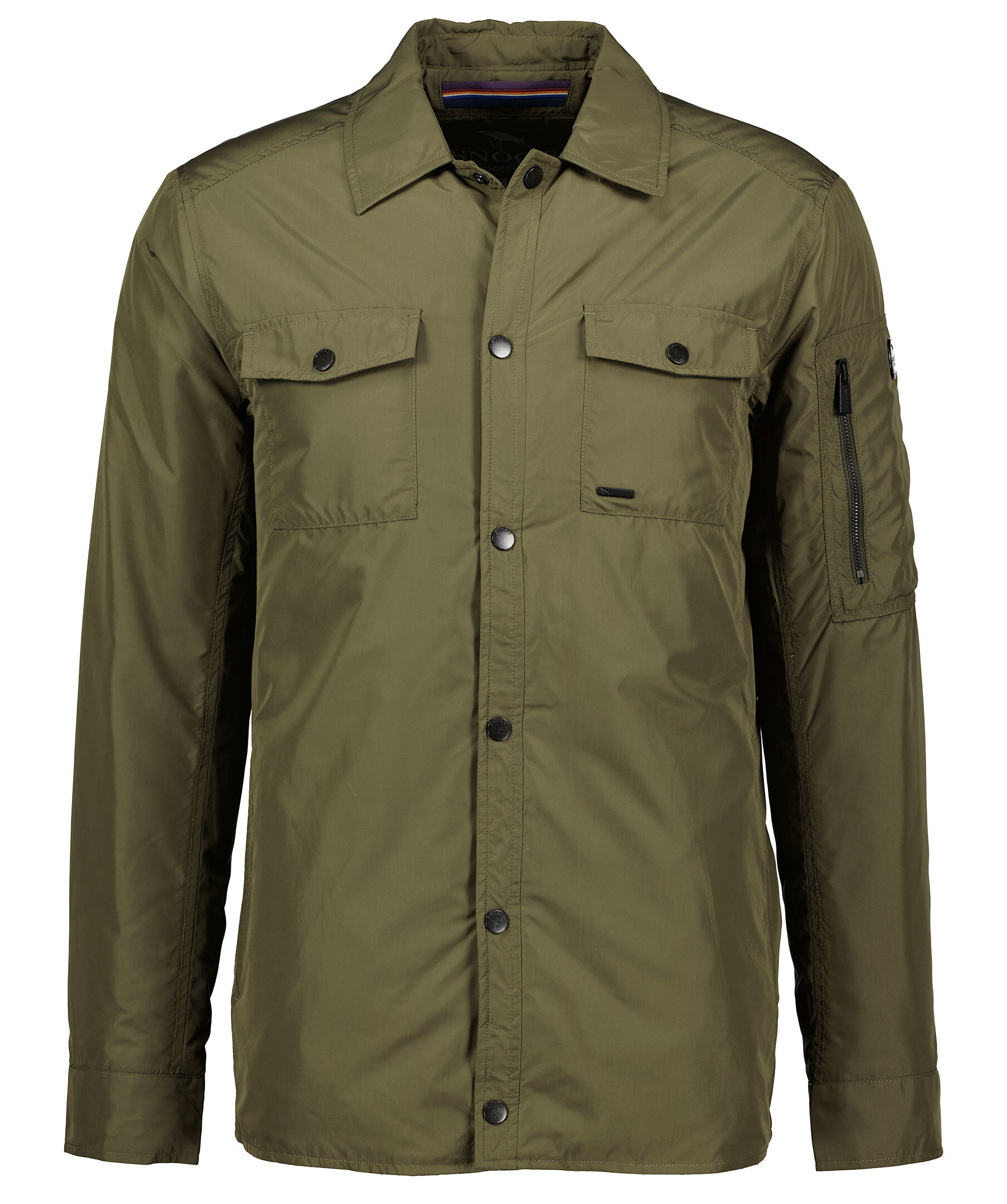 Grön skjortjacka från Snoot. Tillverkad i syntet med thermore fyllning. Bröstfickor, klassisk krage, svarta knappar samt logga på vänster ärm. Ficka med dragkedja på vänster arm.