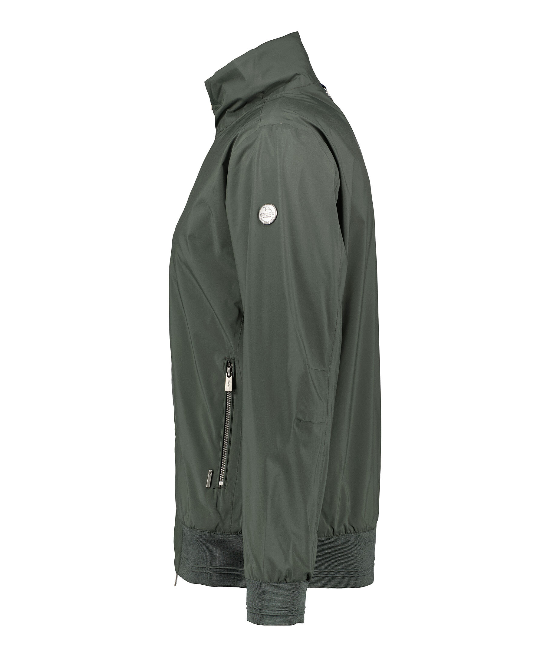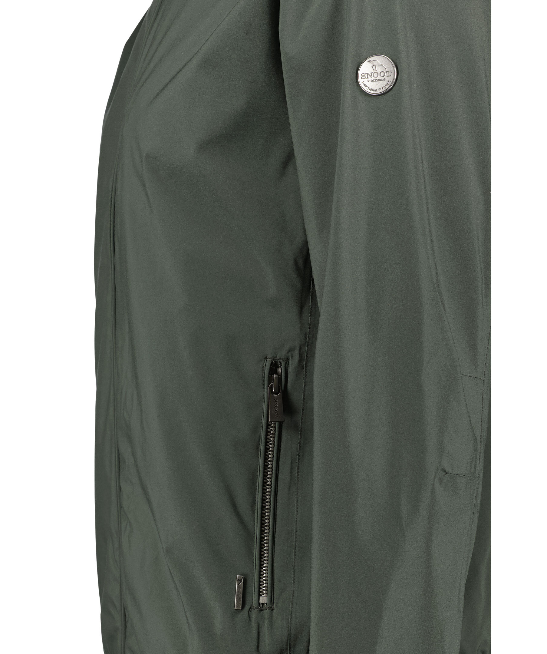 Skogsgrön jacka från Snoot. Stängs med tvåvägsdragkedja. Två sidfickor med dragkedja. Ribbstickade muddar vid ärm- och plaggslut. Liten rund metallogotyp på vänster ärm. Tillverkad i en polyesterblandning.