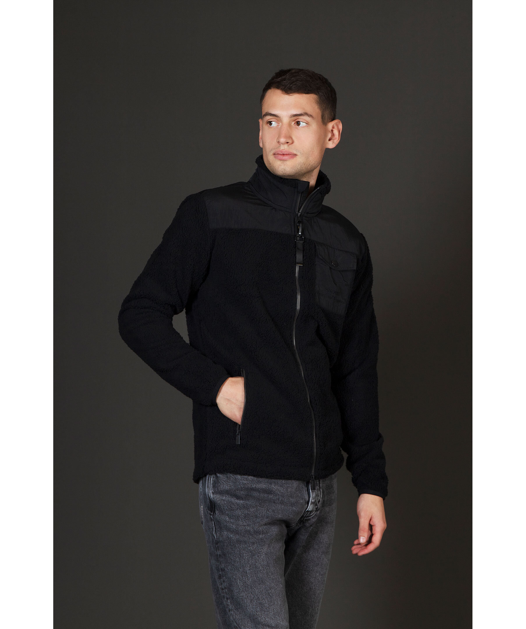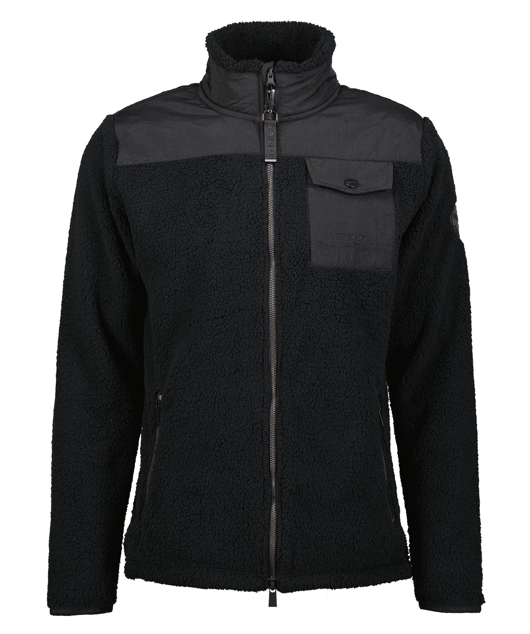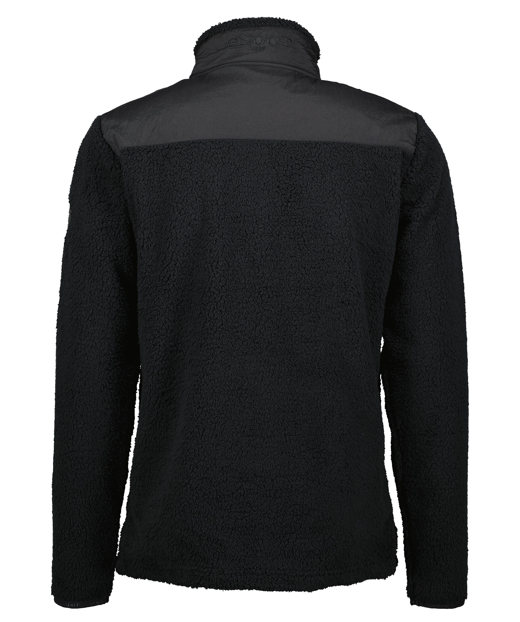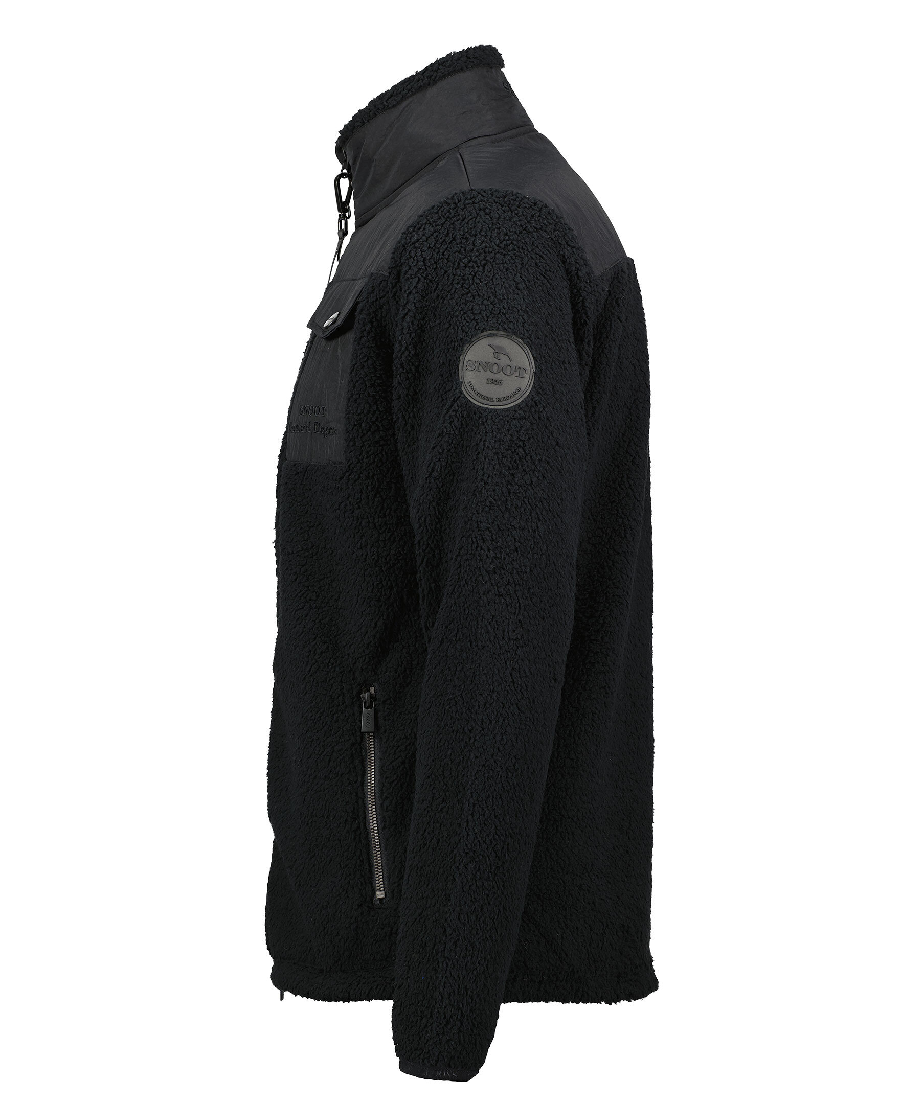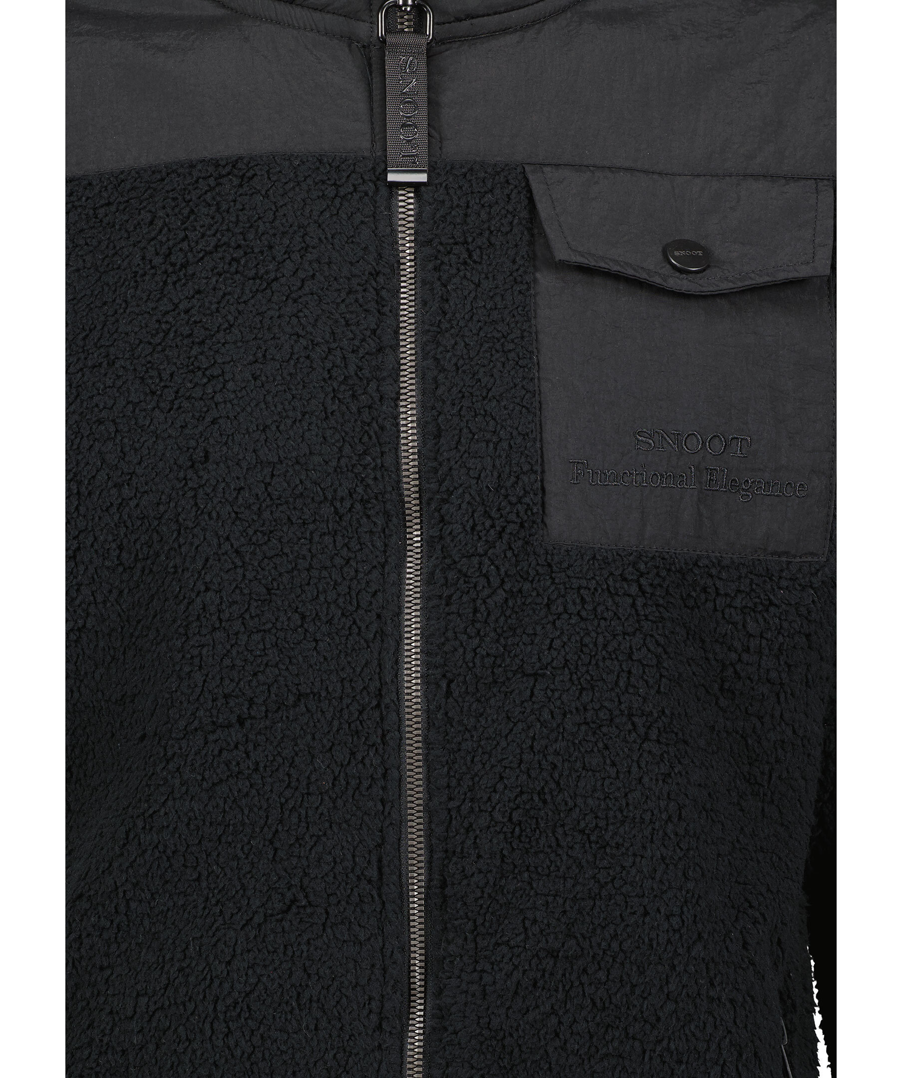 Svart fleece jacka från Snoot. Kontrast material i svart på axlarna samt utsida av krage. Stängs framtill med dragkedja. Två framfickor med dragkedja samt två stora innerfickor på vardera sida. Bröstficka med ficklock och tryckknapp samt broderad logotyp. Ståkrage och elastiska manschetter. Patch med logotyp på höger ärm.