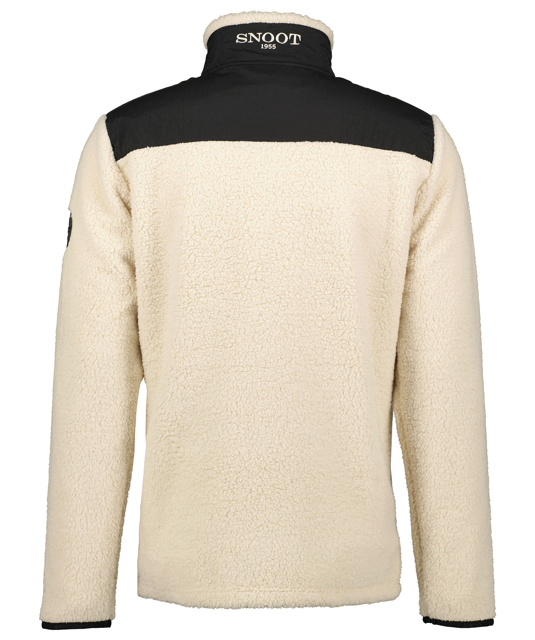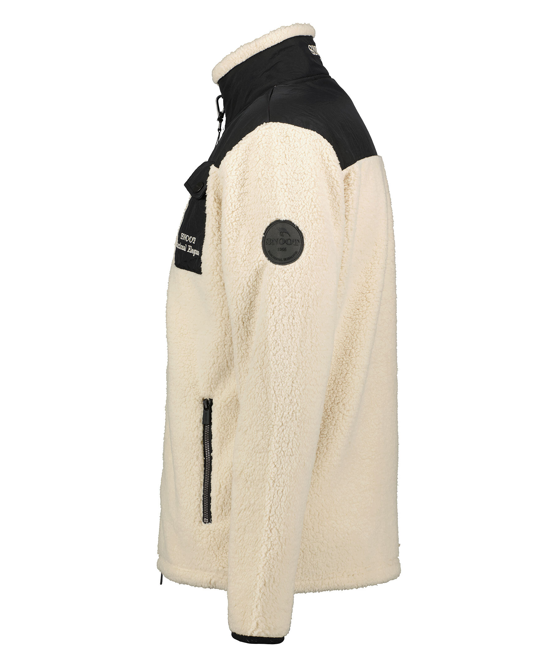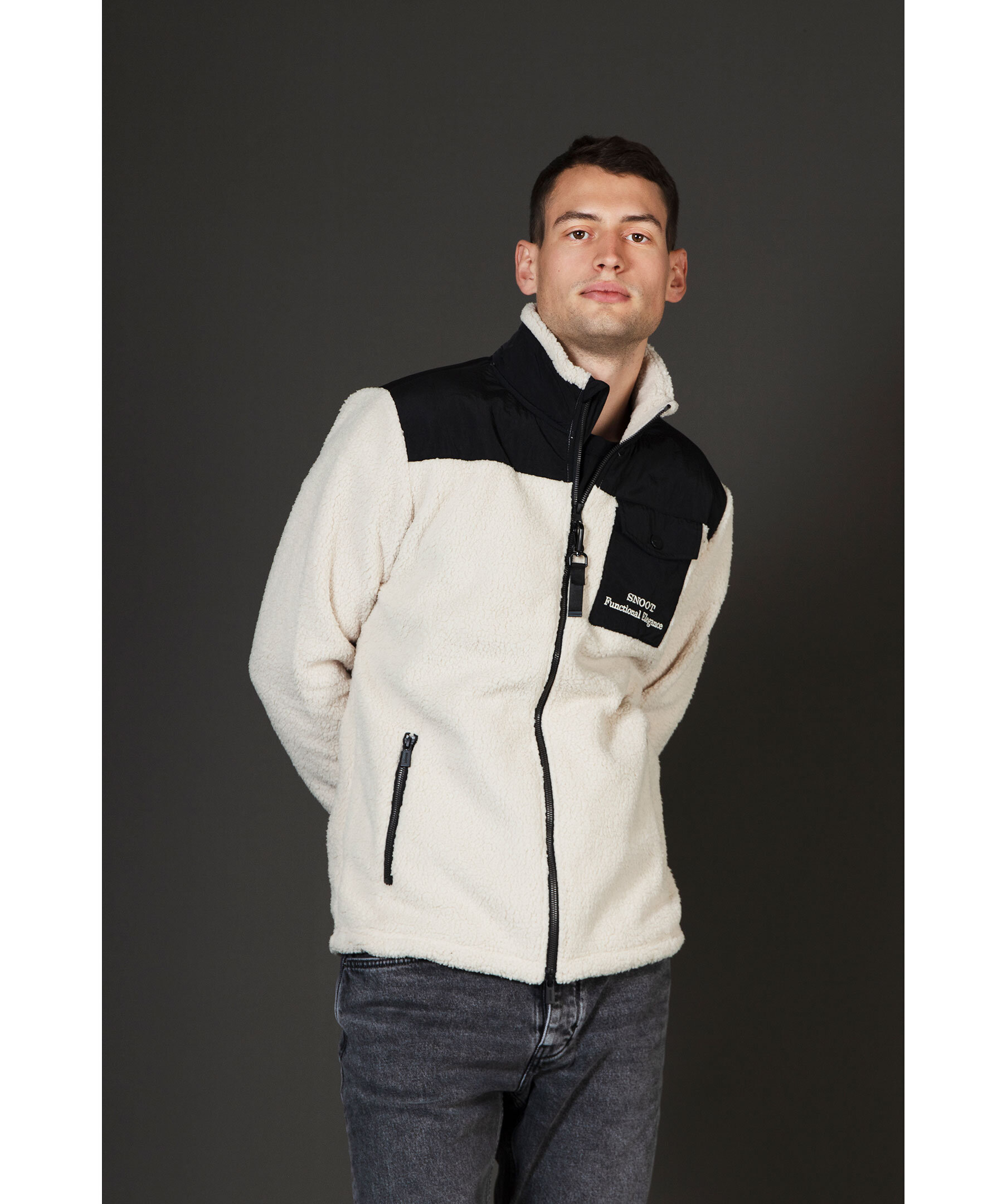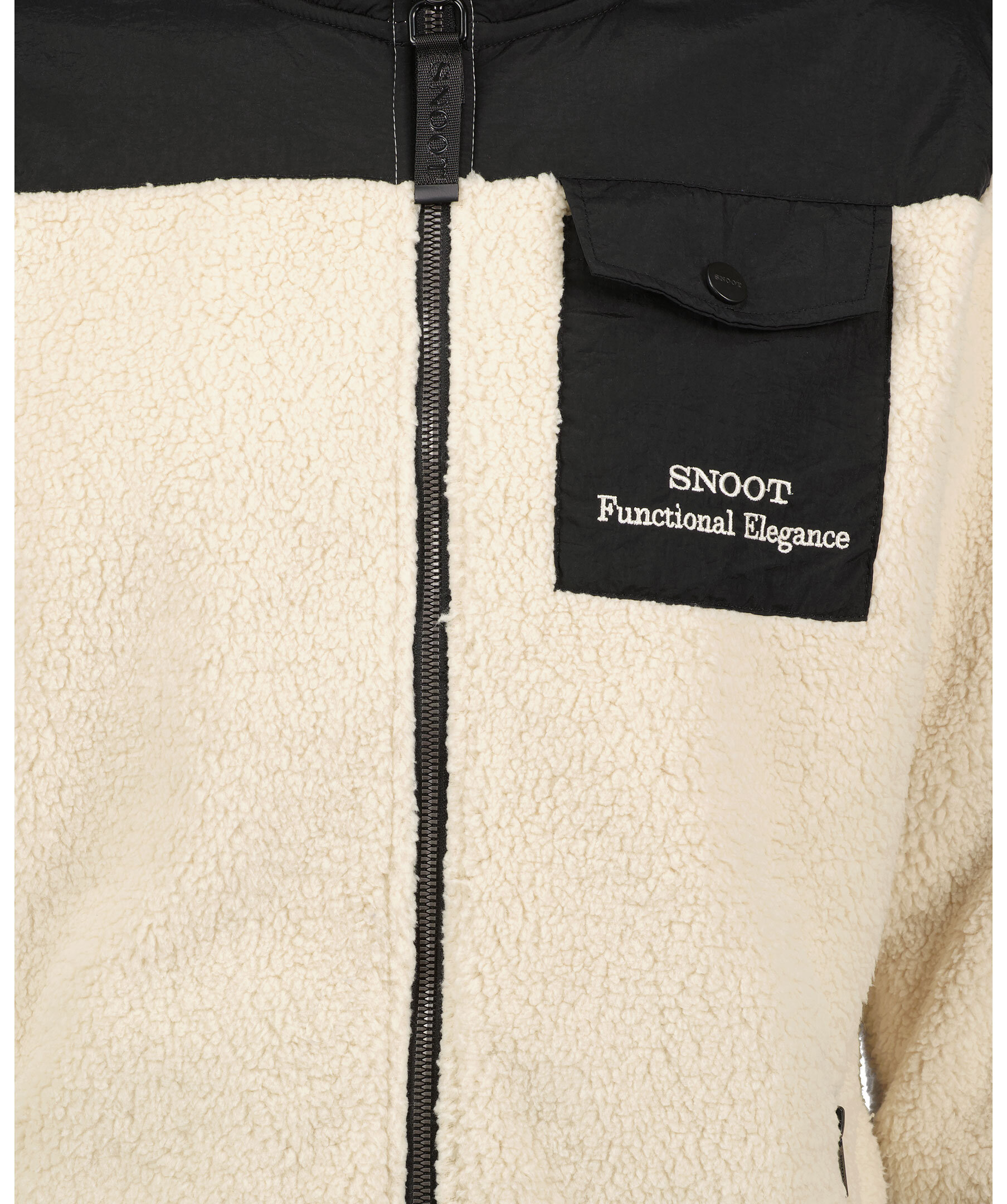 Krämvit fleece jacka från Snoot. Kontrast material i svart på axlarna samt utsida av krage. Stängs framtill med dragkedja. Två framfickor med dragkedja samt två stora innerfickor på vardera sida. Bröstficka med ficklock och tryckknapp samt broderad logotyp. Ståkrage och elastiska manschetter. Patch med logotyp på höger ärm.