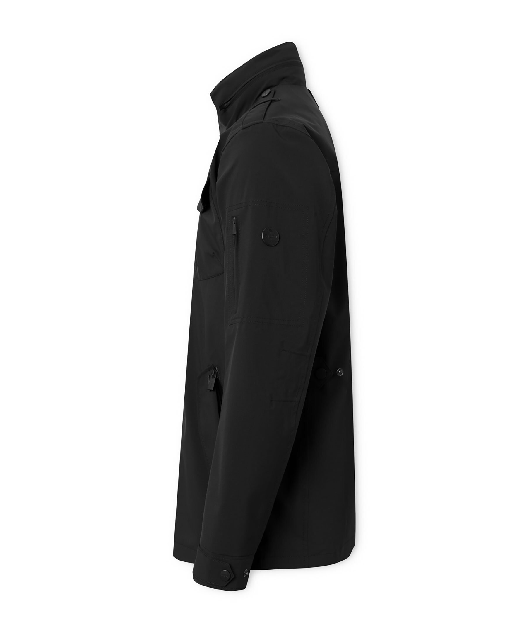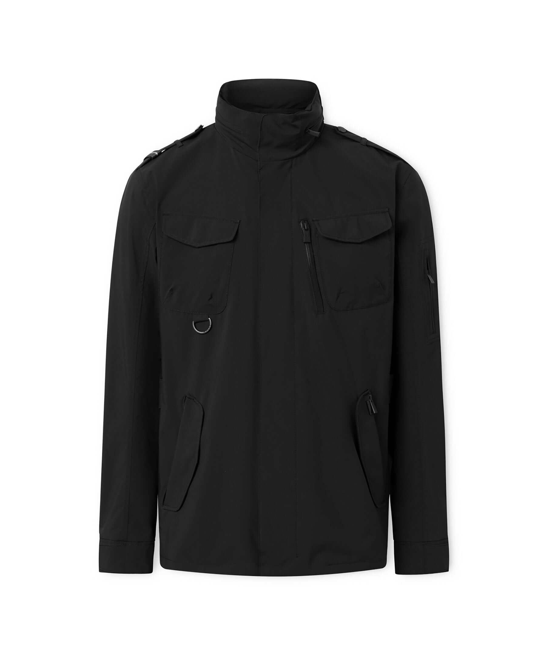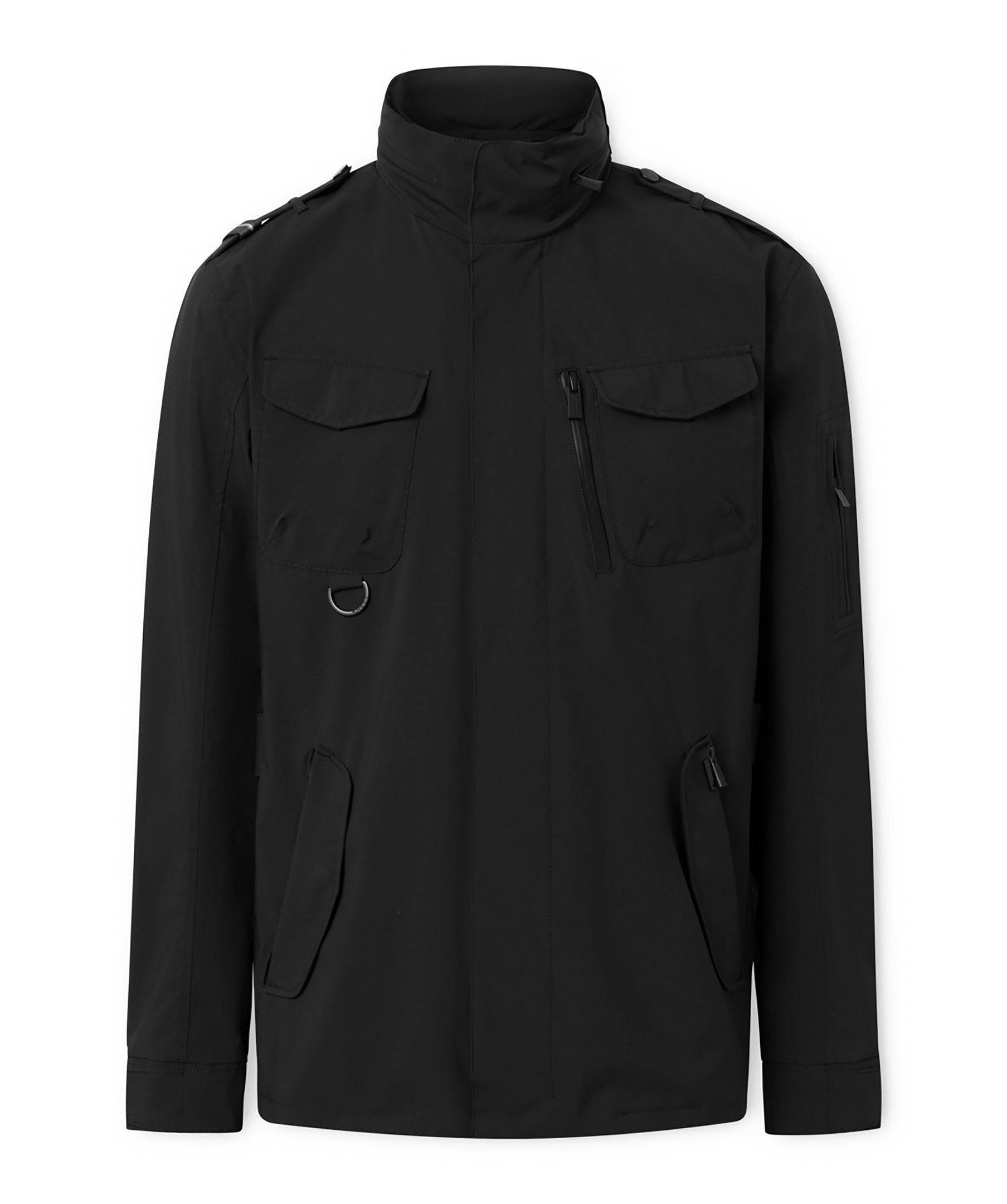 Svart jacka från Snoot. Stängs framtill med dragkedja och tryckknappar. Två bröstfickor som stängs med tryckknappar och en som stängs med dragkedja. Sidfickor som stängs med dragkedja och tryckknappar. Ficka med dragkedja på vänster ärm, logotyp i metall. Justerbara ärmslut. Utvikbar luva i kragen.
