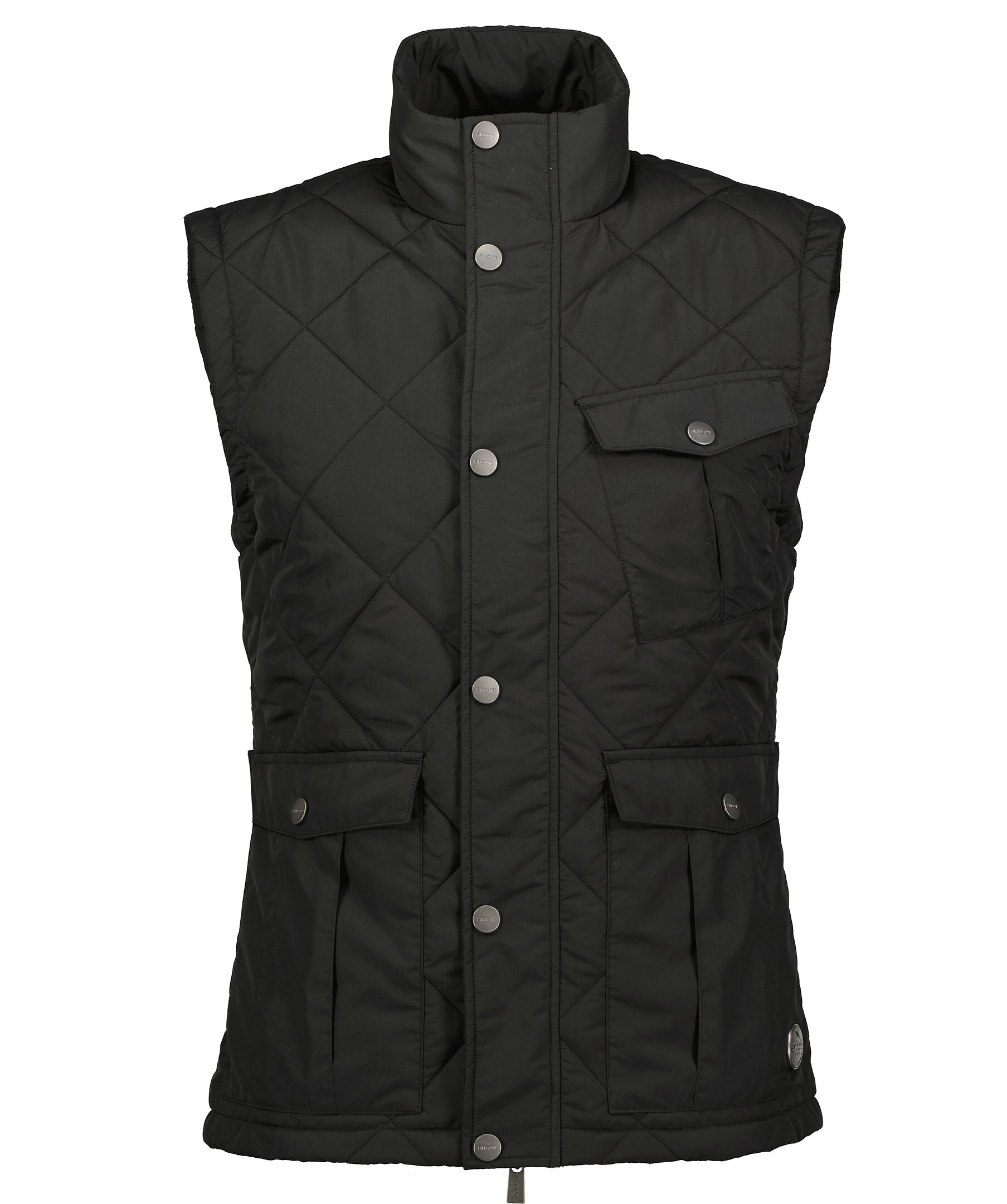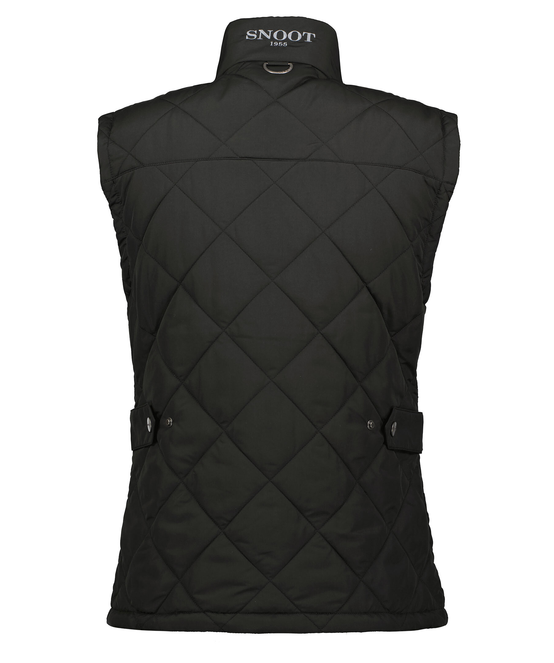 Svart quiltad väst från Snoot. Stängs framtill med knappar och dragkedja. Bröstficka på vänster sida som stängs med tryckknapp. Två fickor framtill som stängs med lock och tryckknapp. Västen är Justerbar i midjan.