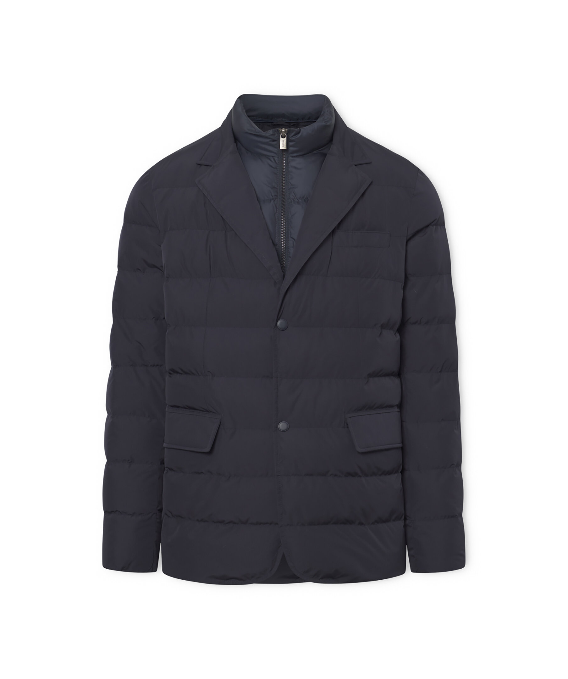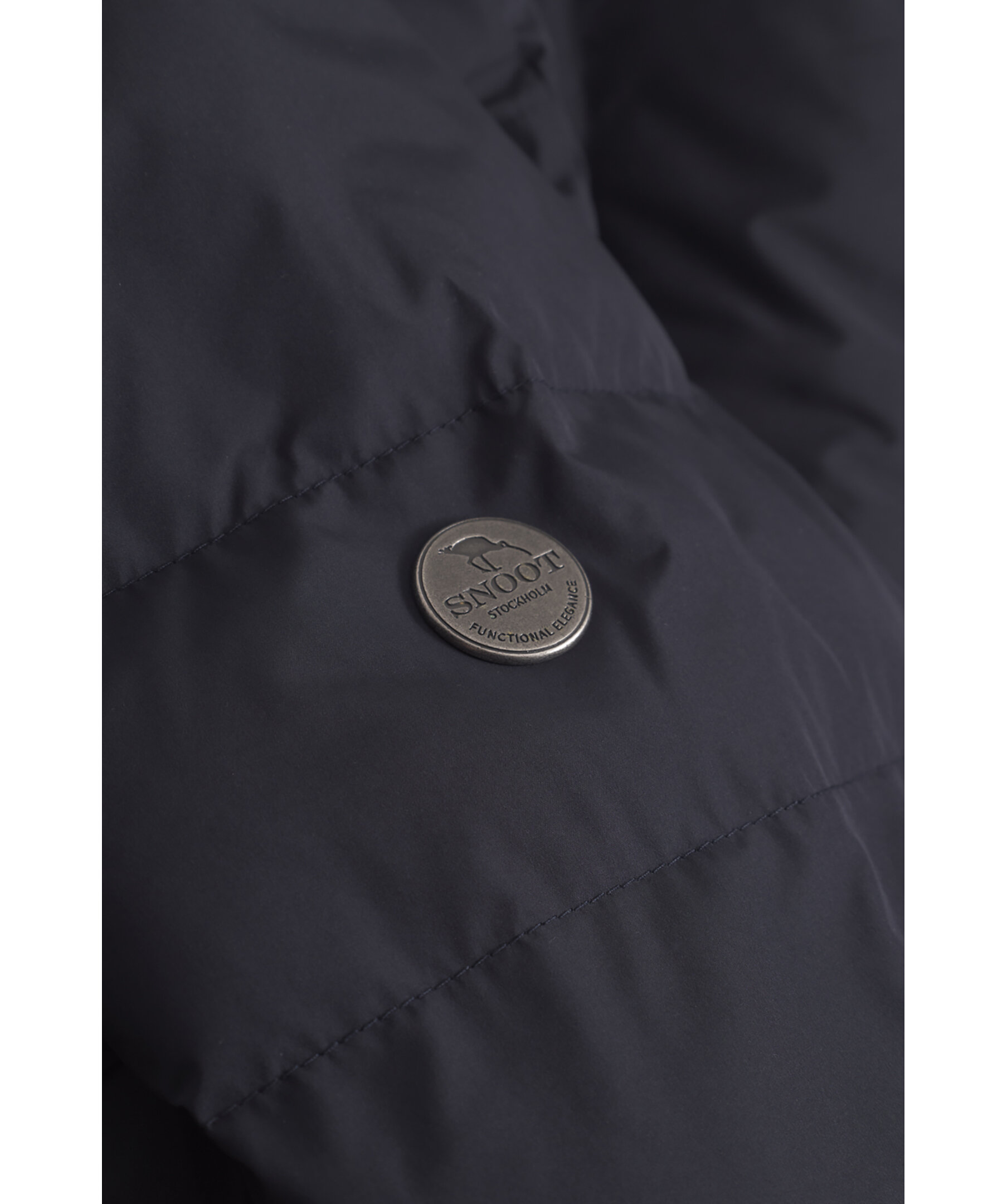 Marinblå jacka från Snoot. Jackan stängs med tryckknappar och har en kavajkrage, på insidan av kragen finns en fodrad del med dragkedja som är avtagbar. Jackan har två fickor med lock samt en bröstficka på både utsidan och insidan. Liten logotyp i metall på vänster ärm. Tillverkad i polyester.