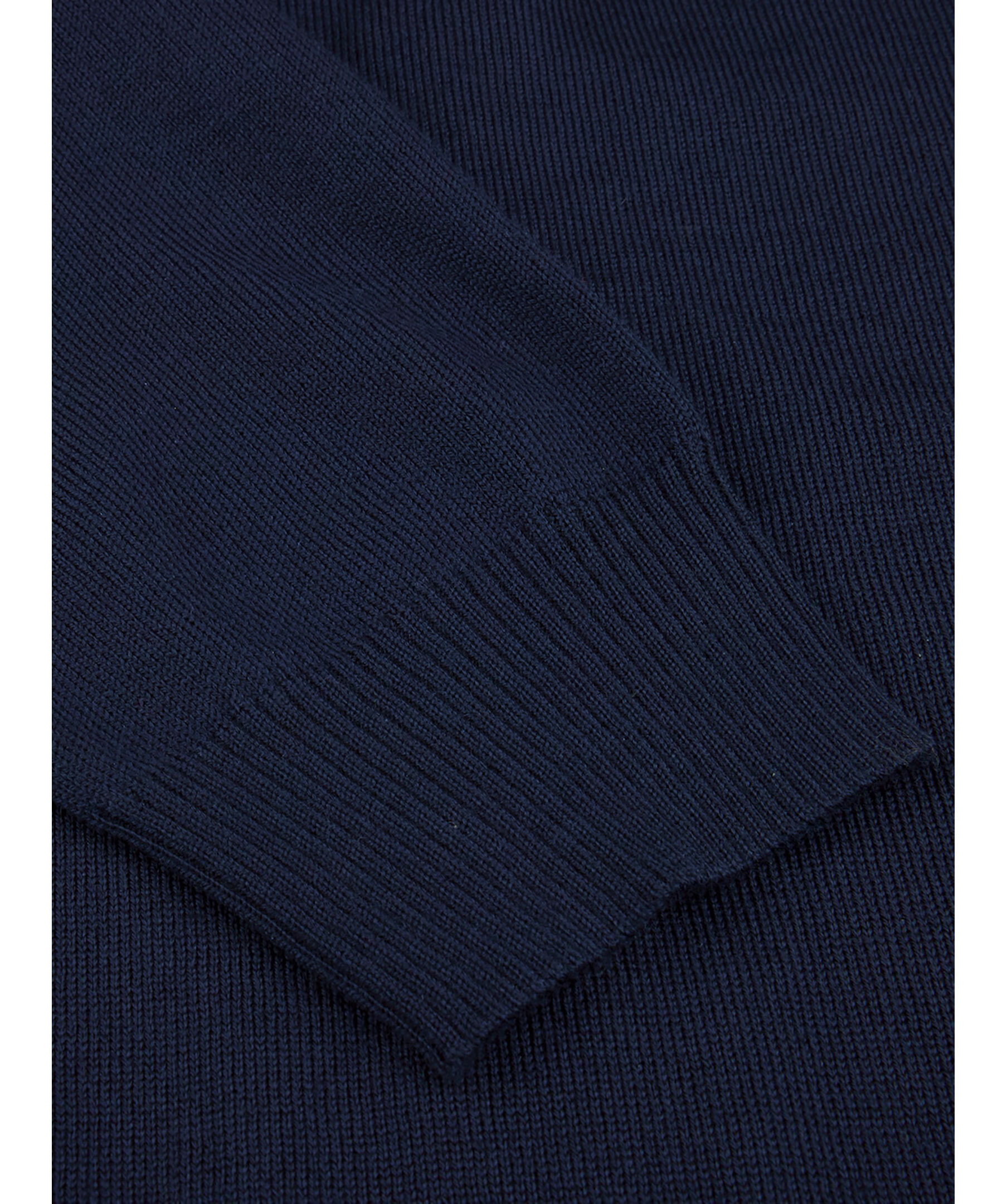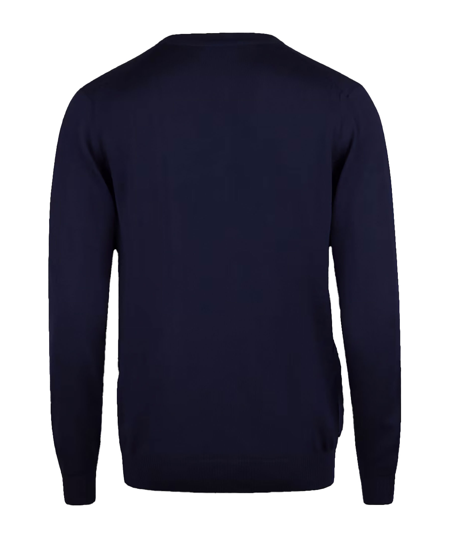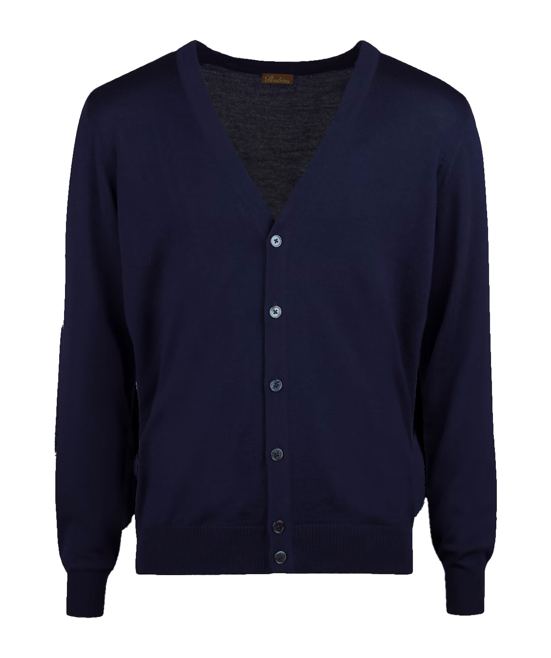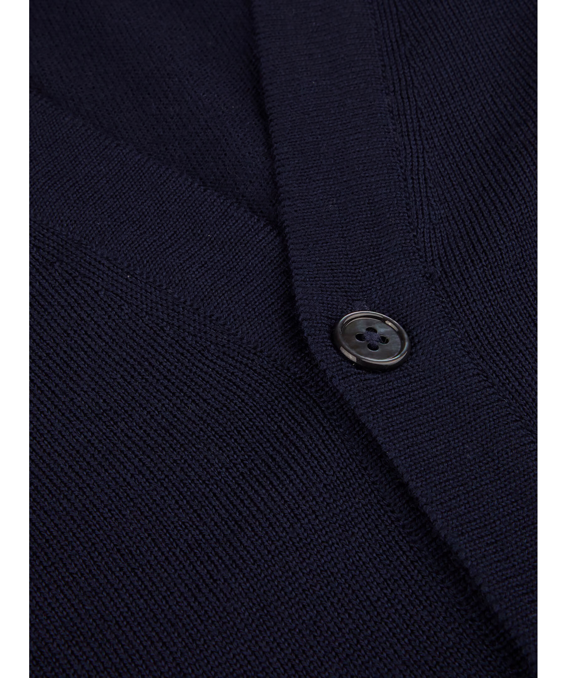 Marinblå finstickad v-ringad cardigan från Stenströms. Pärlemorknappar och ribbstickade detaljer vid krage, ärm- och plaggslut.