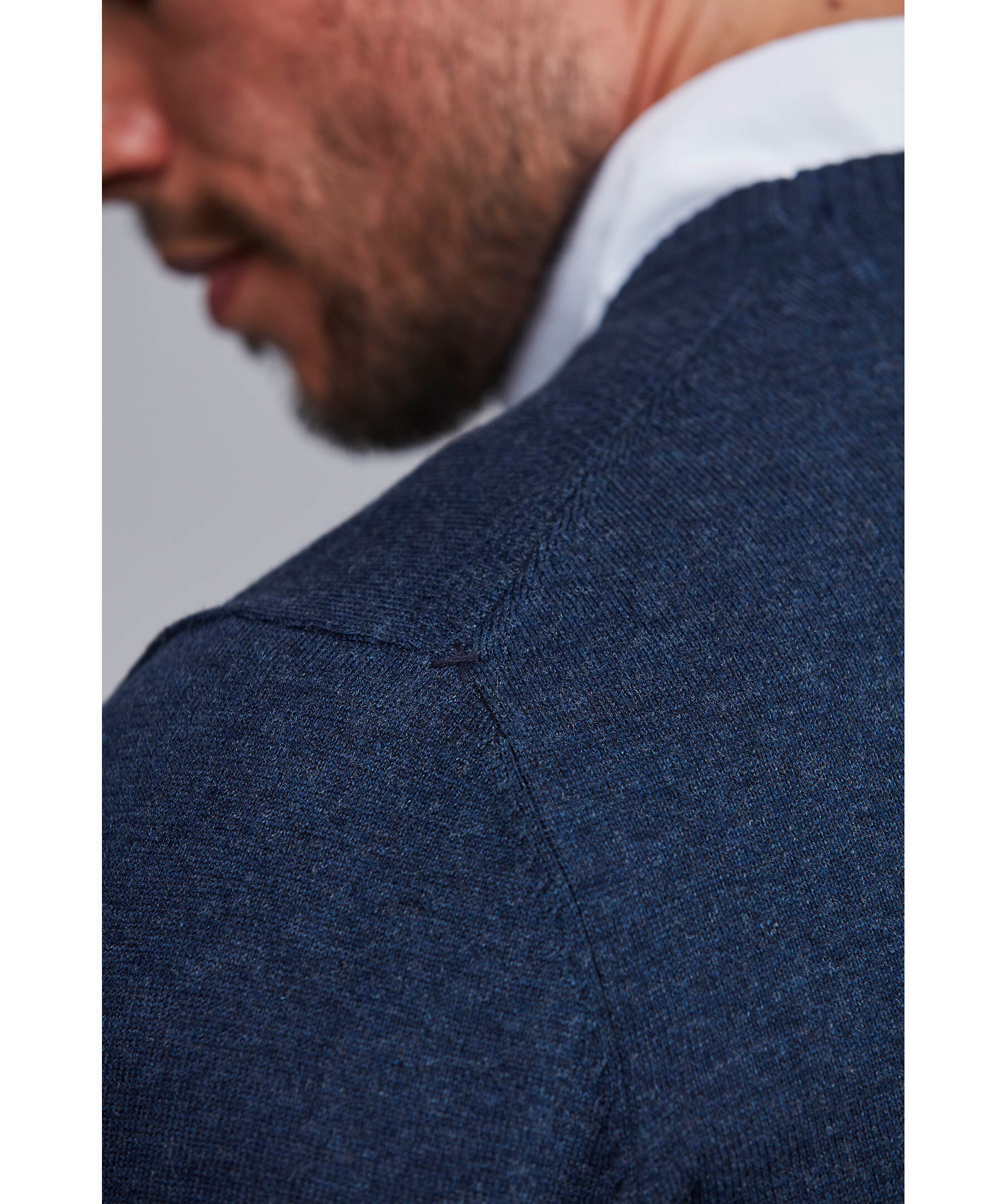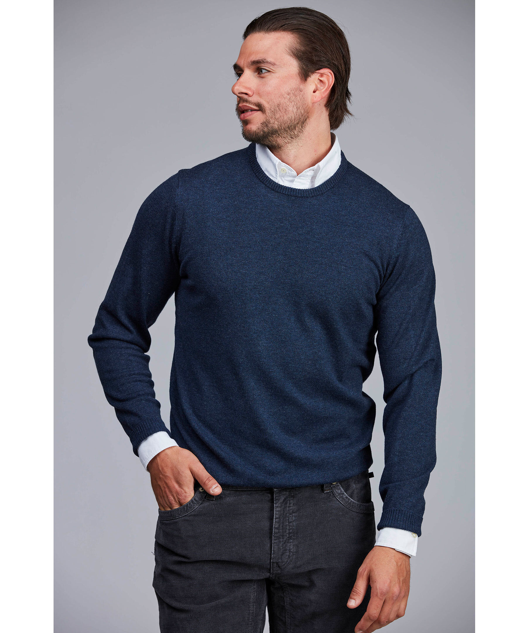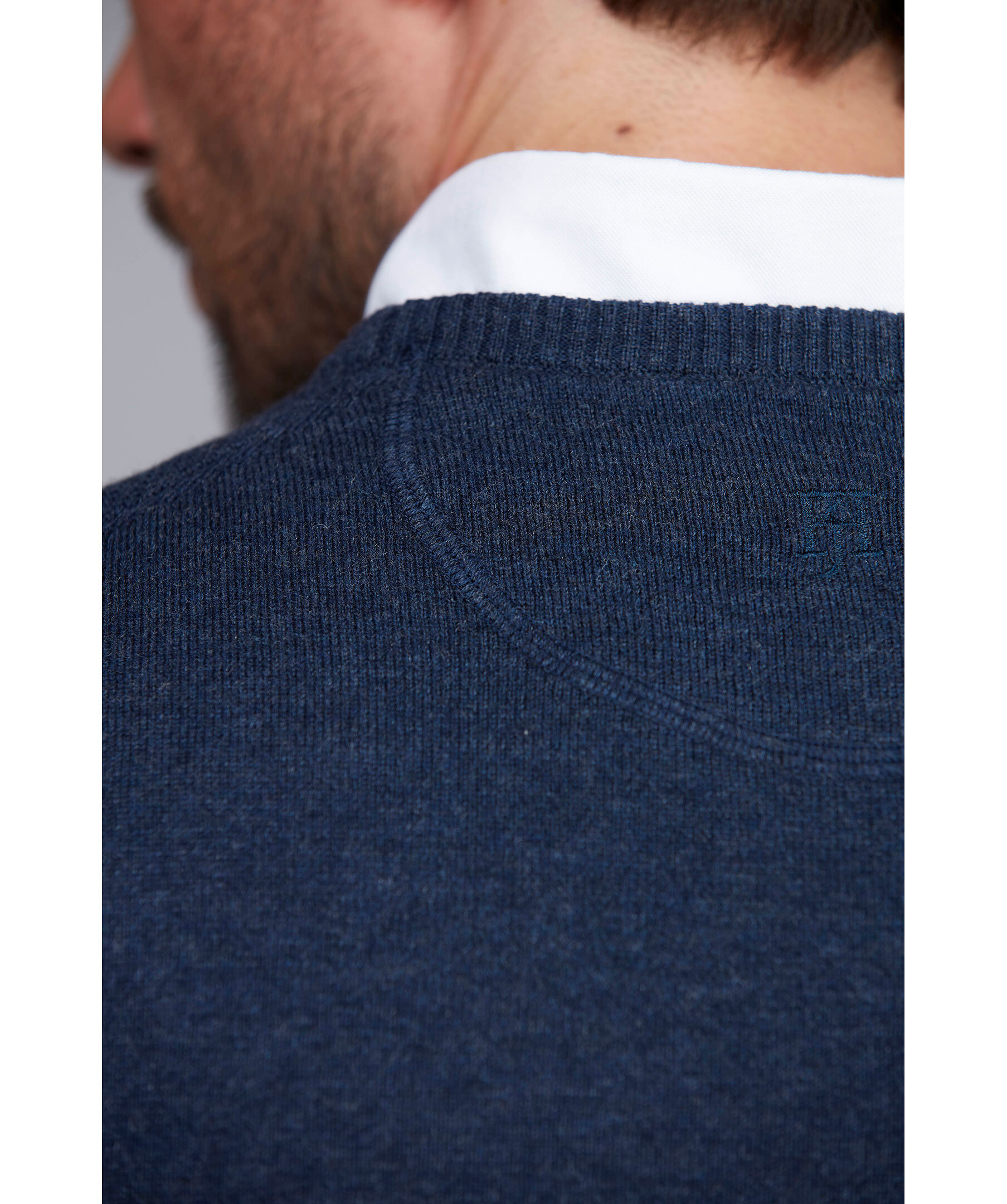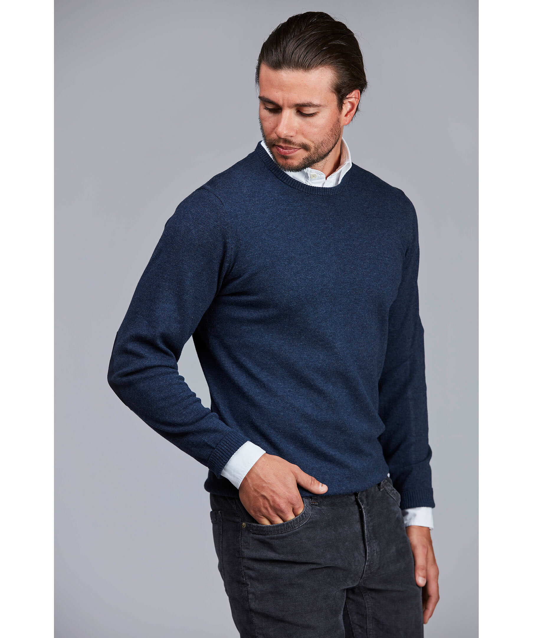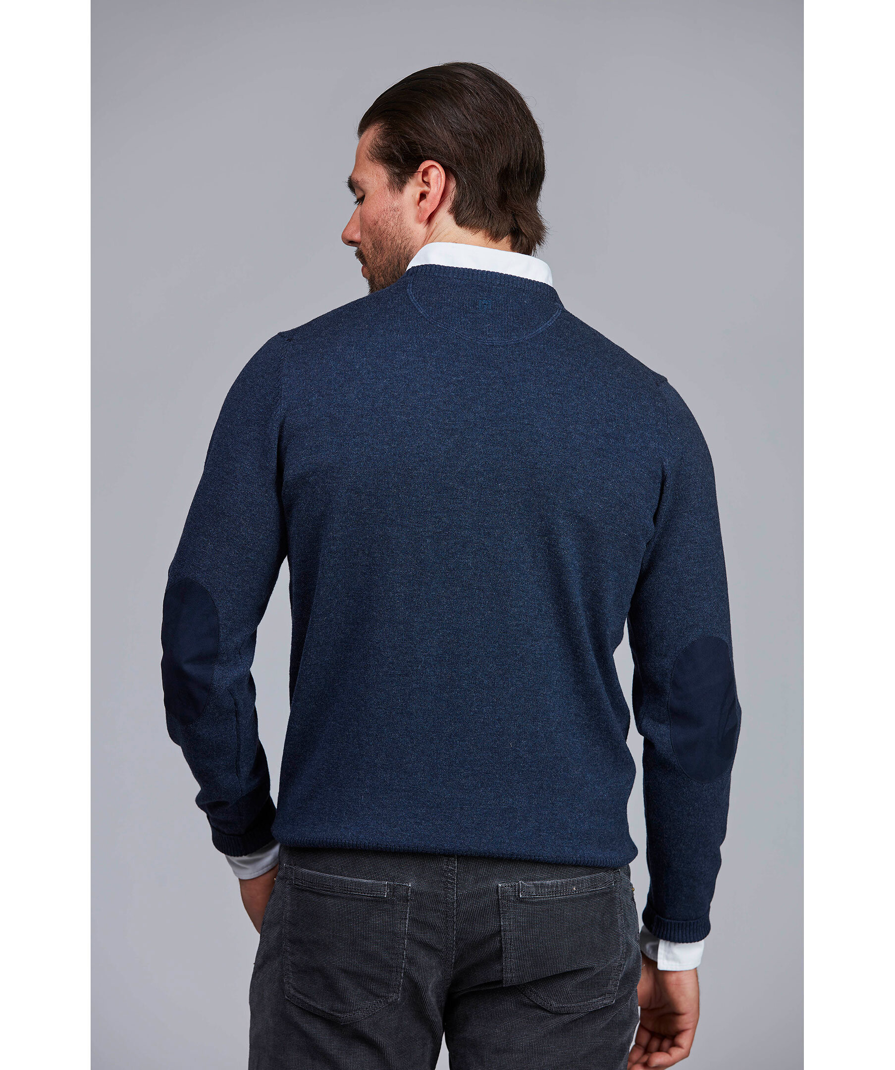 Denna tunnstickade klassiker kommer denna höst i nya uppdaterade färger i exklusiv merinoull/bomulls mix. Tröjan har ärmlappar i alcantara från Amaretta som ger extra skydd mot slitage. Elegant broderad logga i nacken och med våra karaktäristiska x-söm detaljer på axlarna. Kombinera gärna tröjan med en av våra fantastiska italienska skjortor.