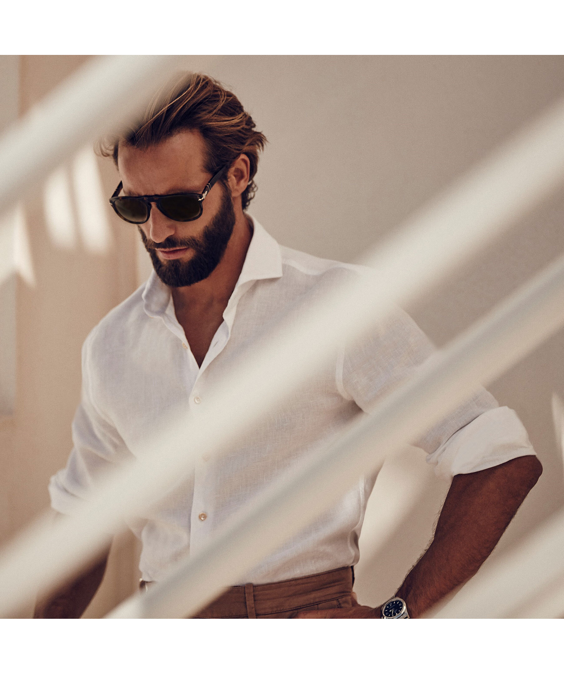 Linneskjortan är det idealiska plagget för varma sommardagar och kan bäras både på kontoret och på stranden. Den här skjortan är skuren i en något skräddarsydd passform och har en slät knappslå med beigea pärlemorknappar och enkla manschetter. Rulla upp ärmarna och bär skjortan till ett par shorts eller ett par jeans för en avslappnad stil.