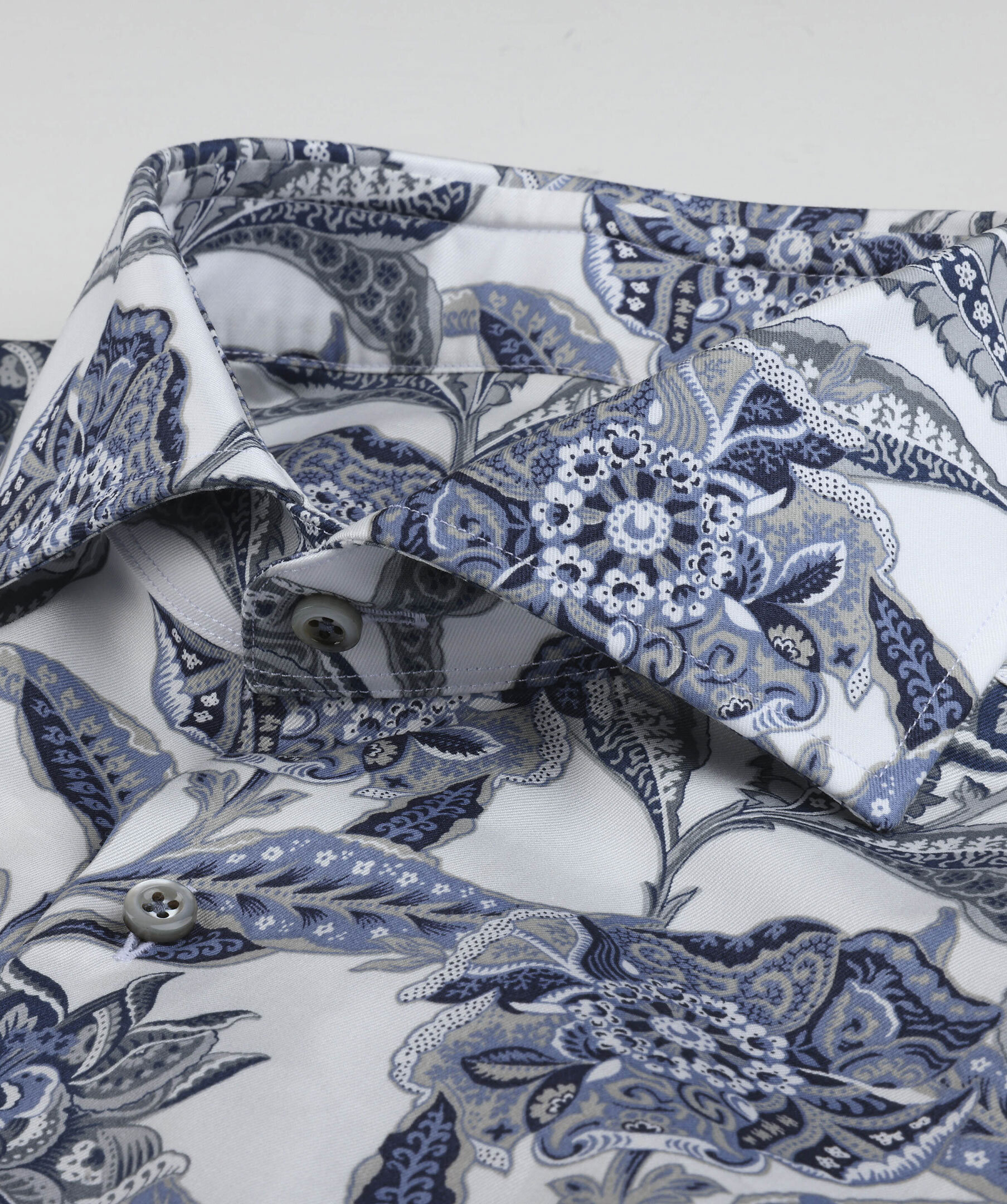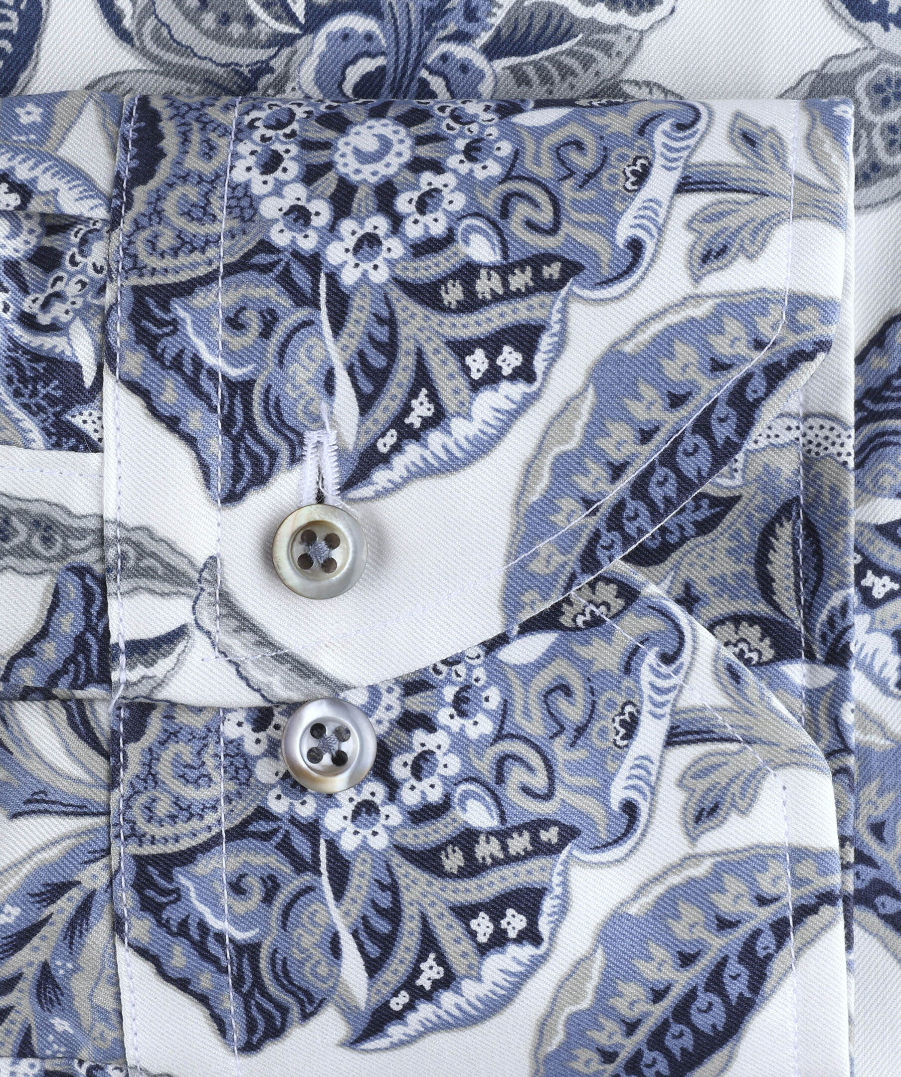 Ljusblå twillskjorta, i fitted body, tillverkad i twofold bomull. Detaljerad med ett blommigt mönster, pärlemorknappar, enkla manchester och en cutaway krage.