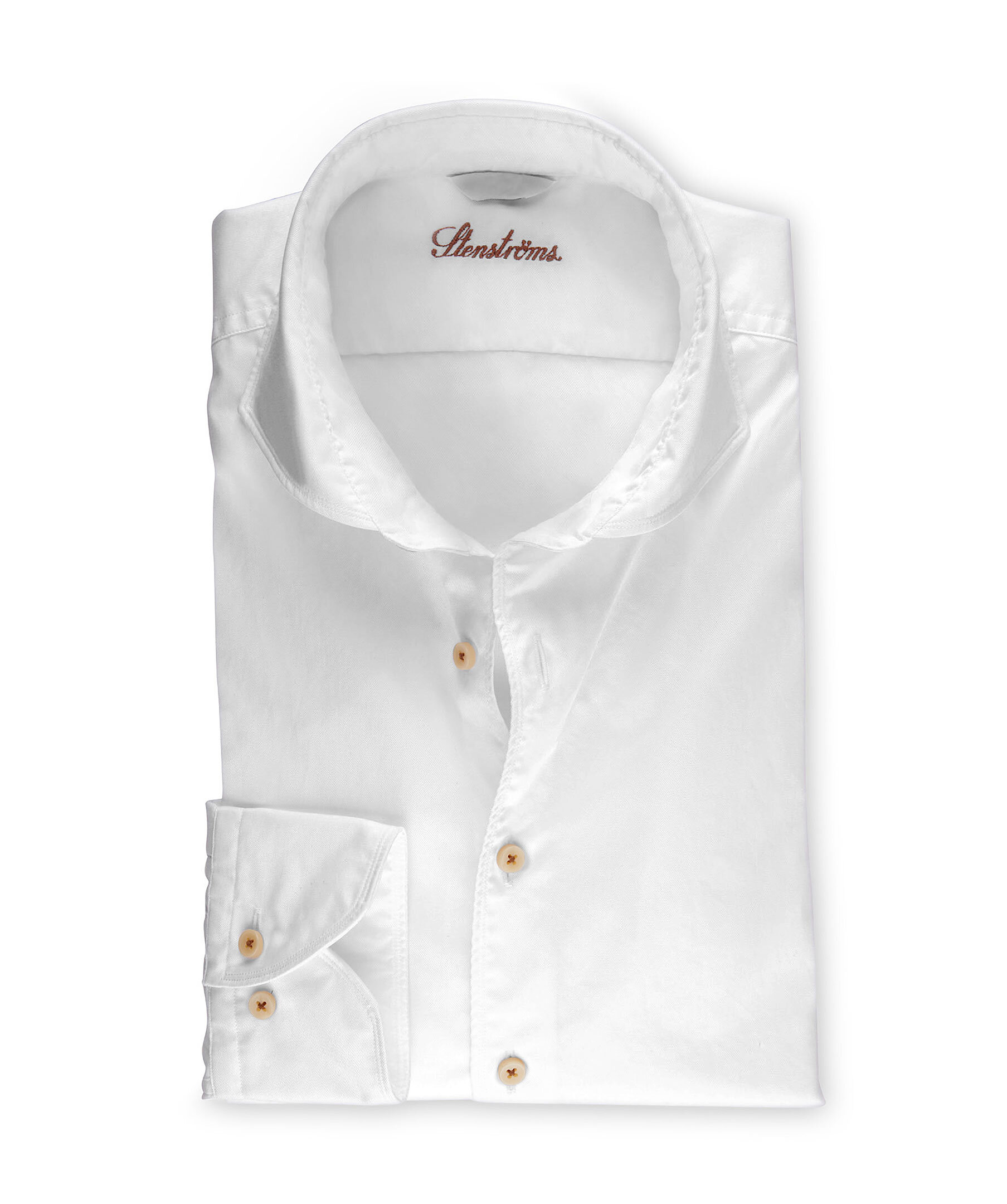 Tvättad casual skjorta i tvättad bomullstwill för en avslappnad stil. Denna klassiska skjorta från Stenströms är en sann vardagshjälte och passar bra till vardags, på kontoret eller på middagsbjudningen. Den har enkla manschetter, cut away krage, en slät knappslå och beige knappar med brun knapptråd. Denna modell har extra långa ärmar och bål.