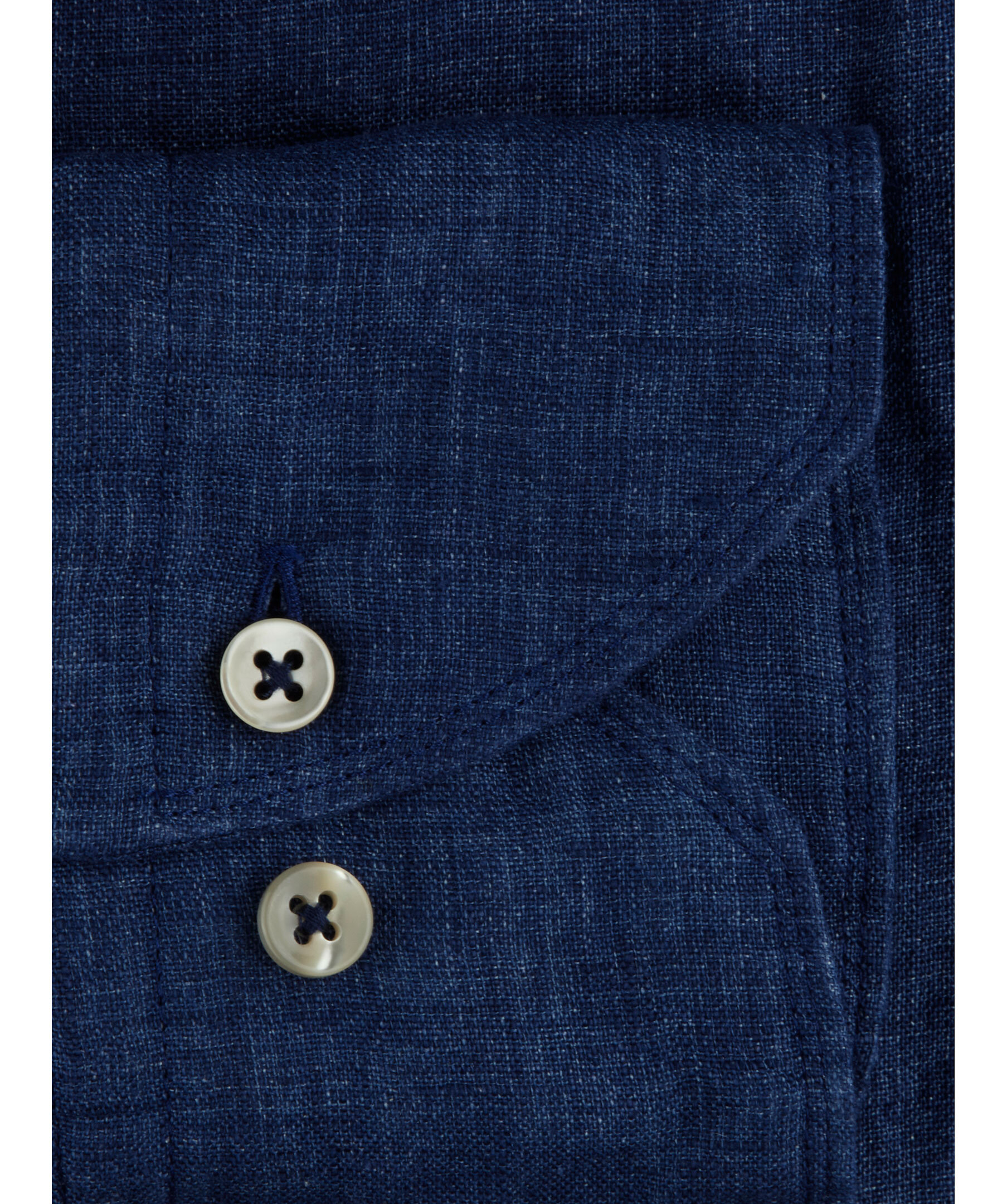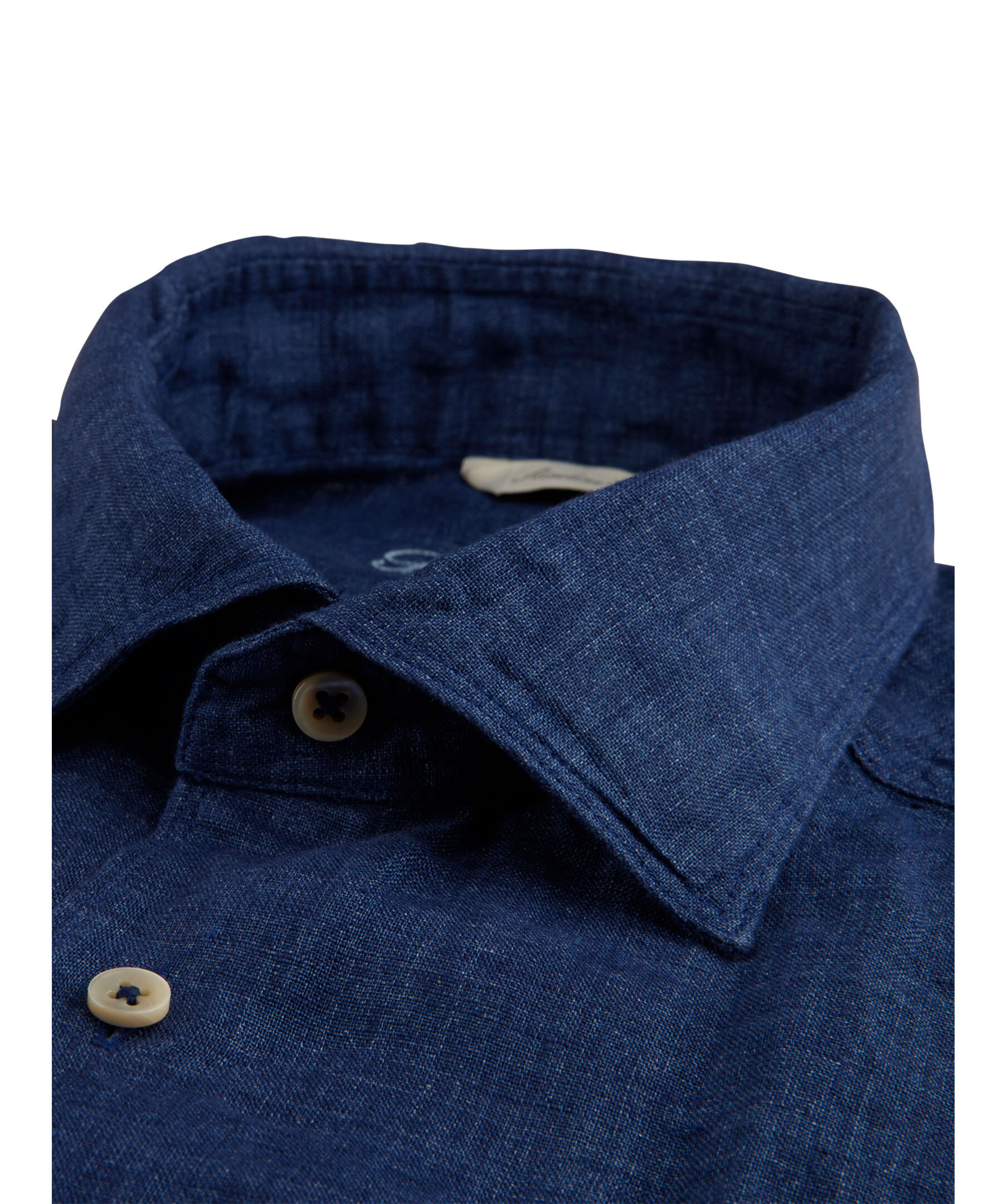 Denna Fitted Body-skjorta är tillverkad av linne och pärlemorknappar, enkla manschetter och en cut away krage.