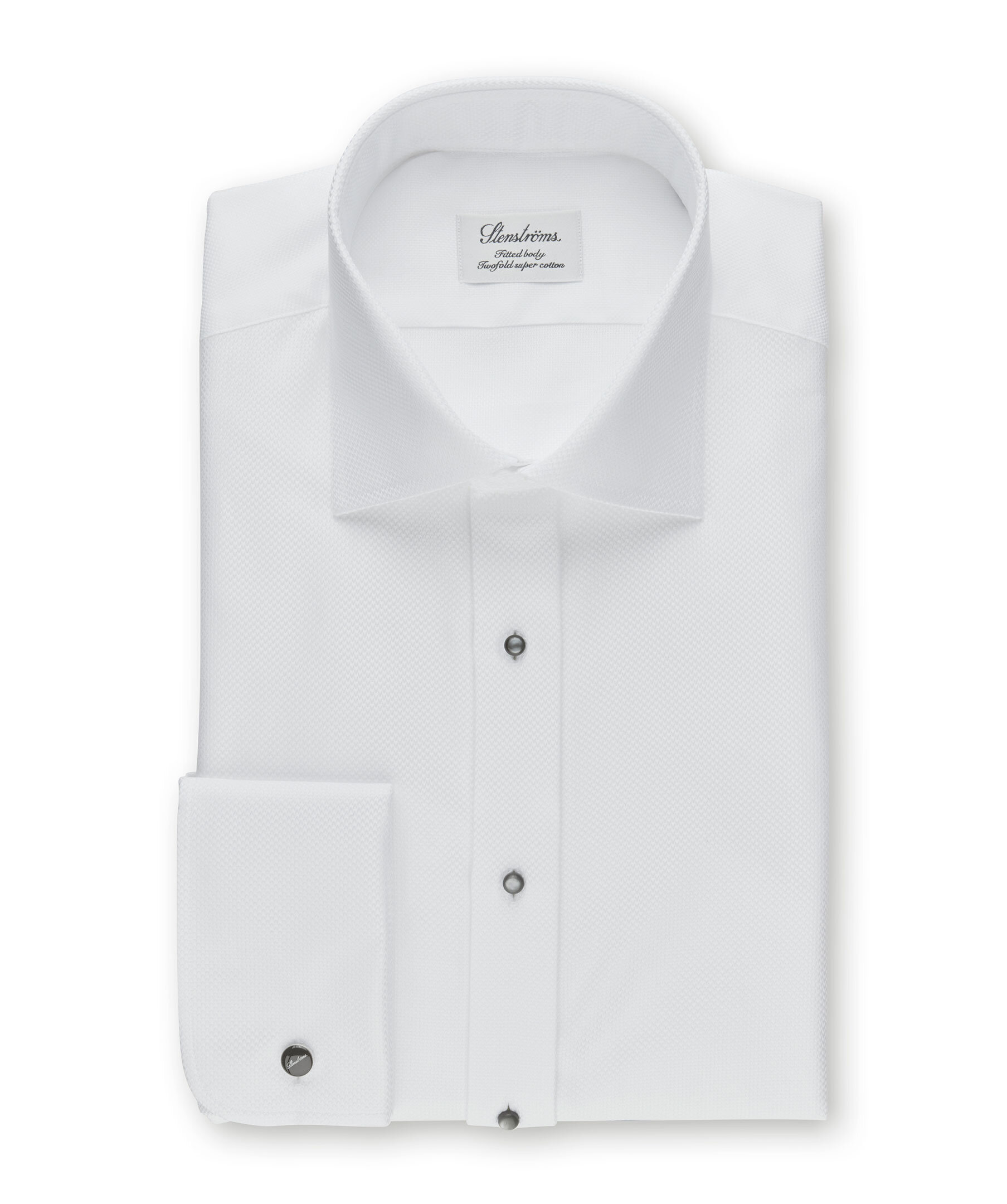 Sofistikerad Evening-skjorta från Stenströms, gjord av textured twill och skuren för en något skräddarsydd passform. Detaljerad med knappslå, 4 hål för studs, dubbla manschetter och en moderate cut away-krage. Den texturerade ytan gör att den är ett fint alternativ till den klassiska vita Evening-skjortan. Kombinera med en fluga och kostym.