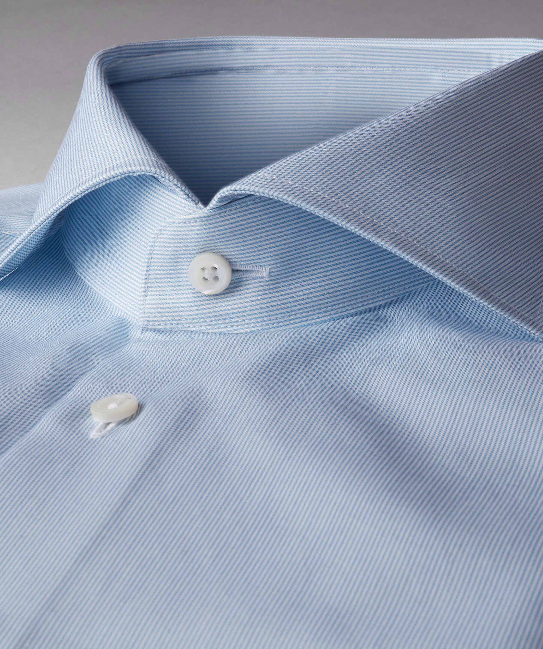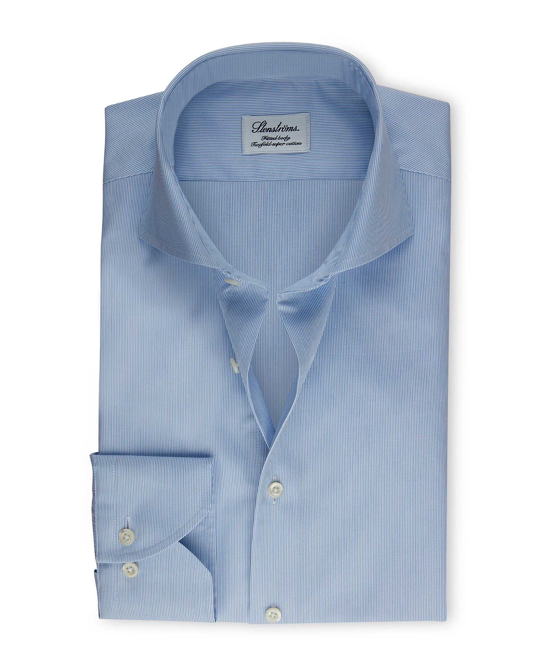 Denna kritstrecksrandiga fitted body skjortan från Stenströms är gjord av mjukt twofold bomull och har en något skräddarsydd midja. Detaljerad med enkla manschetter, pärlemoknappar och cut away krage. Vi gillar den bäst till ett par kostymbyxor.