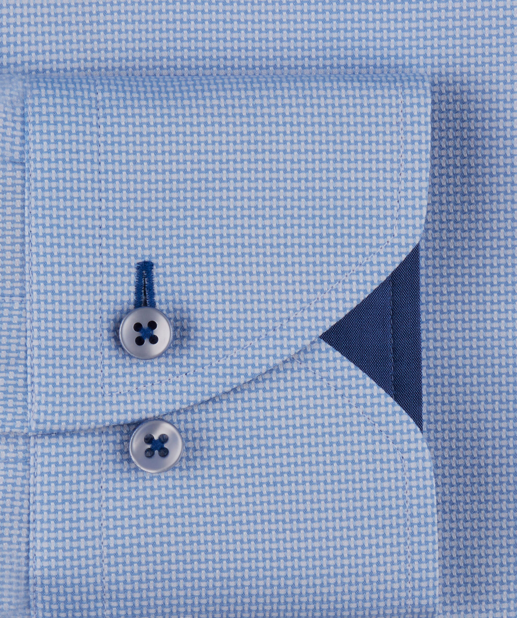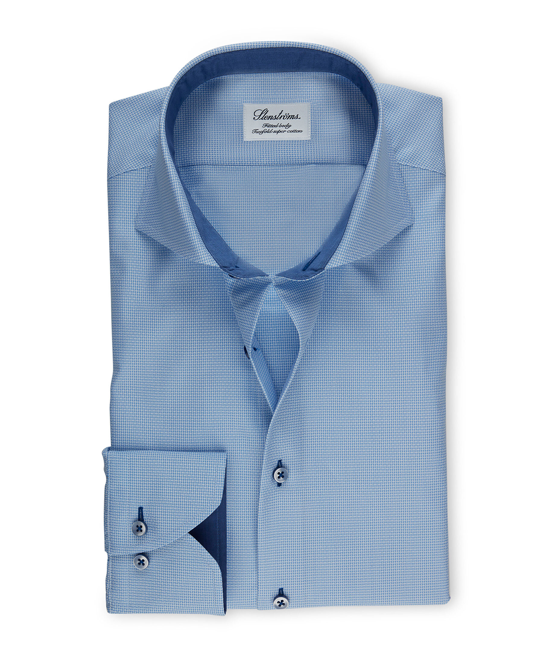 Denna ljusblåa fitted body skjorta från Stenströms har en något skräddarsydd midja och är gjord av mjuk twofold bomull. Småmönstrat ger en känsla av att skjortan är enfärgad, men med det där lilla extra. Skjortan är detaljerad med kontraster i kragen och manschetten i marinblått, enkla manschetter, skinande ljusblåa knappar och har en cut away krage.