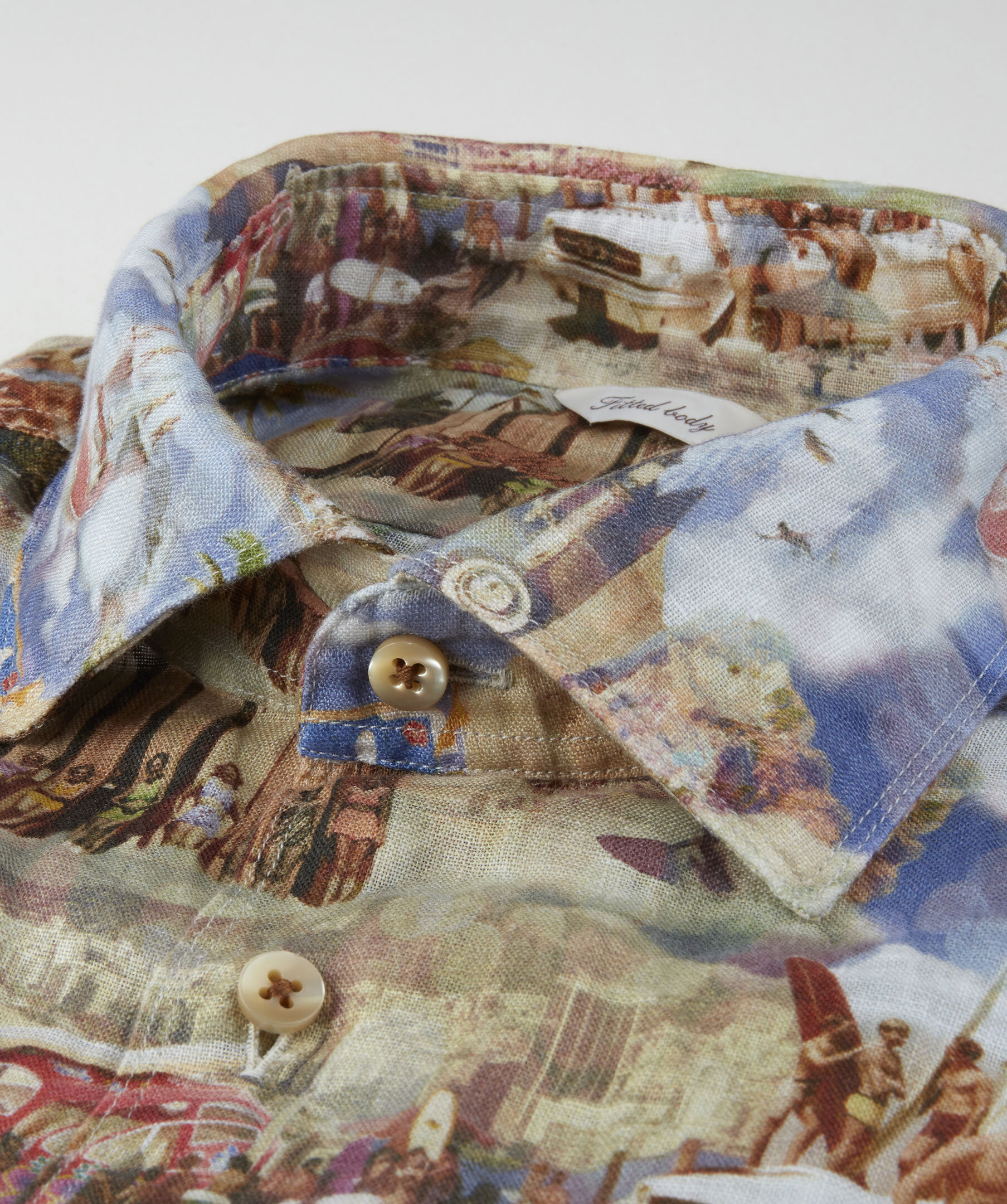 Ljusbrun skjorta, i fitted body, tillverkad av 100% linne. Detaljerad med ett mönster, pärlemorknappar, enkla manschetter och en cutaway krage.