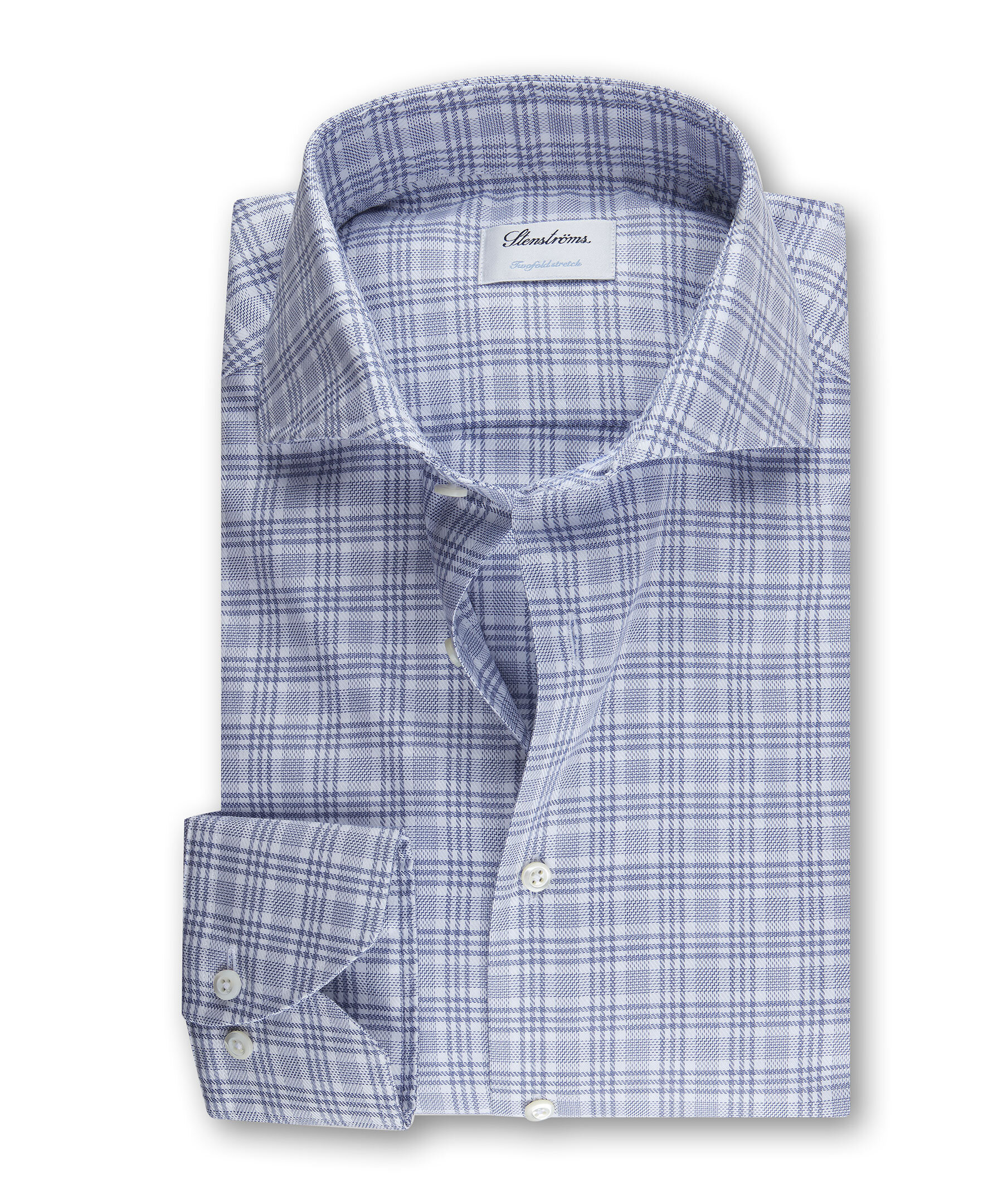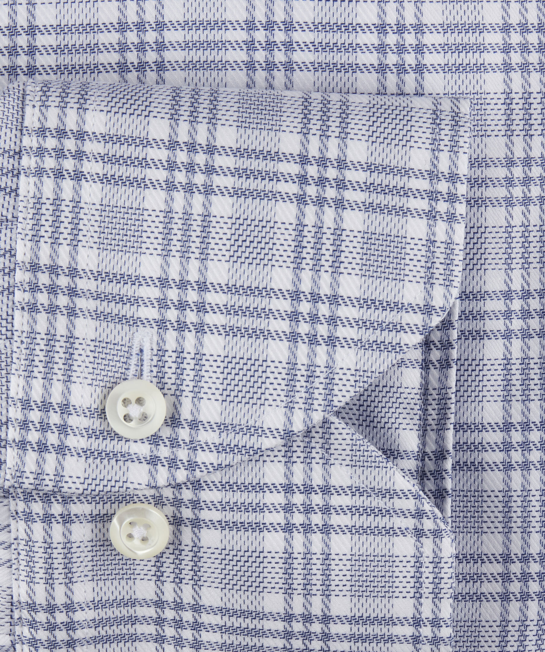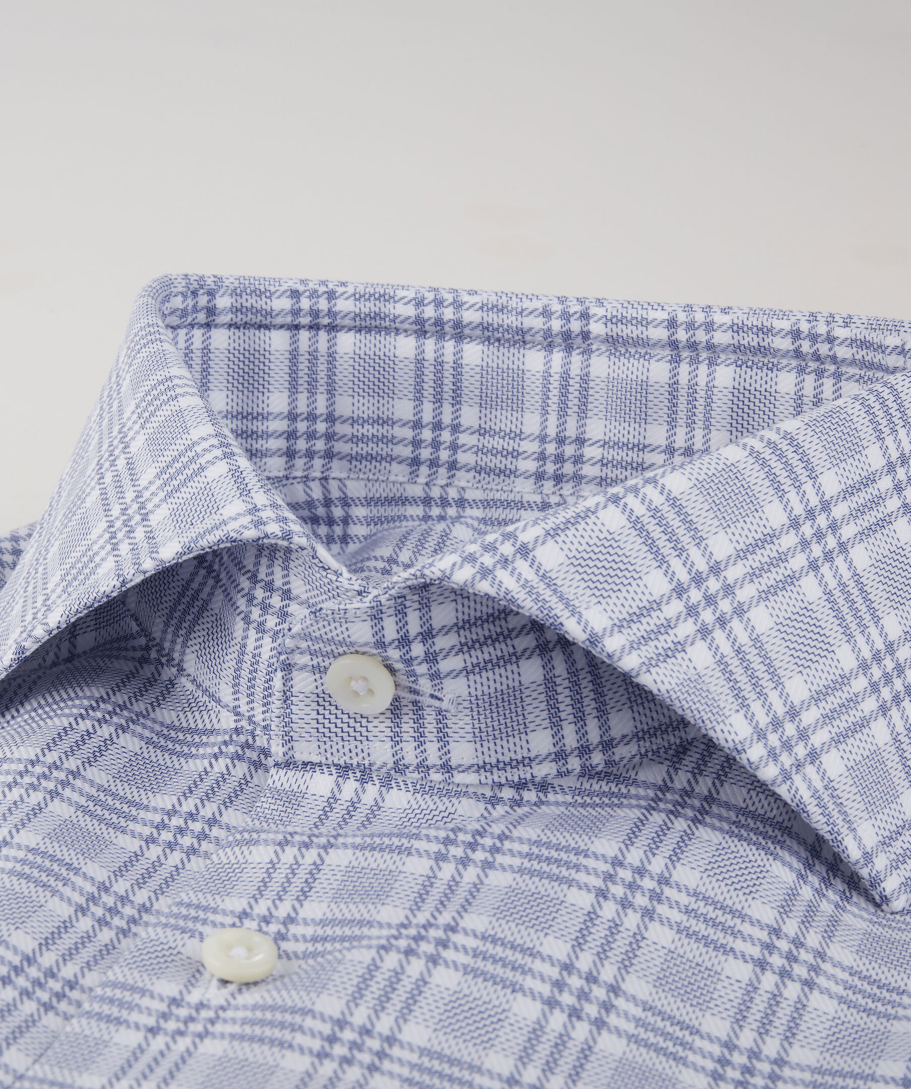 Blå fitted body skjorta i bomull. Skjortan är detaljerad med ett rutigt mönster, enkla manschetter, pärlemorknappar och en cut away krage.