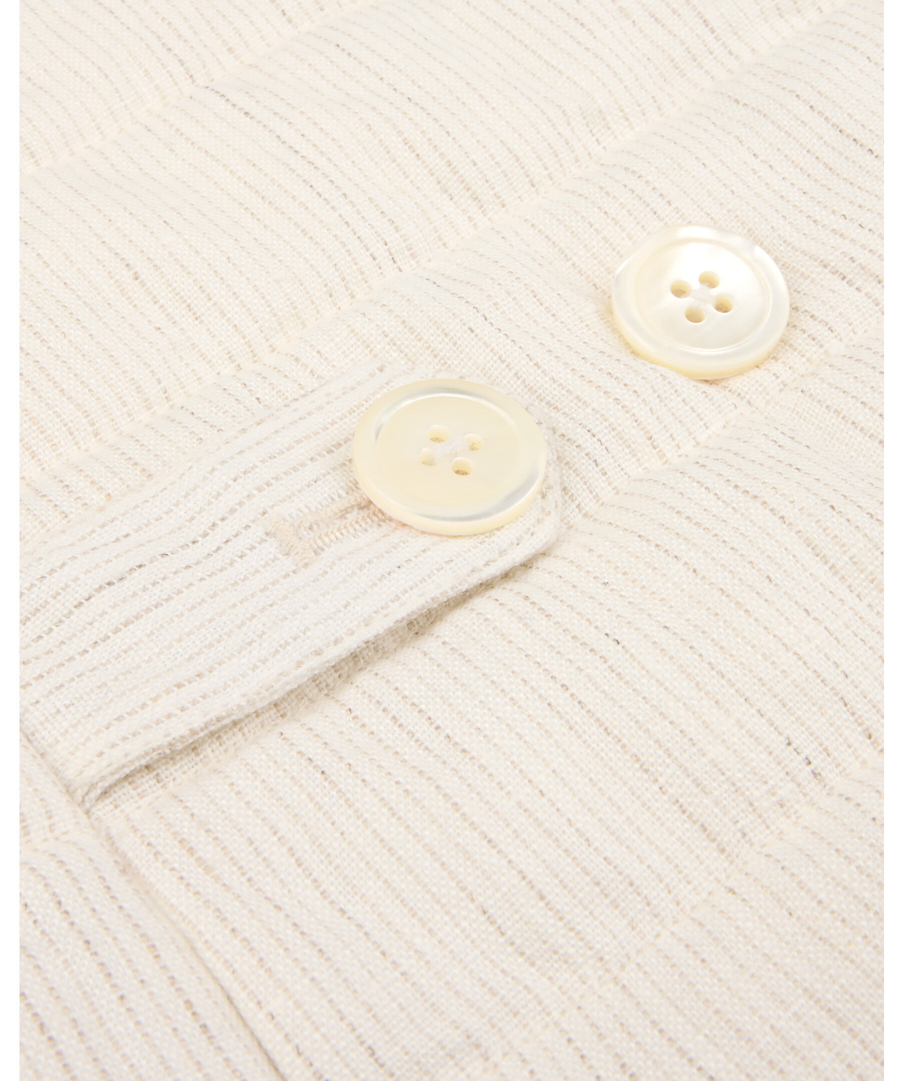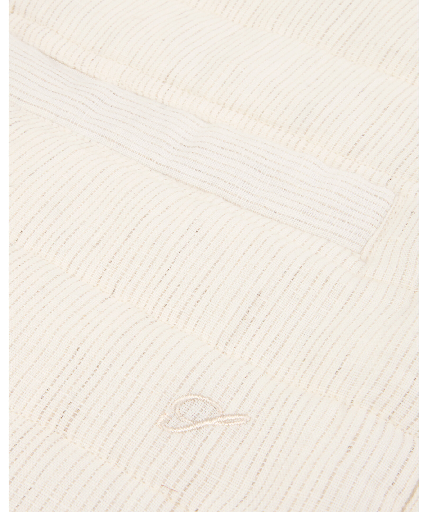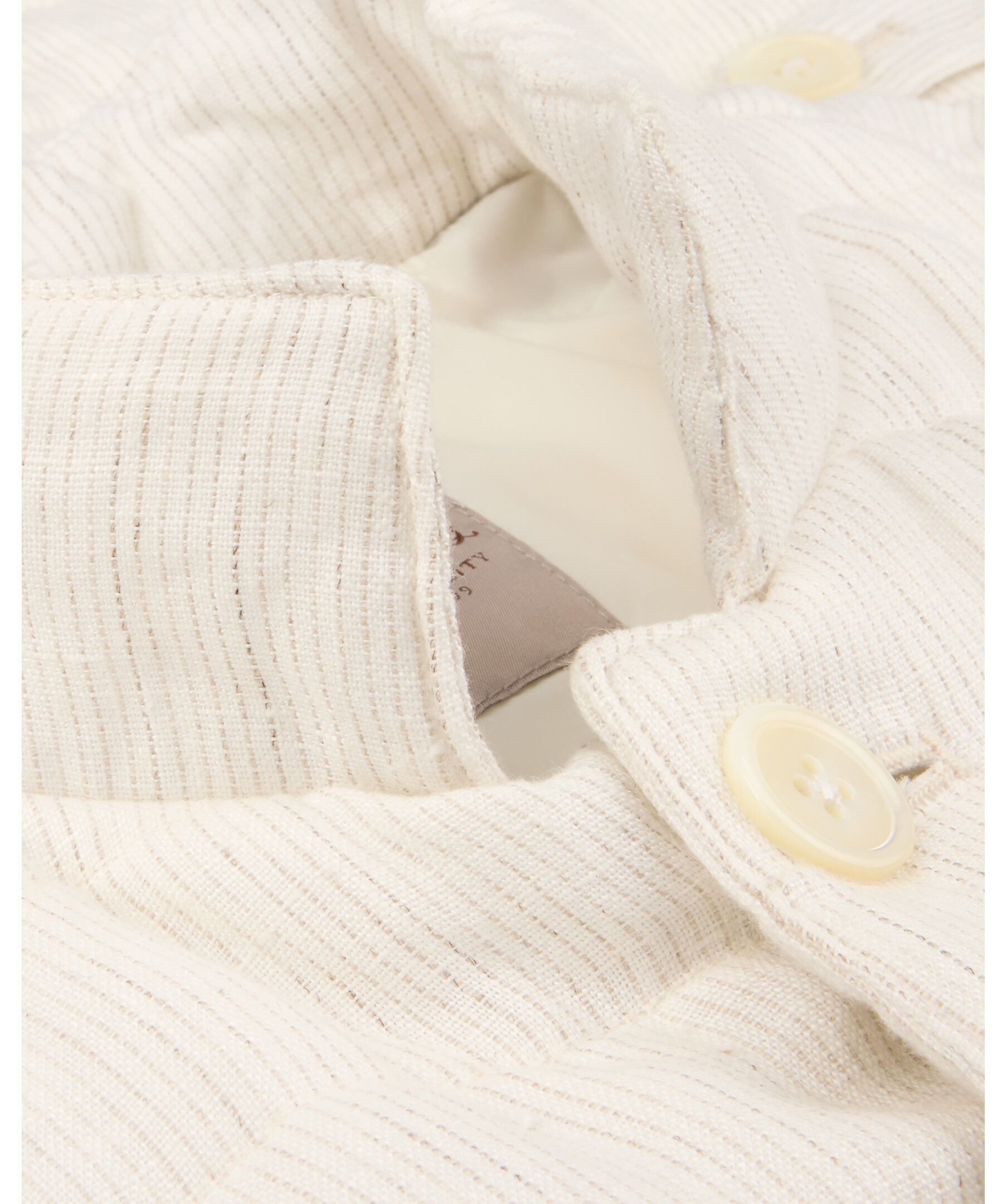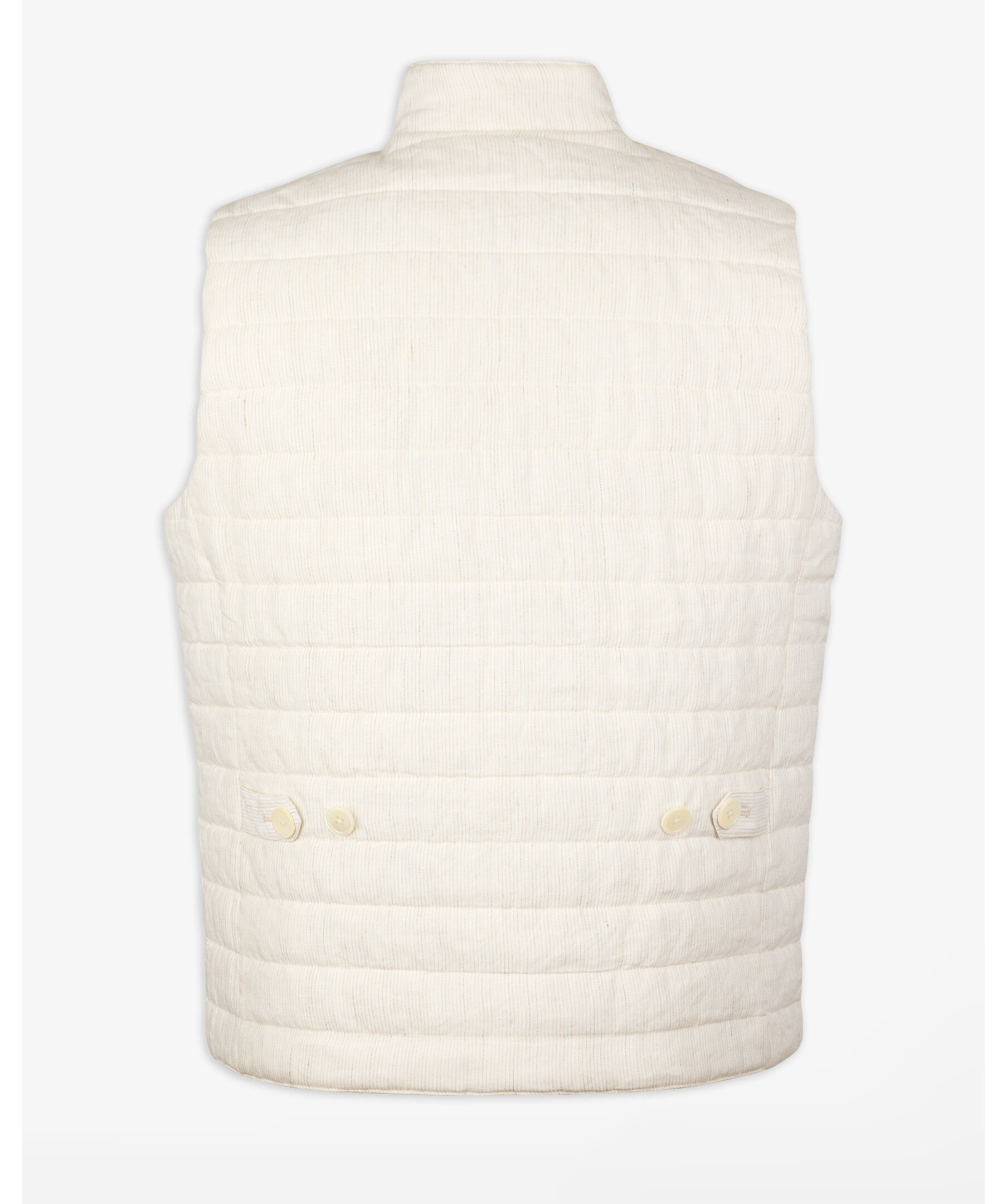 Vit väst tillverkad av polyester och är lätt vadderad. Västen har pärlemorknappar, ståkrage och tre fickor framtill.