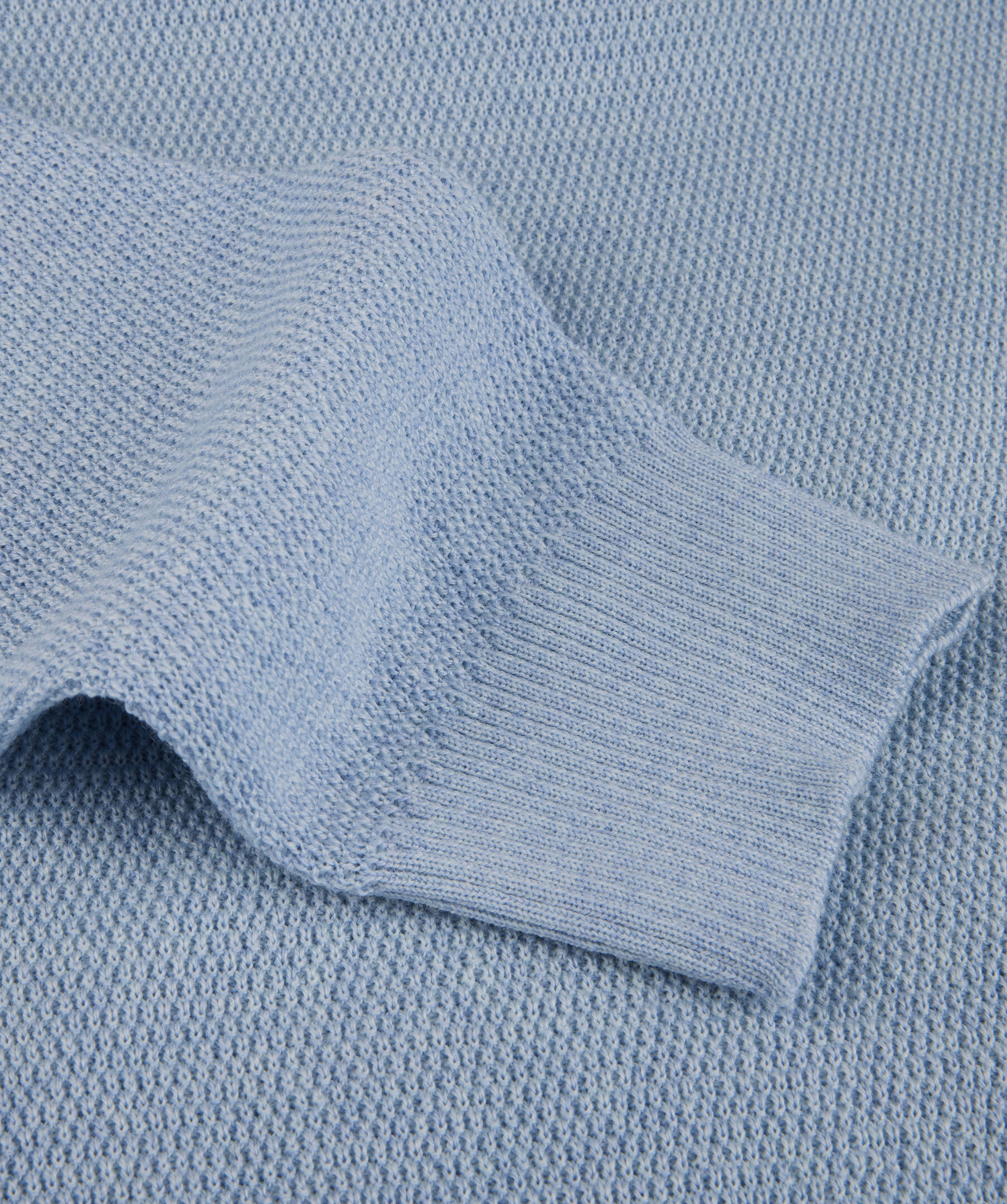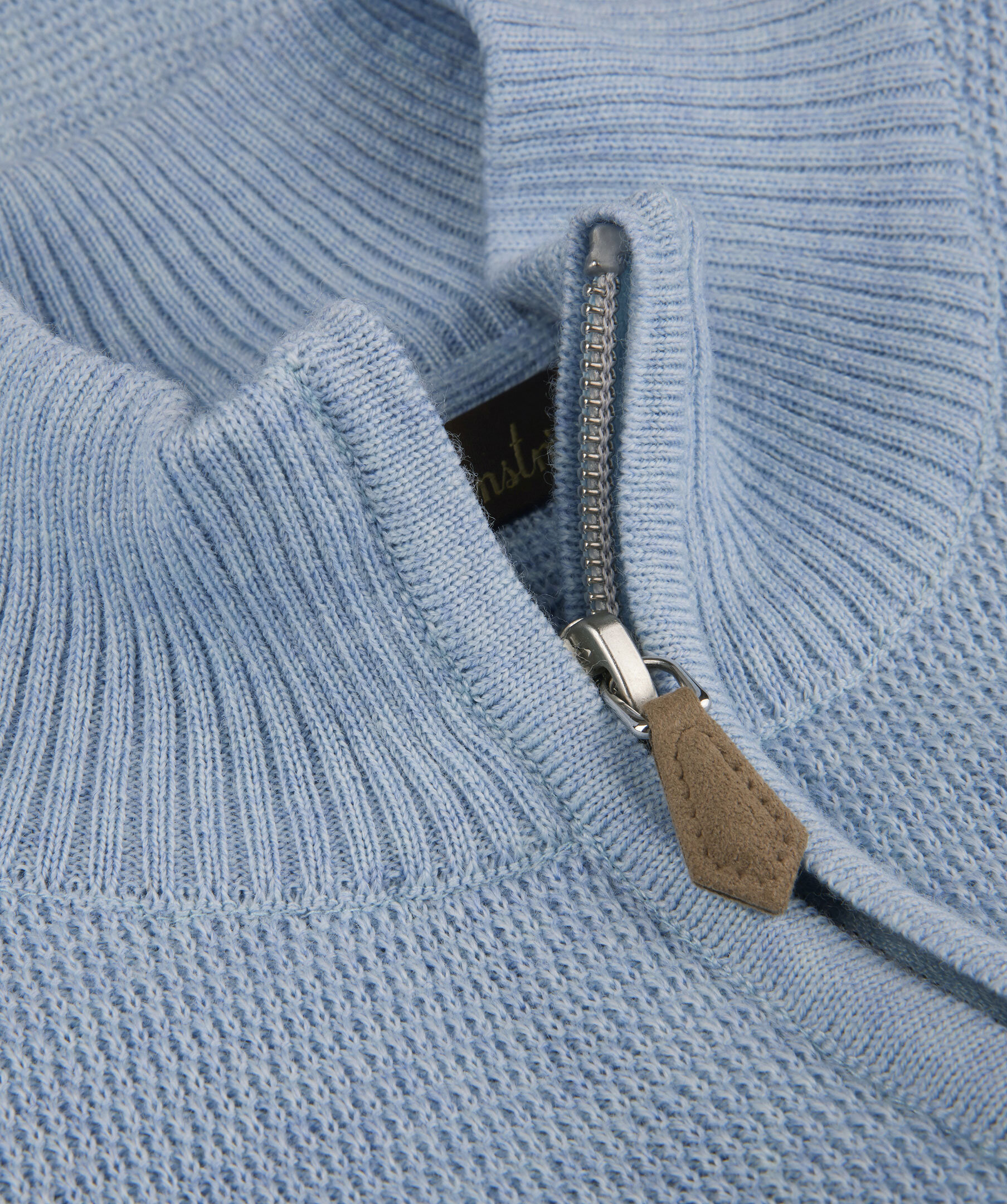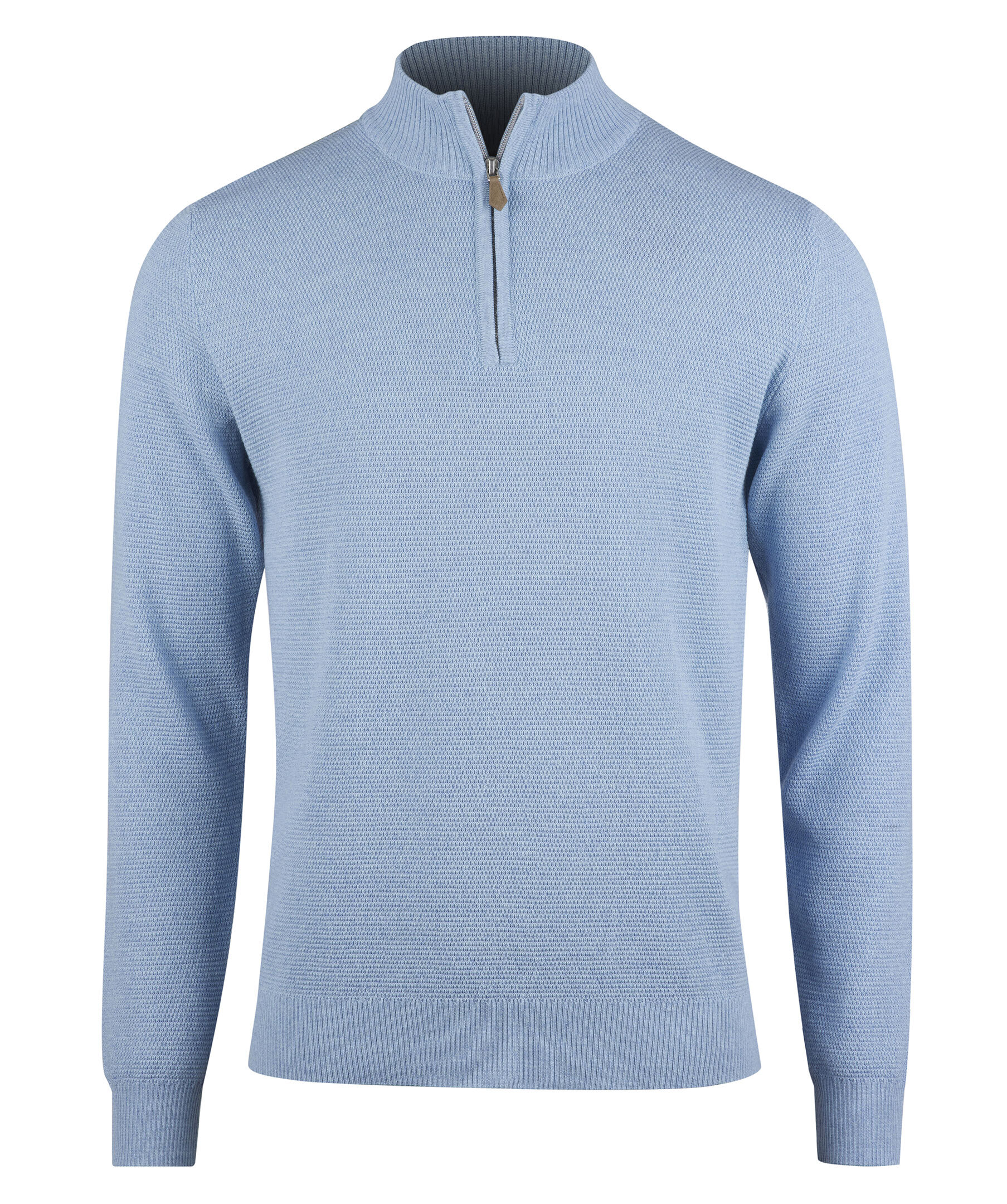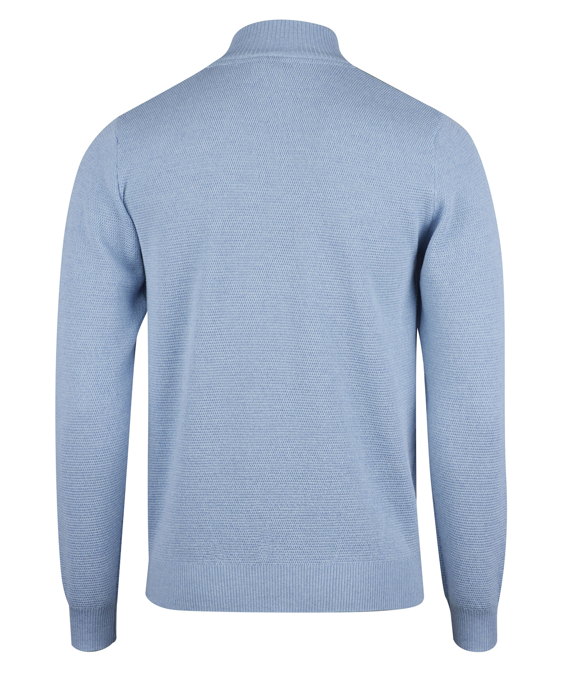 Ljusblå half zip tröja, tillverkad i merino ull. Tröjan är strukturstickad samt designad med ribbstickade detaljer vid ärmslut, krage och fåll.